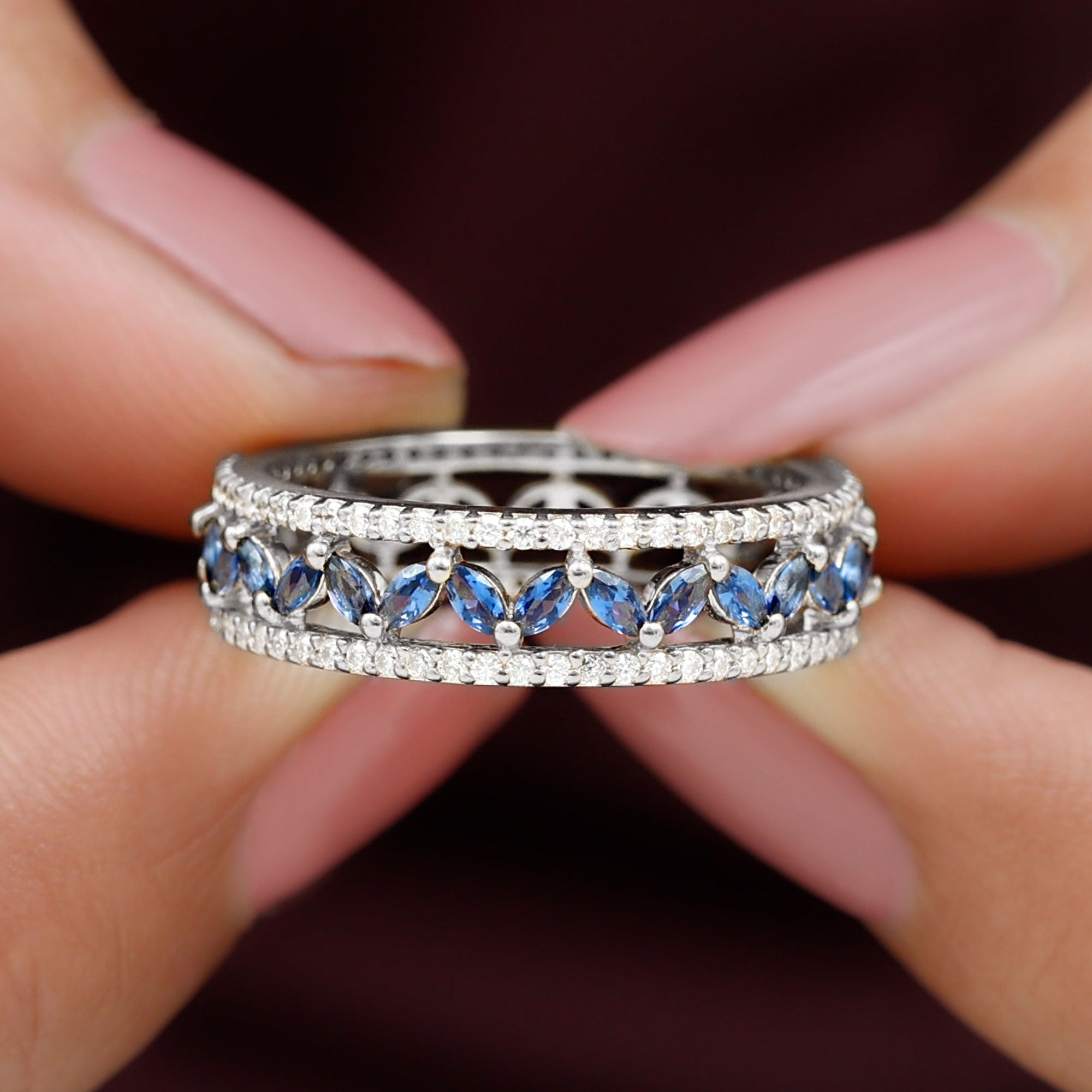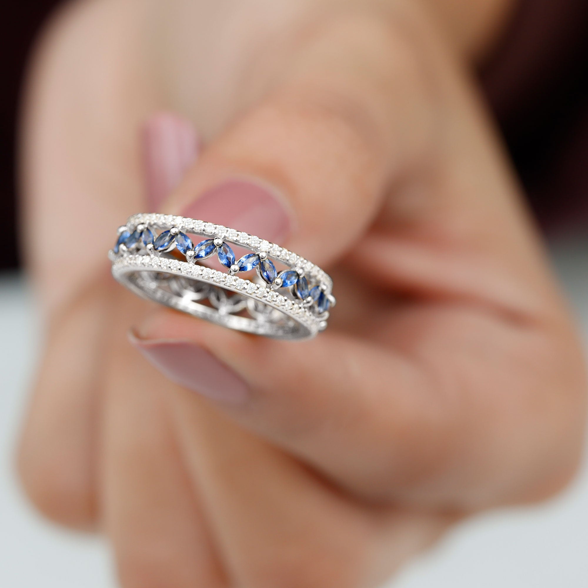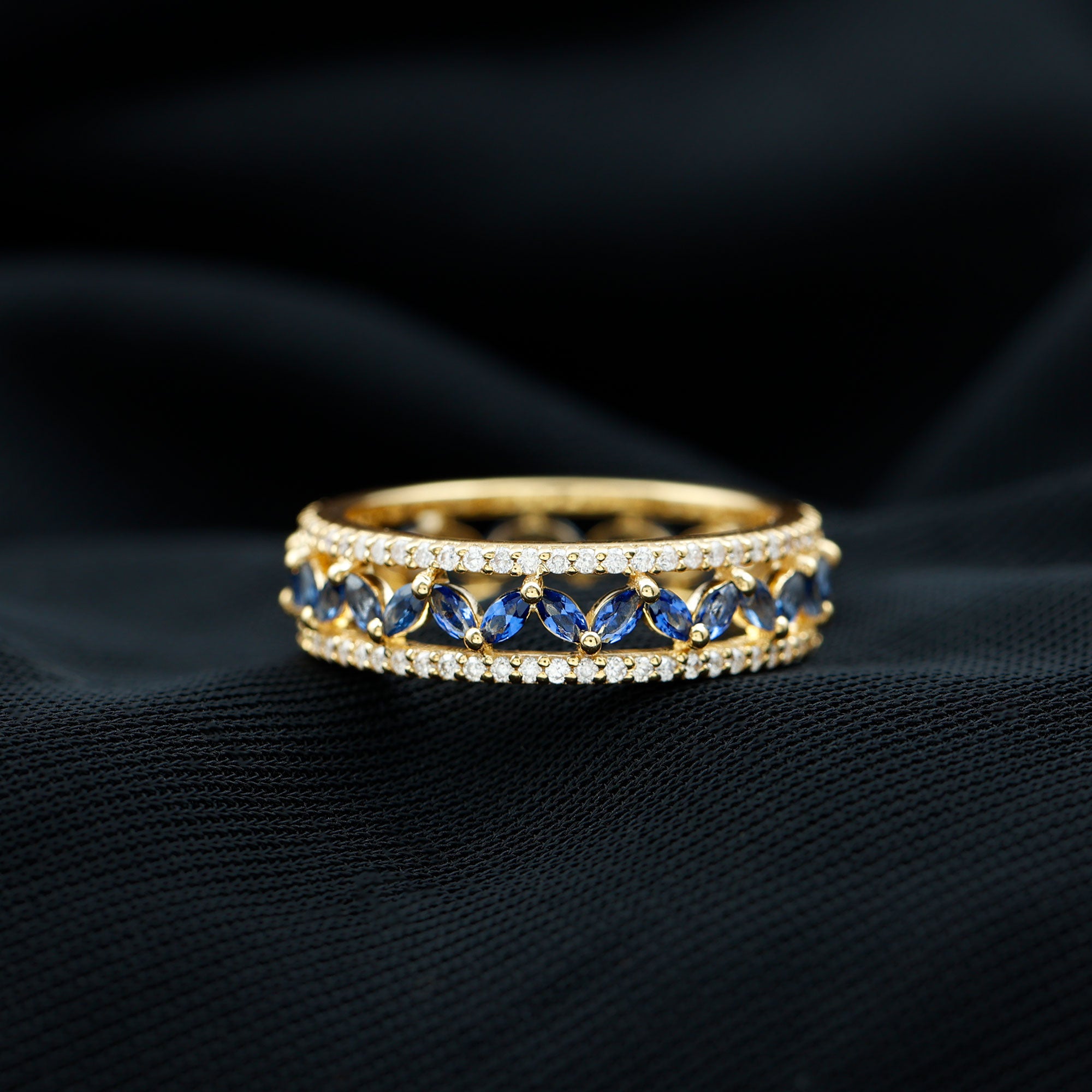 An Elegant Wedding Band Ring embellished with Marquise Cut Created Blue Sapphire set in a Prong Setting and round shape Diamond set in a Pave Setting. This Gold Band Ring is Composed of Solid Gold.