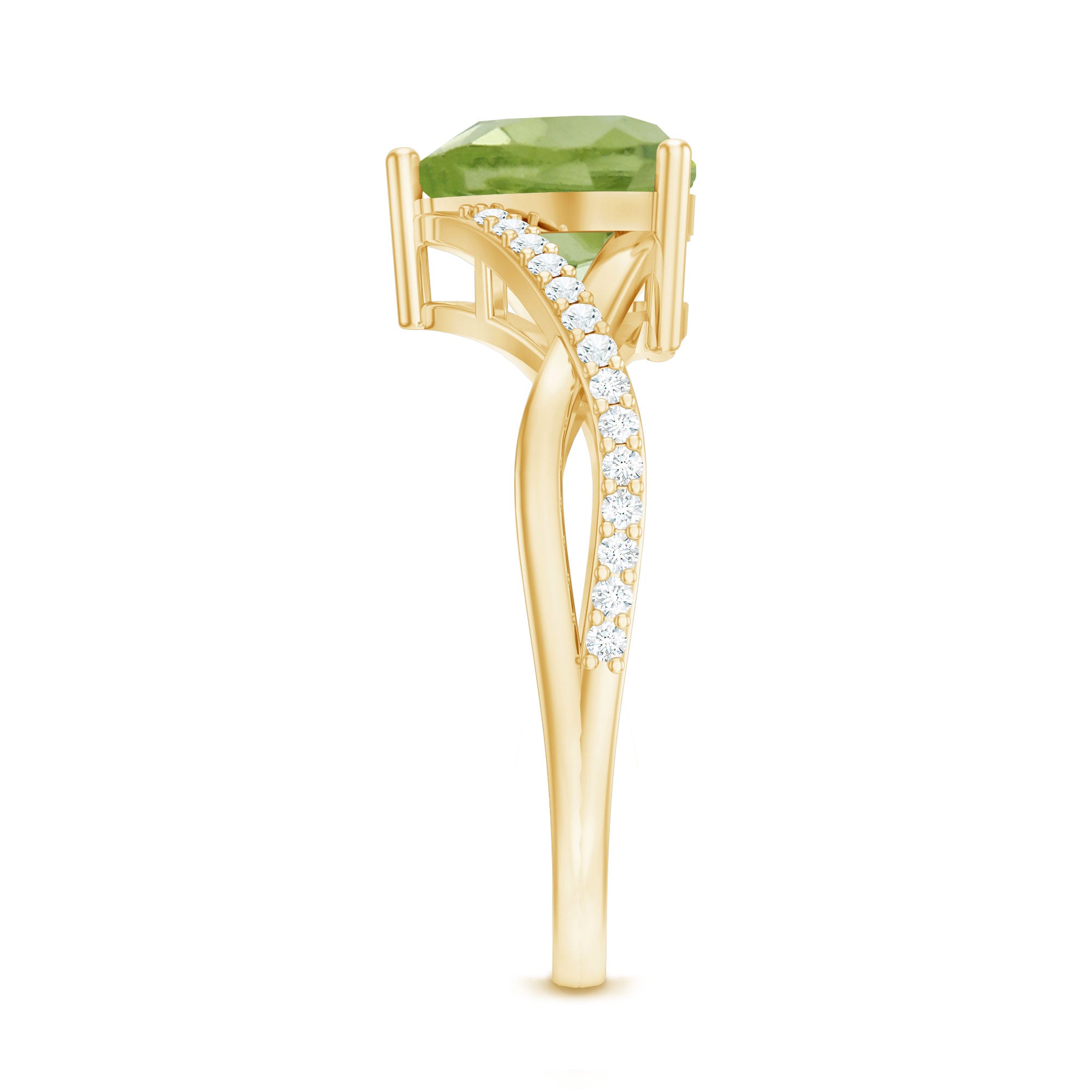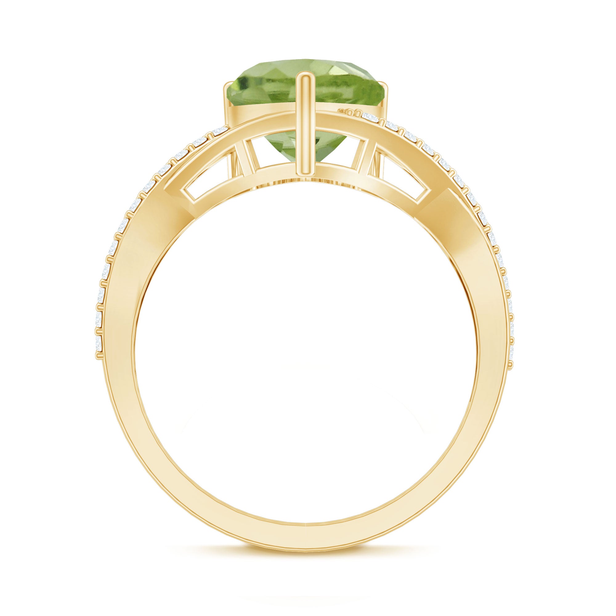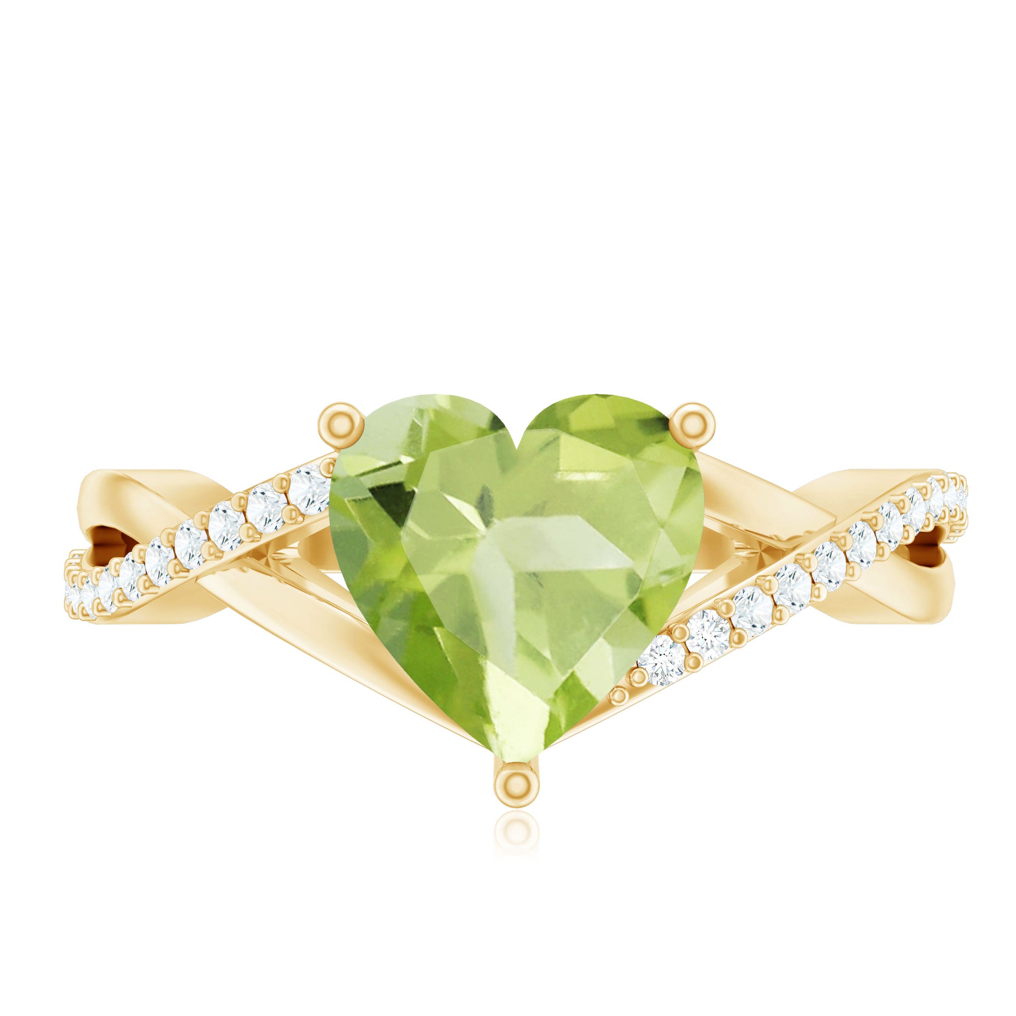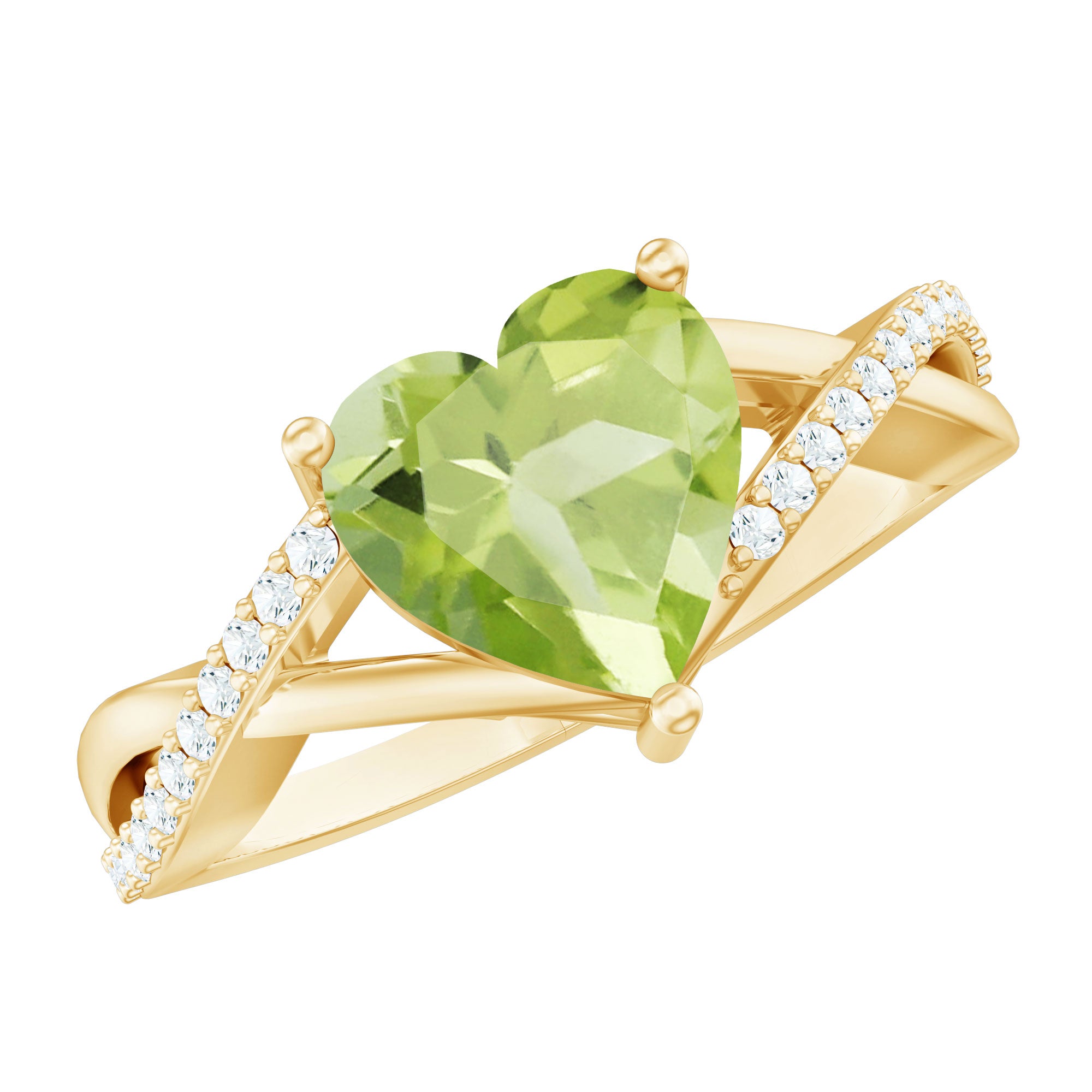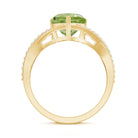 Make the moment unforgettable with this stunning Heart Shape Ring embellished with Heart Shape Peridot in a Prong Setting while shimmering Round Shape Diamond Stone are studded over the fascinating Crossover Shank. This Peridot Heart Ring will be a perfect choice for your lady love and will make her fall in love with you. This Peridot and Diamond Ring is crafted with Gold.