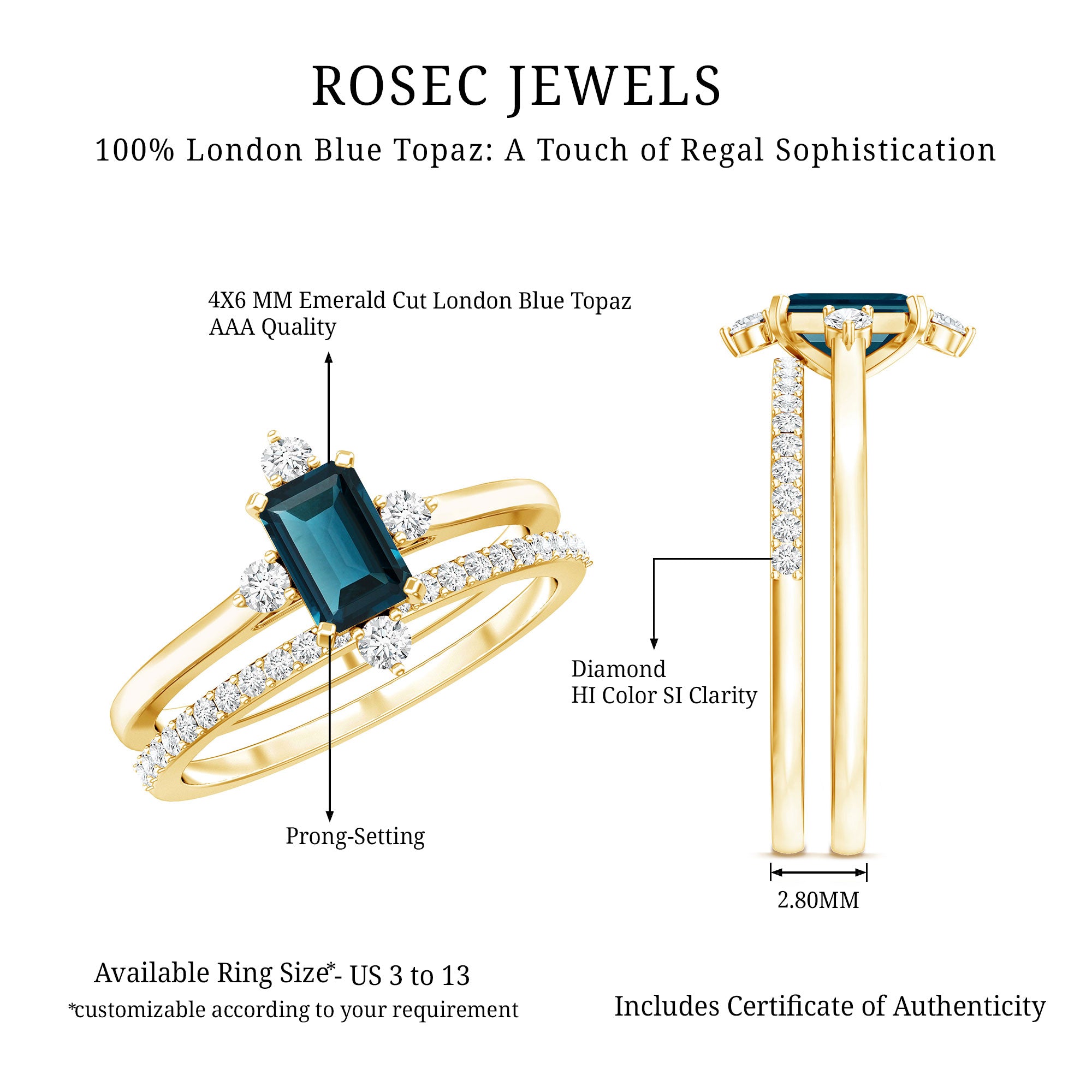 Mark a meaningful chapter in your love story with this beautifully designed Blue Topaz Wedding Ring Set, crafted to reflect elegance, strength, and connection. At the heart of the engagement ring is a 4X6 MM emerald cut London Blue Topaz, held securely in a prong setting. The engagement ring is accented with sparkling round diamonds, offering a delicate contrast that enhances the center stone. Paired with this is a matching wedding band, designed to align perfectly and sit beside the engagement ring. The band features a row of round diamonds, adding extra brilliance and tying both pieces together in harmony. Whether worn as a Bridal Wedding Ring Set or separately, each ring carries its own charm and elegance. The sleek, stackable design ensures everyday comfort while maintaining a refined, graceful look. Crafted with AAA quality london blue topaz and HI-SI quality diamonds, the stones are hand-selected for their brilliance and quality. Available in US sizes 3 to 13, the London Blue Topaz Ring Set is made to fit comfortably and last through every moment. This piece comes packaged in an elegant jewelry box and includes a certificate of authenticity for added confidence. Timeless and modern all at once, this Engagement Ring with Wedding Band Set is a beautiful reminder of the bond you share and the future you are building together.