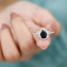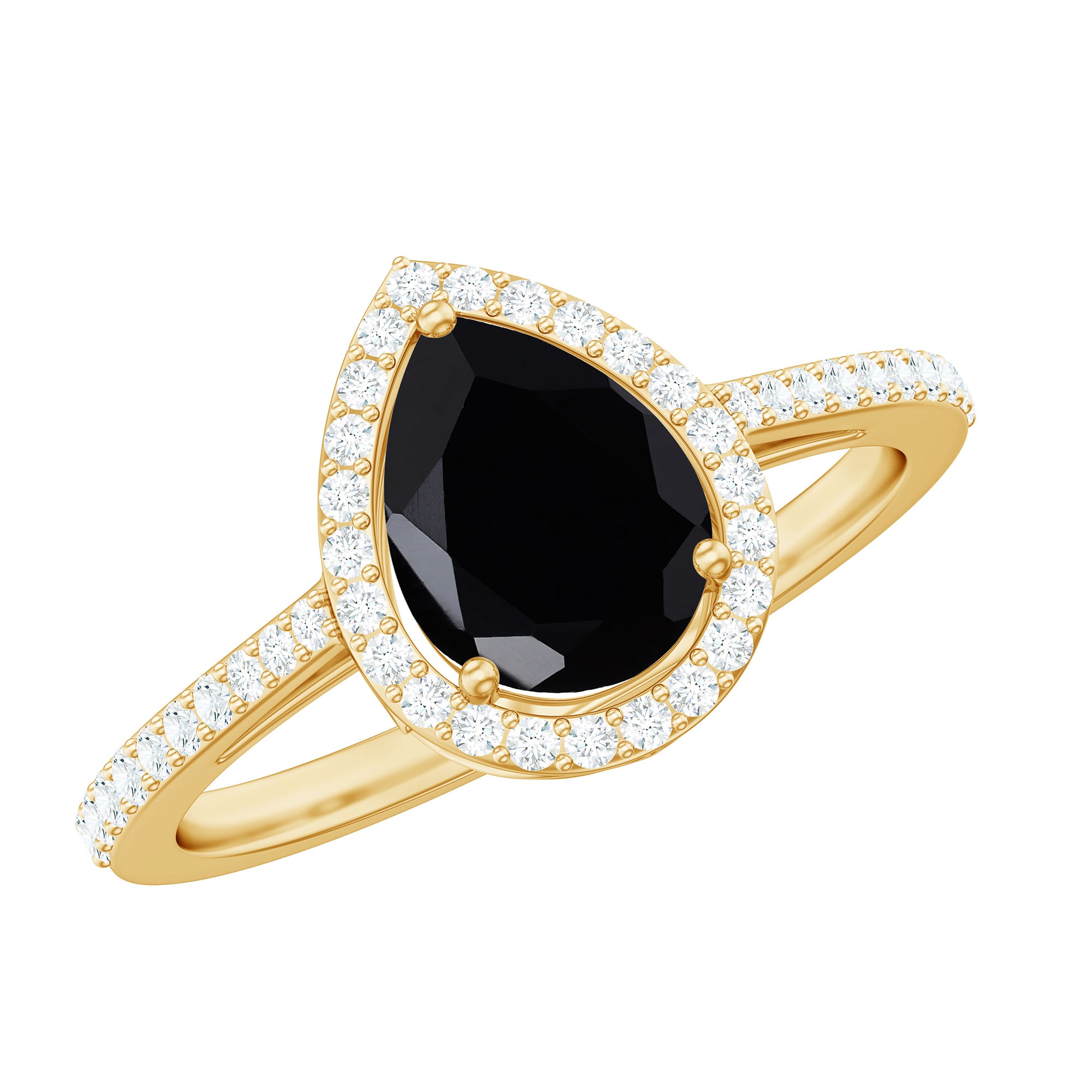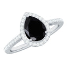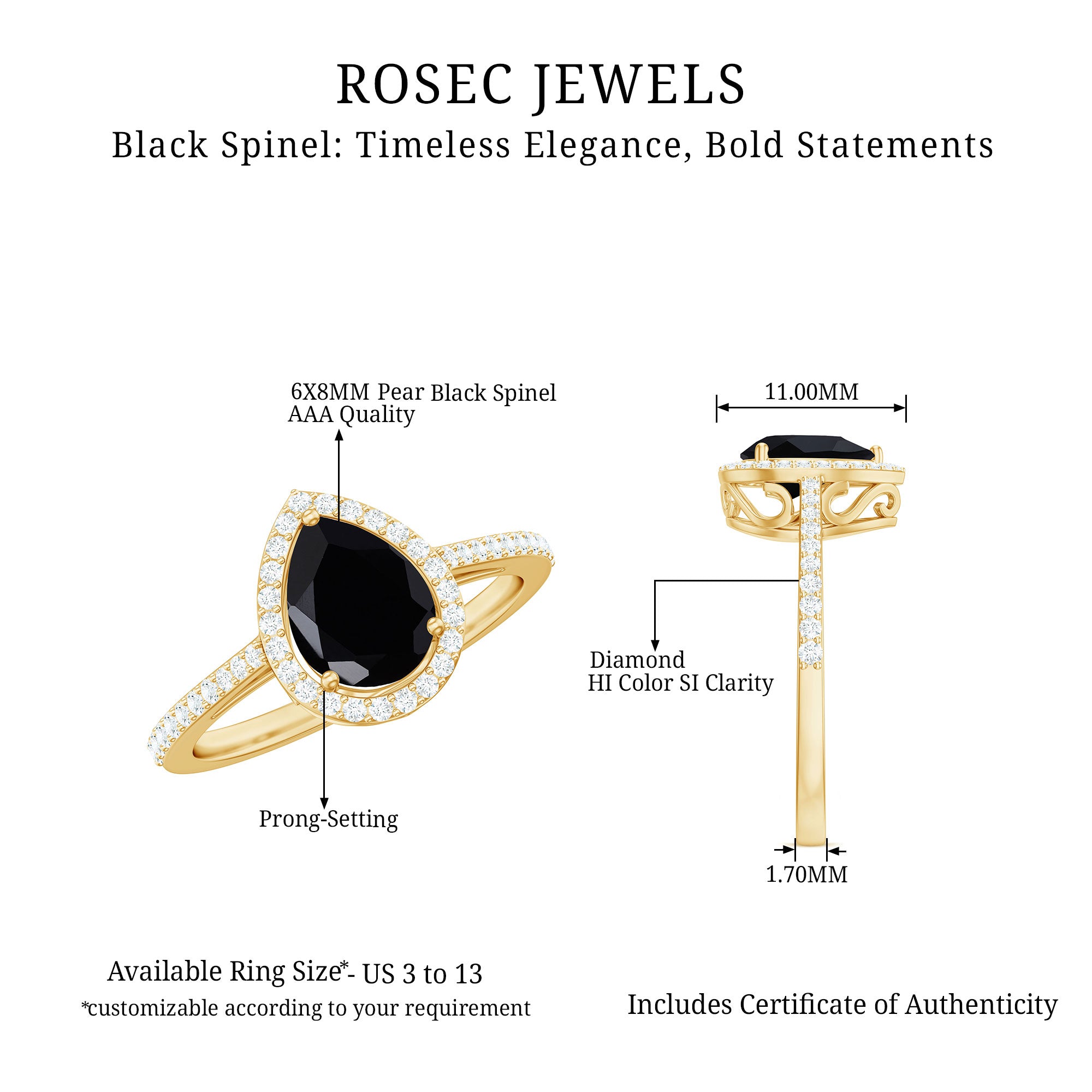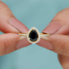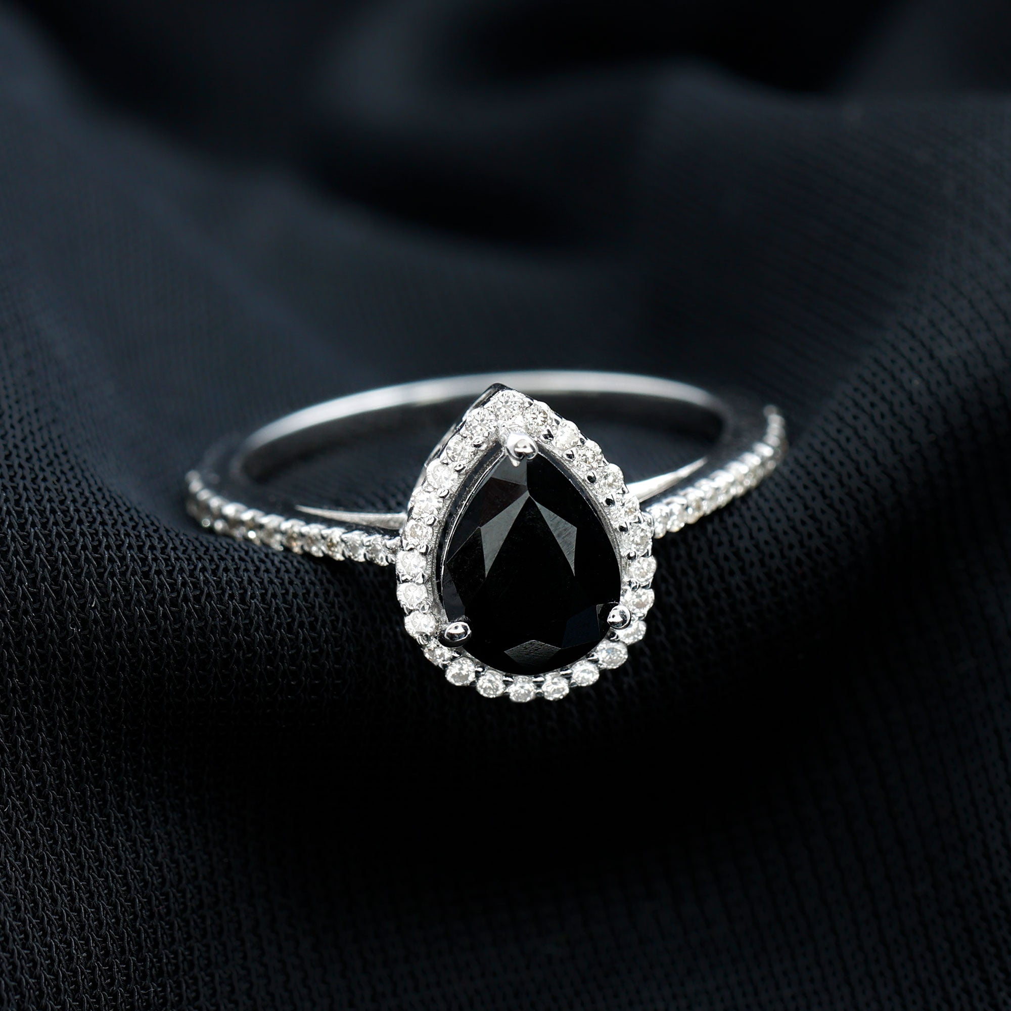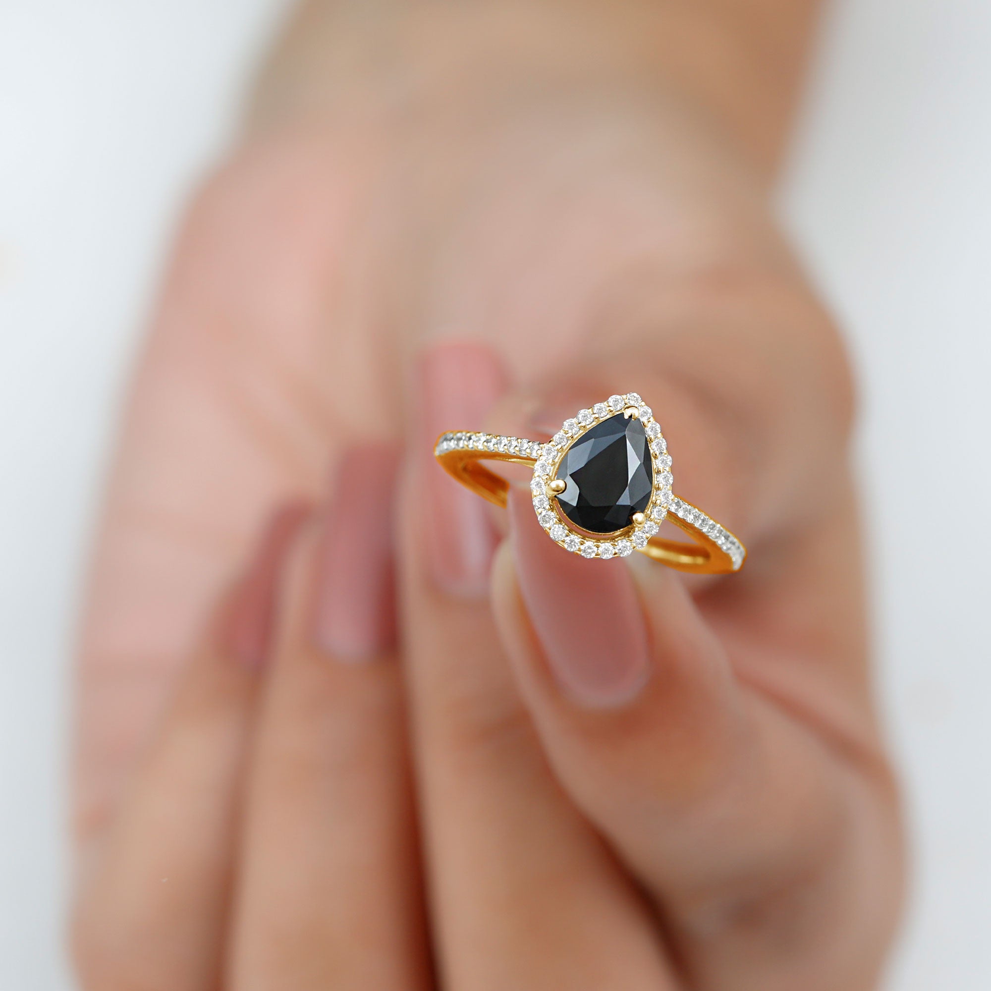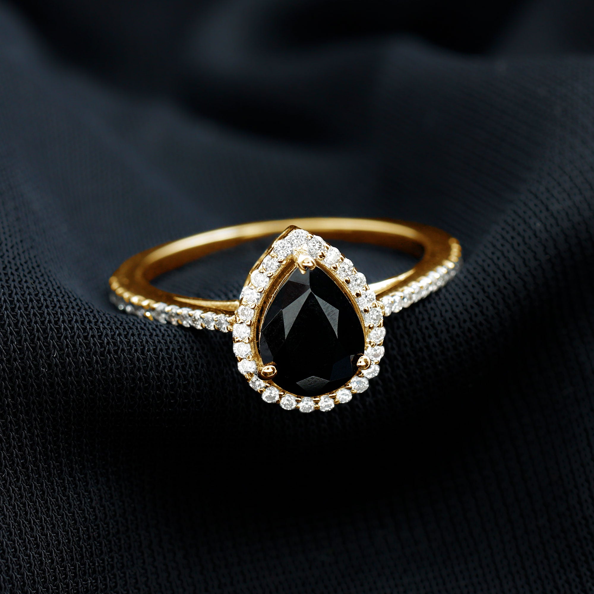 A stunning and timeless Teardrop Engagement Ring with a beautiful design would make a wonderful gift for your significant other. This understated yet elegant engagement ring features a Pear Cut Black Spinel at the center, surrounded by a Halo of Round Diamond stones and Side Stones. The Black Spinel Engagement Ring is crafted with Gold Metal for a luxurious finish.
