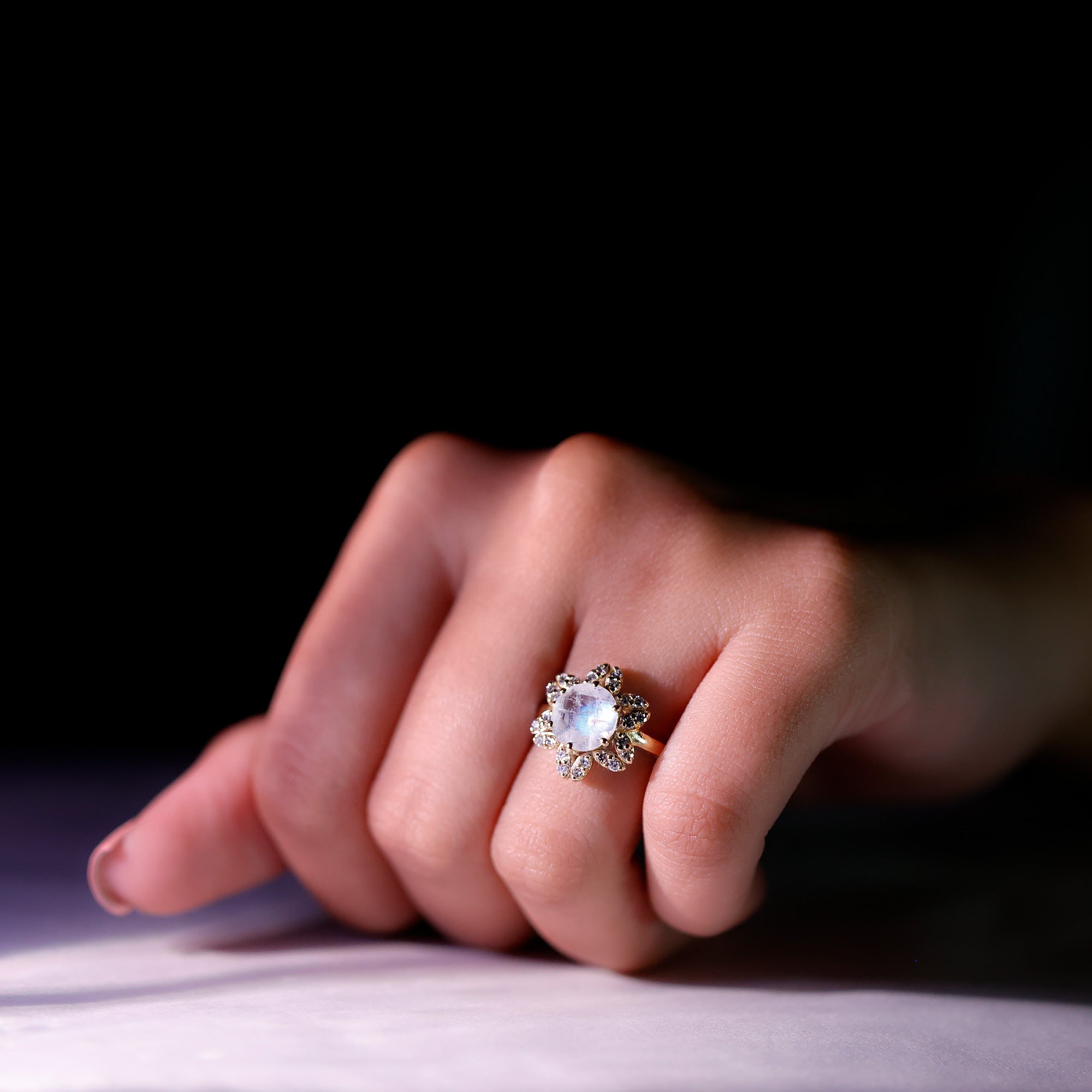 Ask for her hand with this enchanting Flower Engagement Ring. Fashioned in Gold, this brilliant style features a Round Moonstone center stone bordered with a Flower-Shaped frame of smaller accent Diamond.