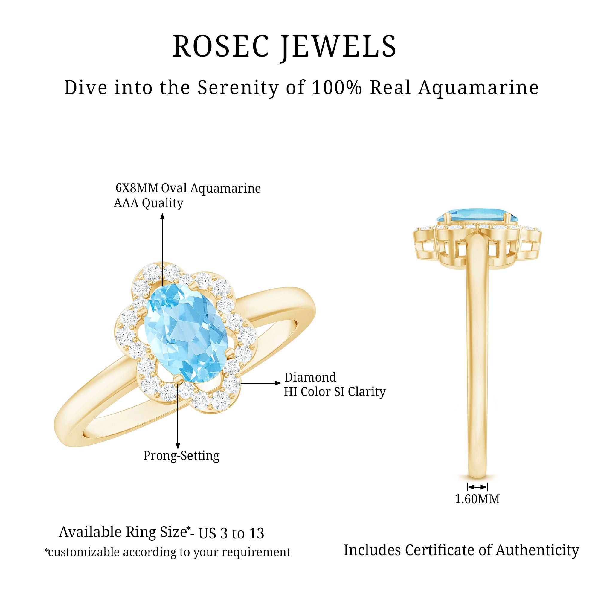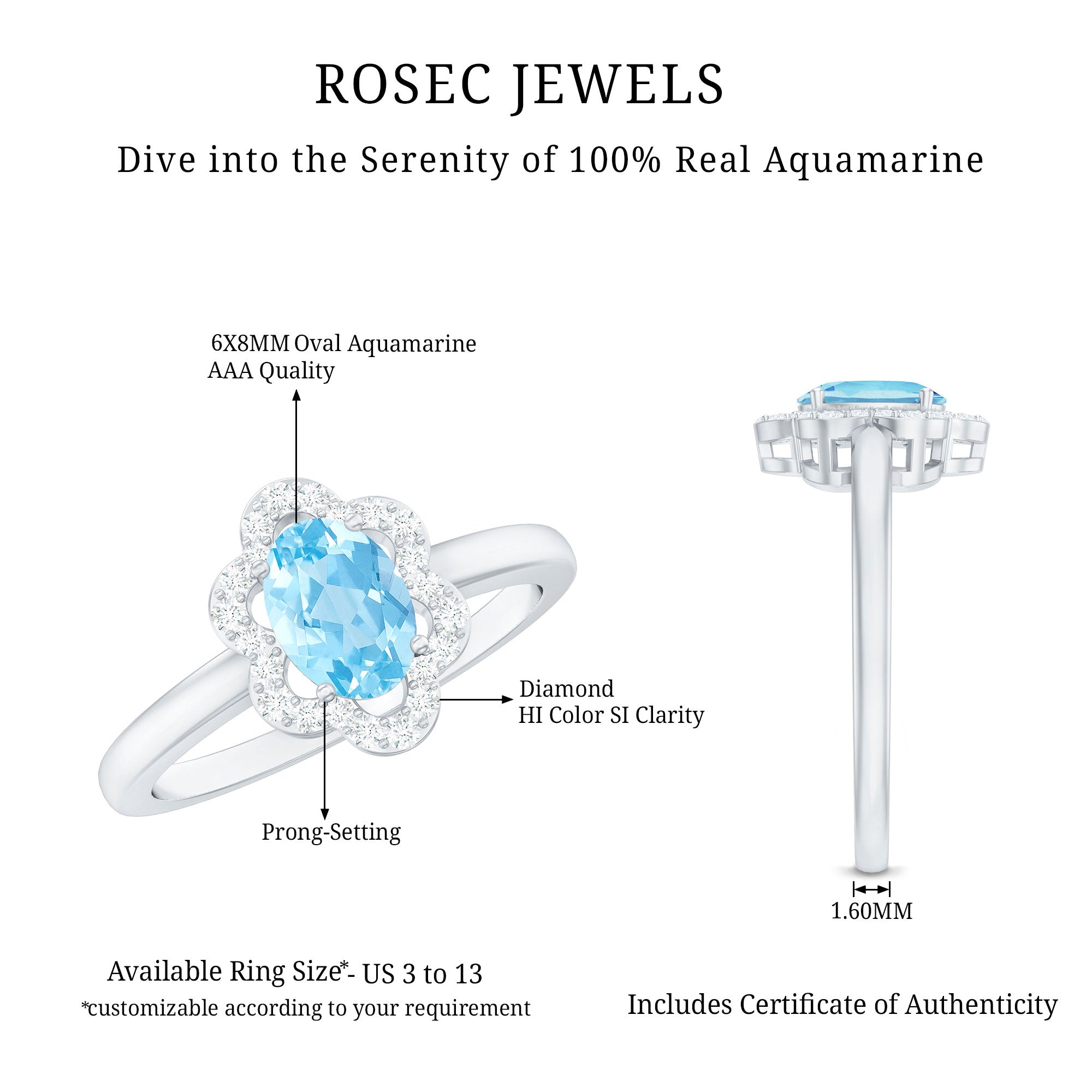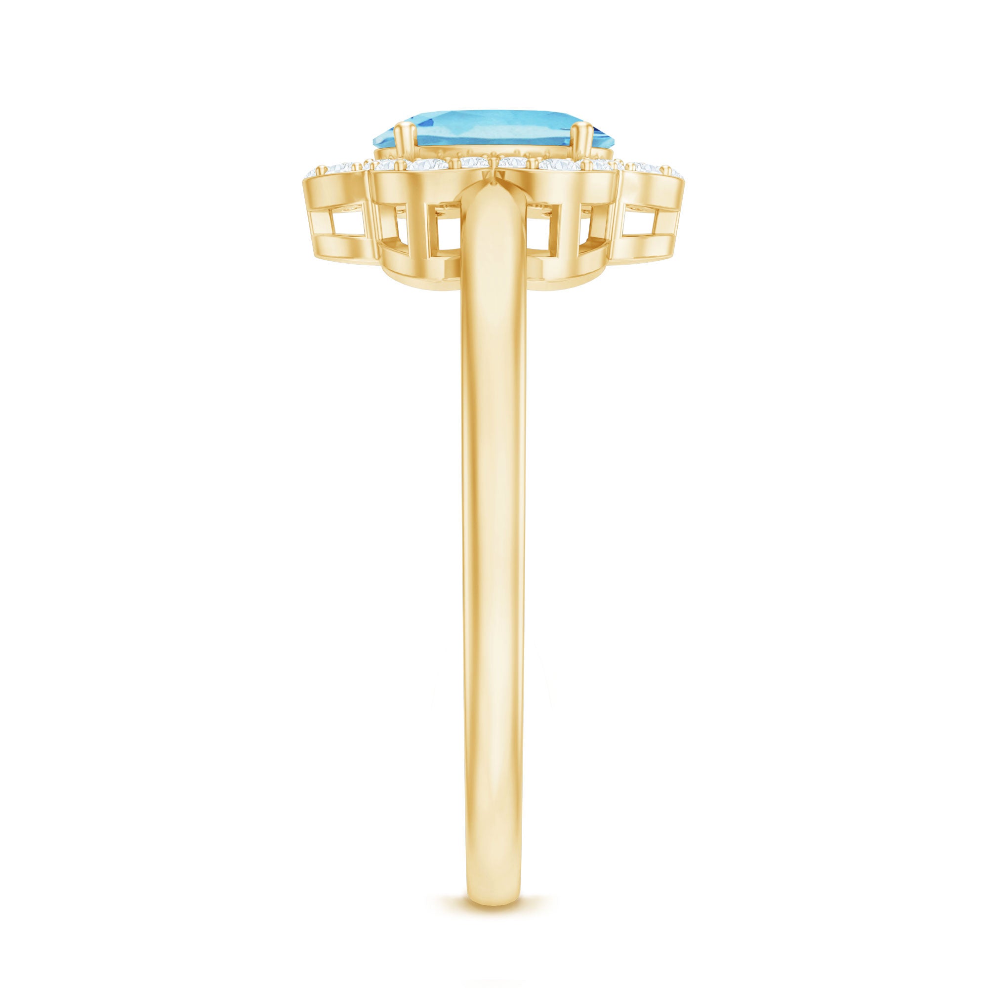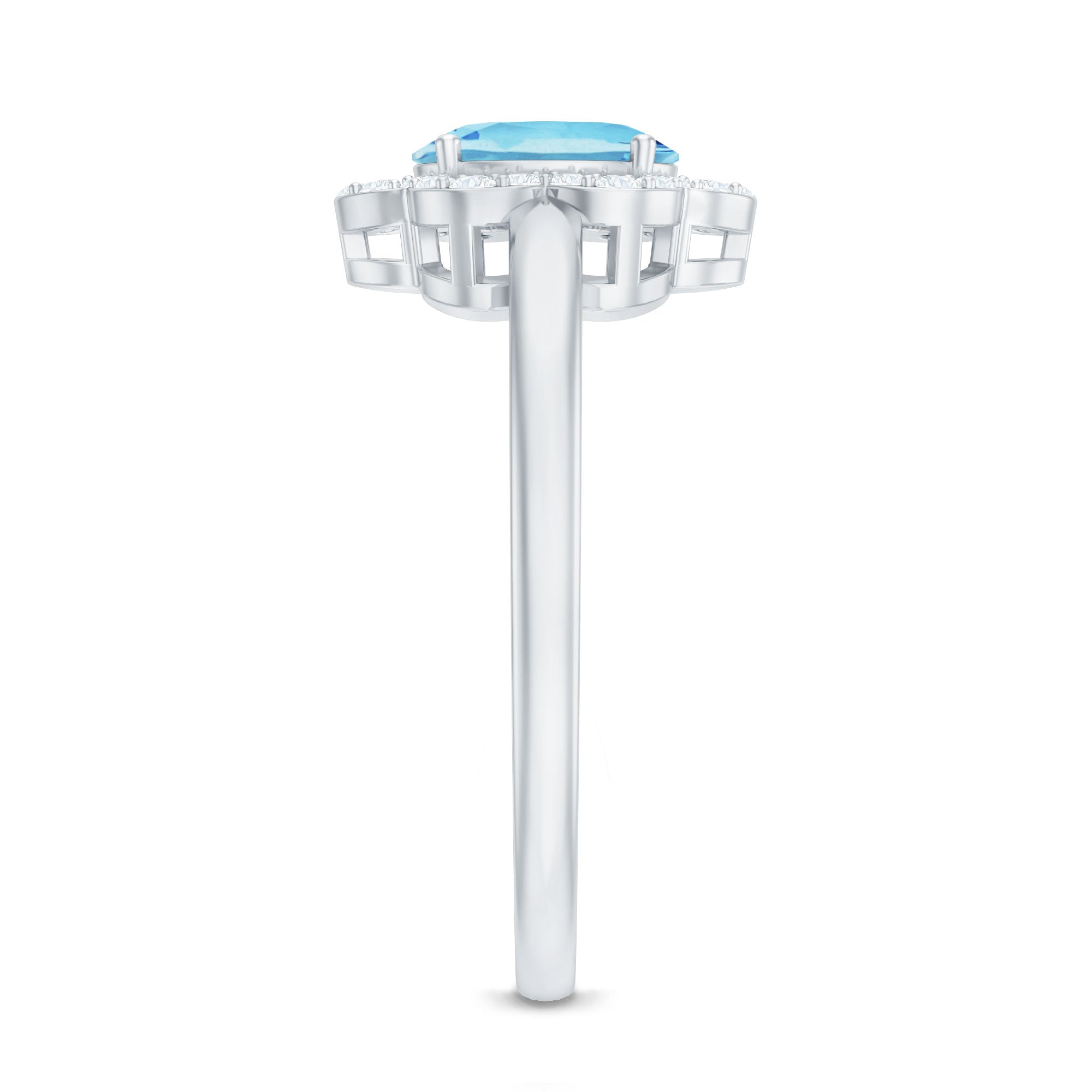 Showcase your exquisite taste with this Aquamarine Floral Cocktail Ring, fit for royalty. The oval-cut Aquamarine is surrounded by Diamond accents, arranged in a floral pattern, creating a vintage yet fashion-forward aesthetic. This engagement ring is perfect for a woman born in March, who appreciates the finer things in life and deserves to be adorned with such a stunning piece of jewelry.