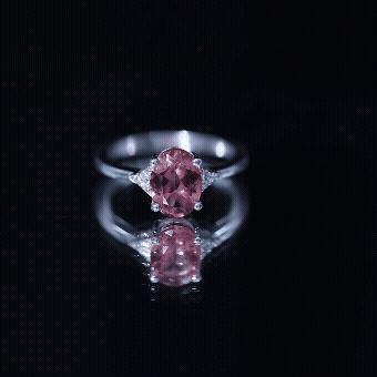 This exquisite solitaire ring features a stunning oval shaped pink tourmaline stone. The pink tourmalines beautiful hue adds a pop of color and vibrancy to the ring, while the Diamond trio on either side of the center stone provides a touch of sparkle and glamour. With its understated design and stunning gemstone, this ring is perfect for everyday wear or special occasions. It also makes a thoughtful and memorable gift for a loved one.