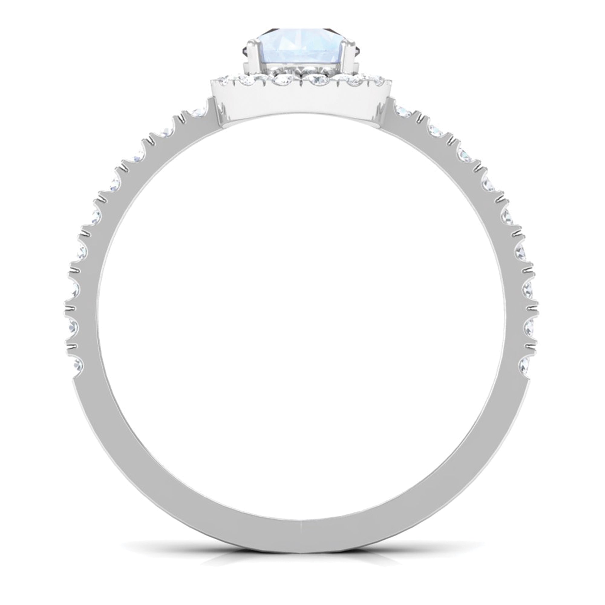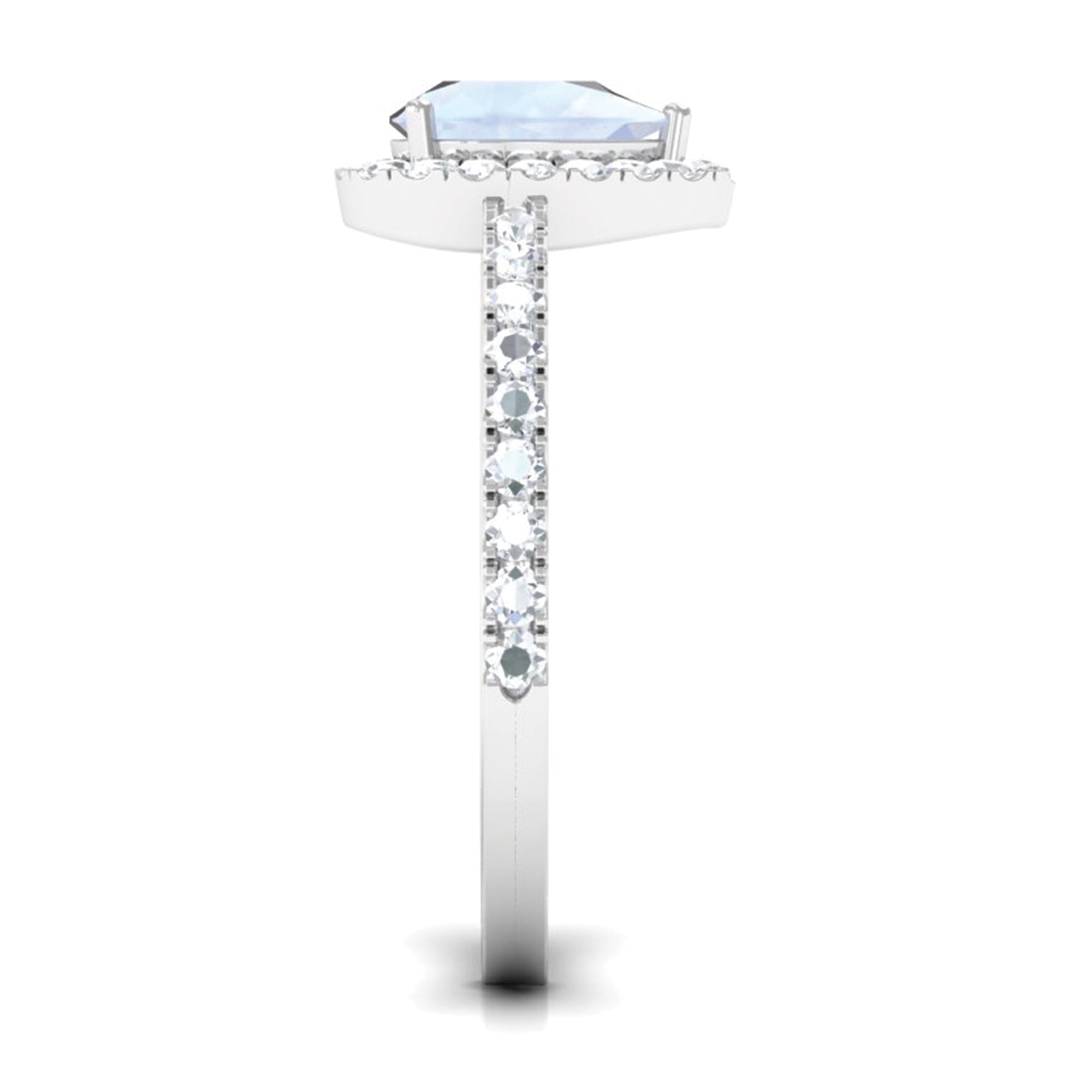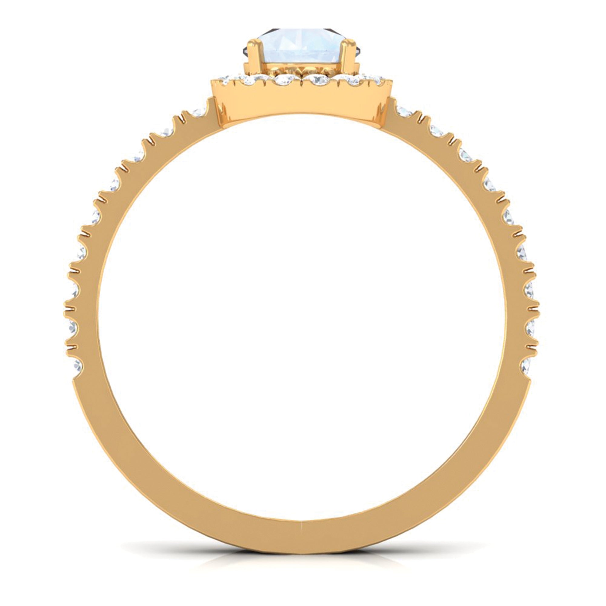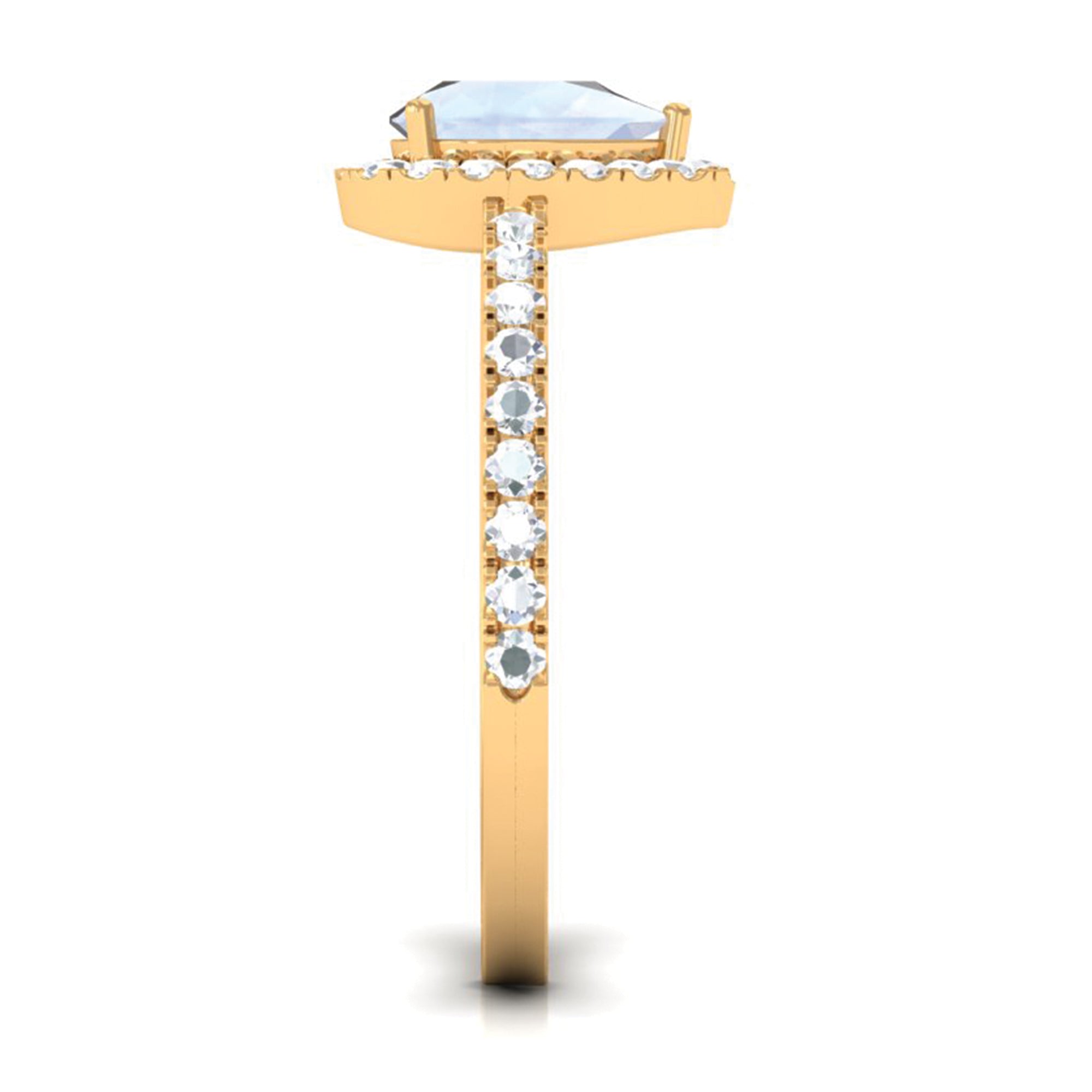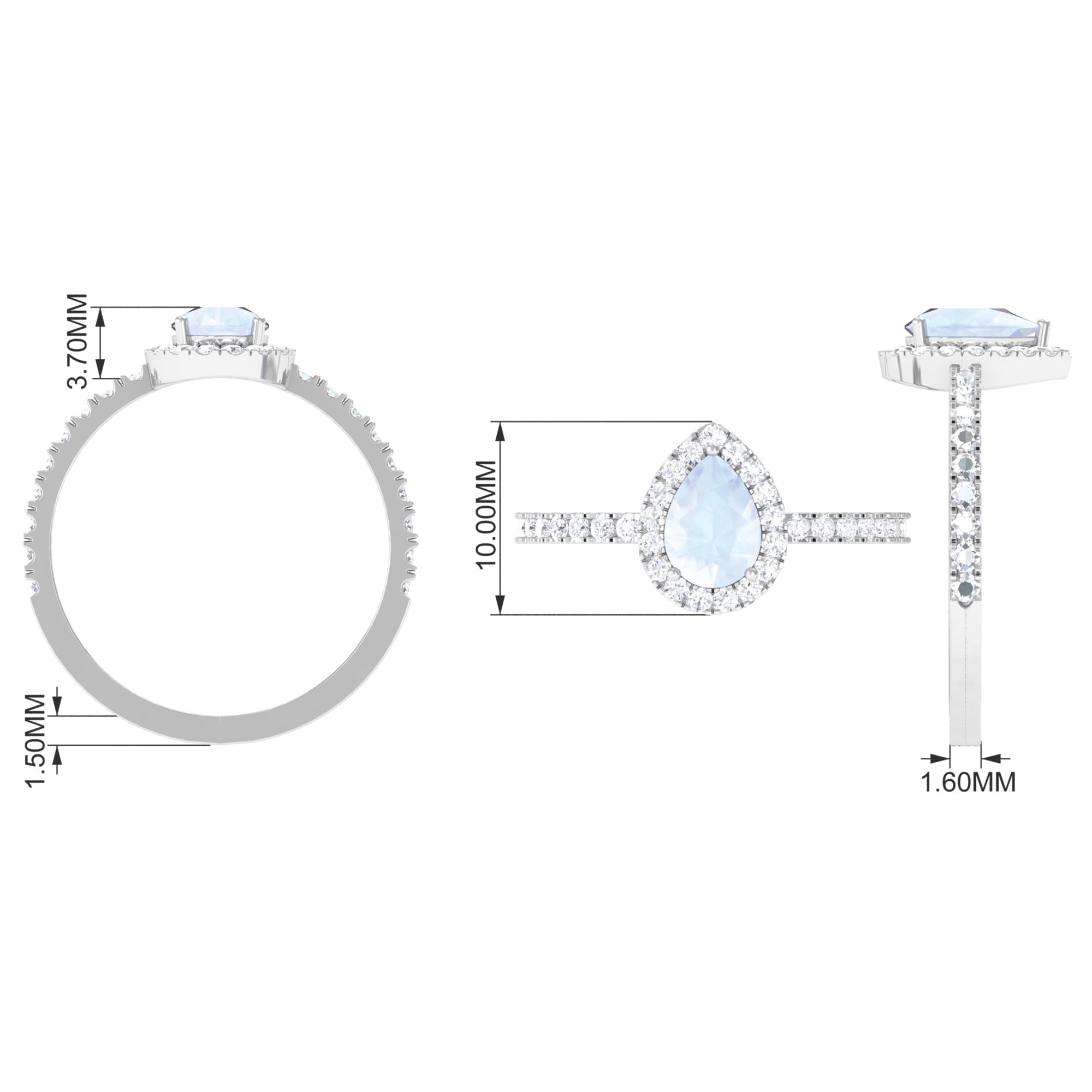 Embark the new journey of your life with this beautiful Engagement Ring adorned with Pear Cut Moonstone Solitaire with a Halo of petite Round Shape Diamonds with Side Stones. This Simple Engagement Ring is crafted with Solid Gold to make for a luxe choice for your special day.