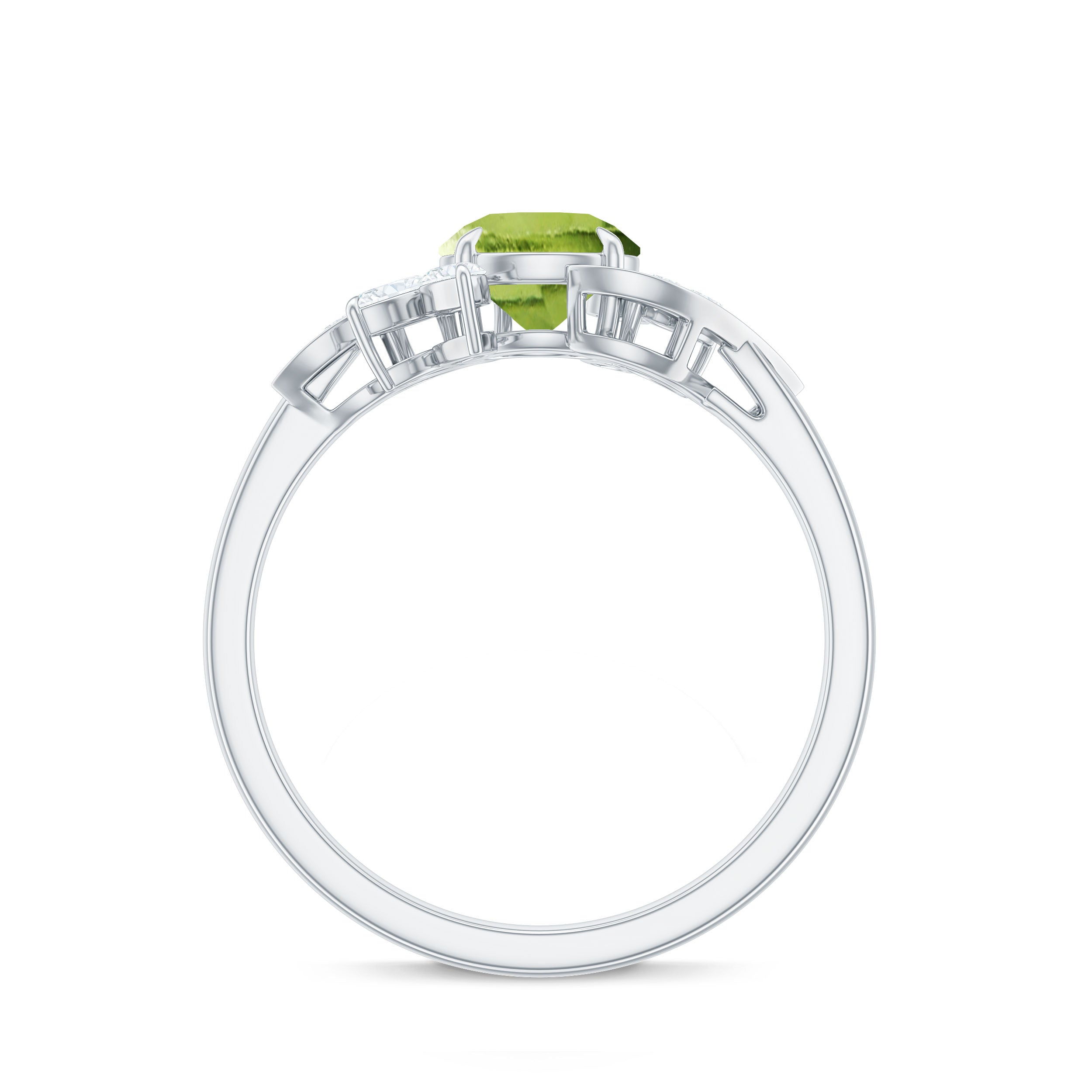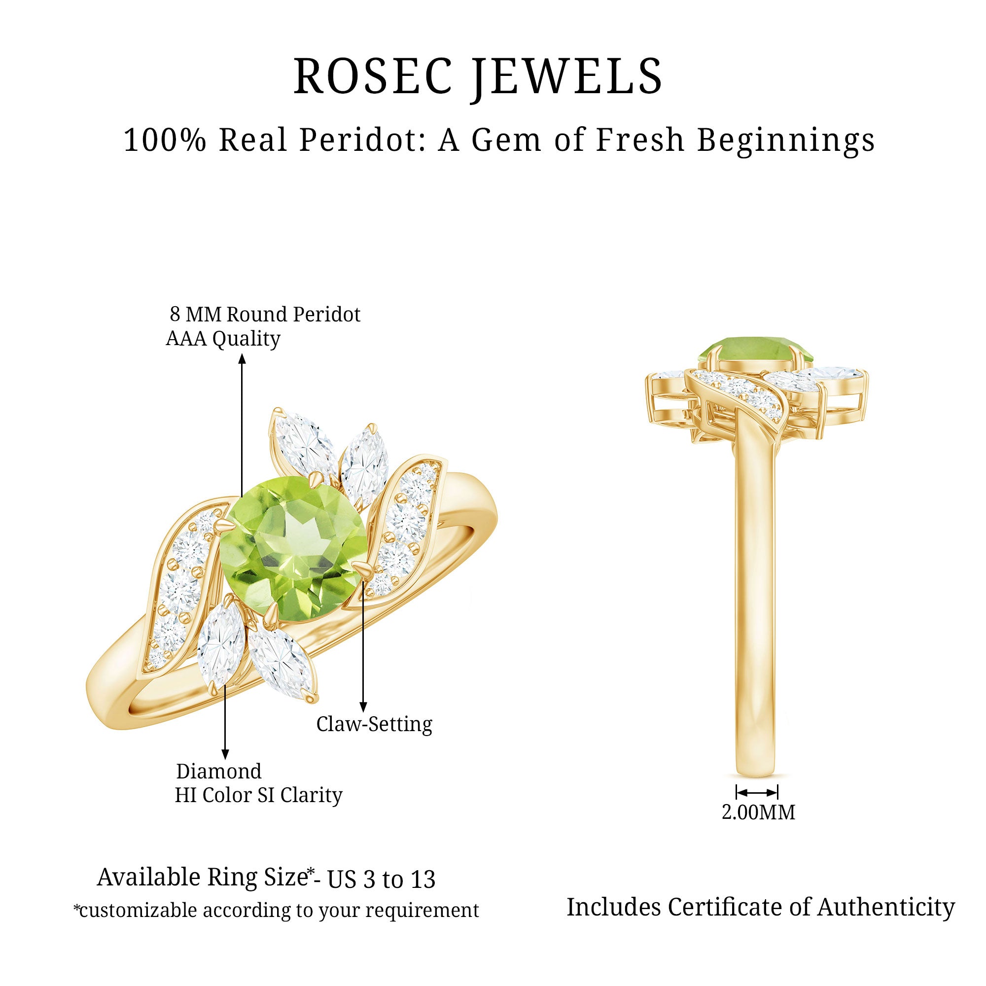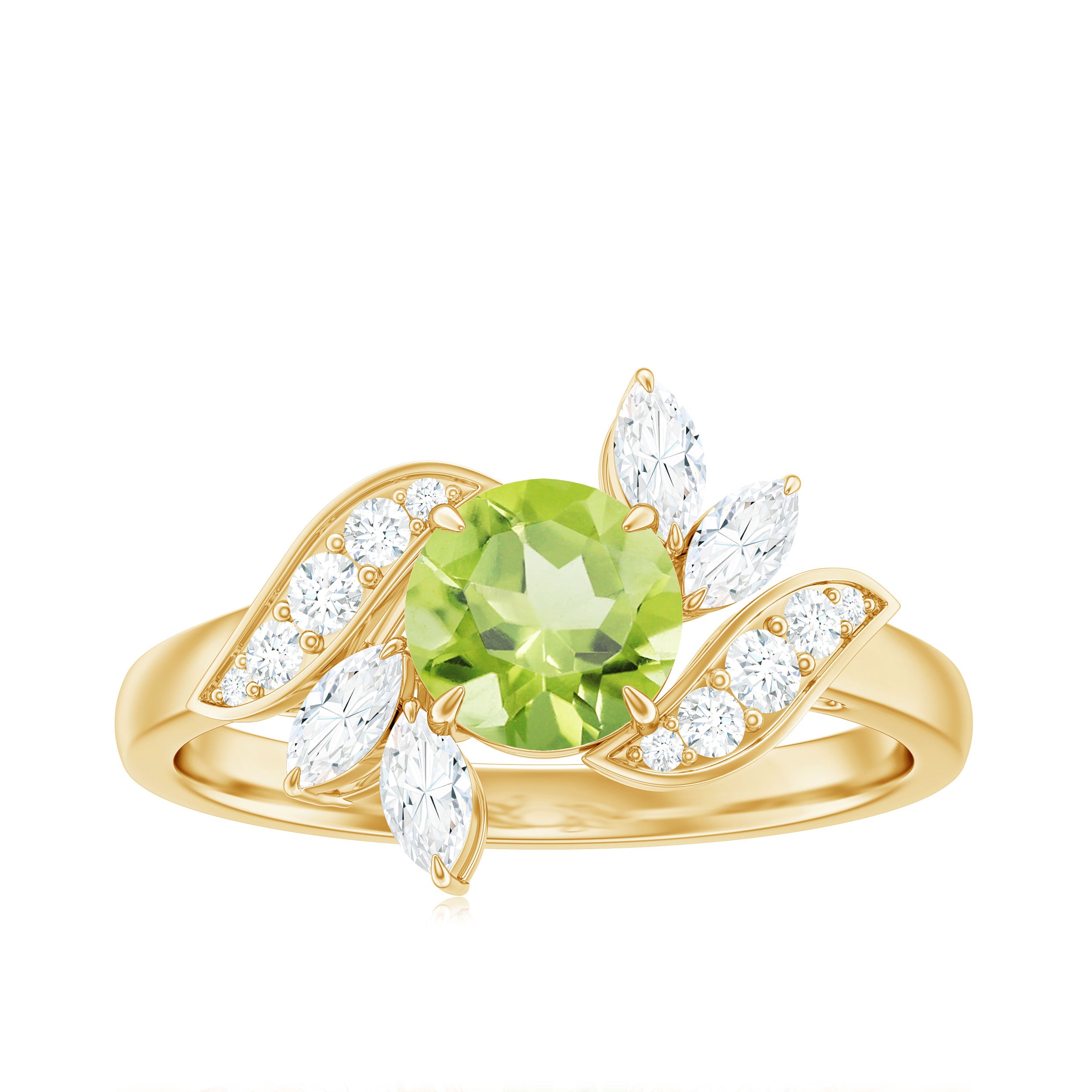 Every moment of yours is worth celebrating, so why not celebrate it with an alluring fine jewelry. This Peridot Engagement Ring is exactly what your are looking for your partner, Round Peridot and Marquise Diamond is held in Claw Setting and Round Diamond is held in prong setting are featured in leaf pattern. Show your love to your partner with this Vintage Peridot Ring.