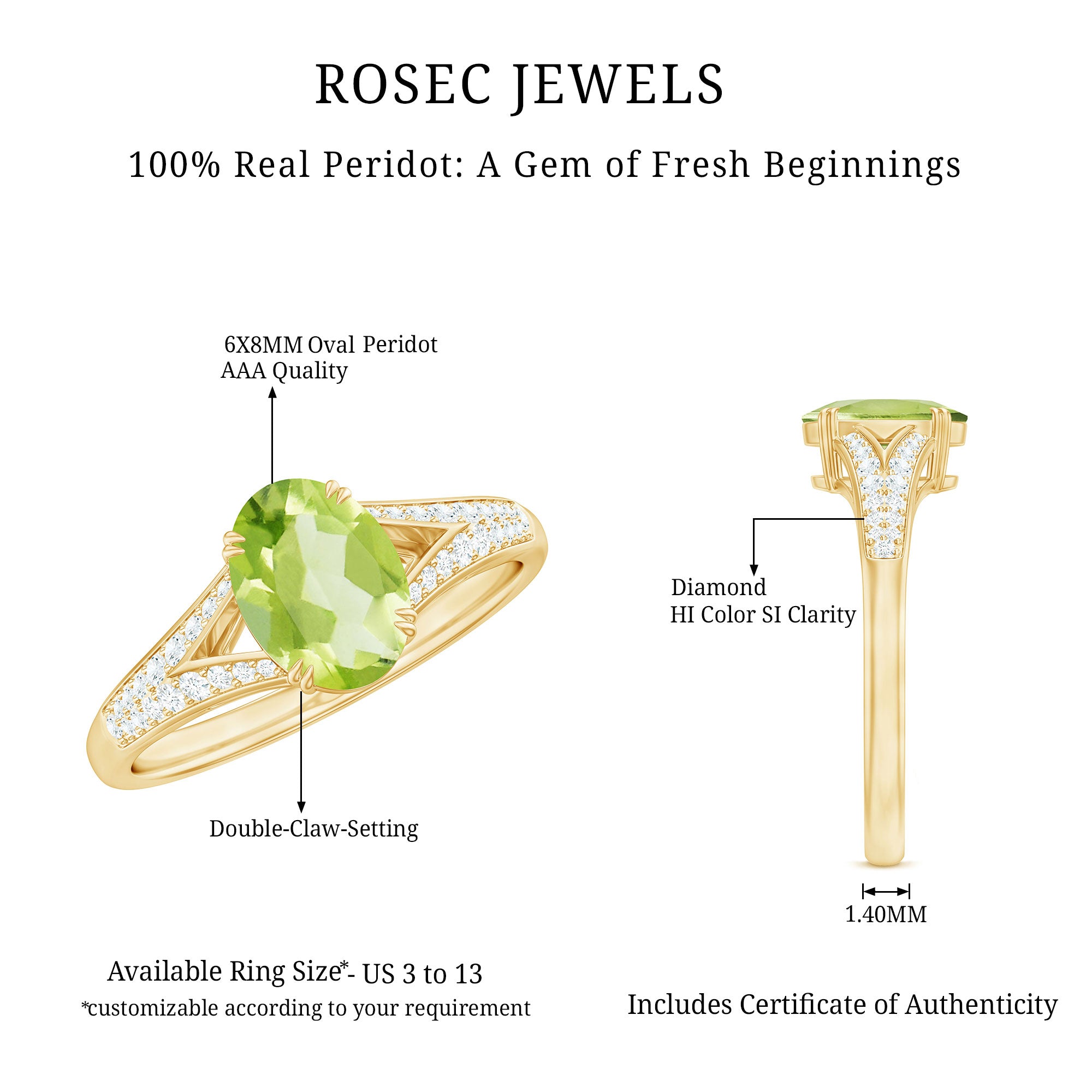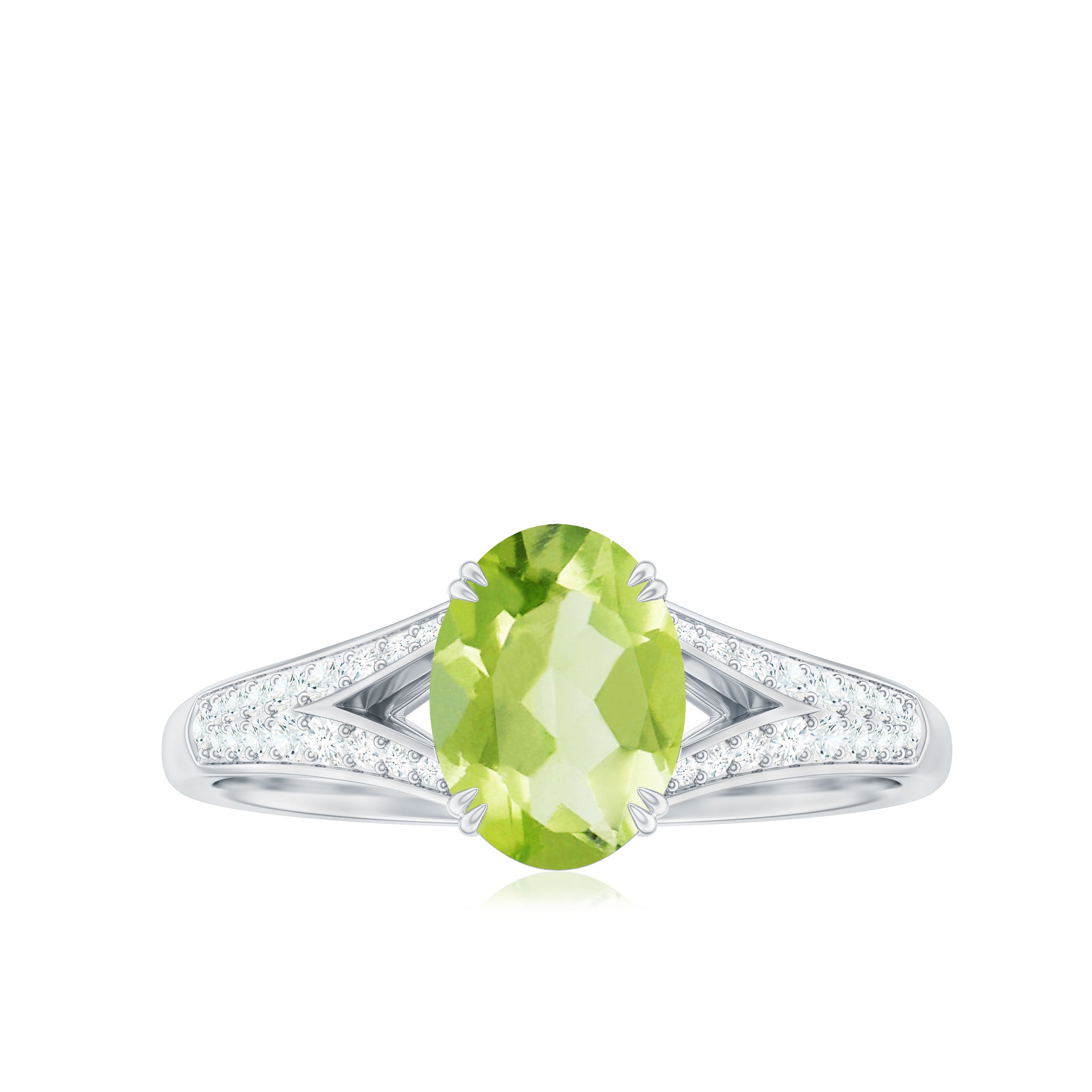 Let her know how much you adore her by surprising her with this alluring Solitaire Engagement Ring adorned with Oval Cut Peridot in Double Claw Prong Setting while the shimmering Diamond Stones are studded over the mesmerizing Split Shank. This Peridot and Diamond Ring will be a perfect choice for your lady love. She will adore this Peridot Engagement Ring her whole life as it symbolizes your eternal love for her.