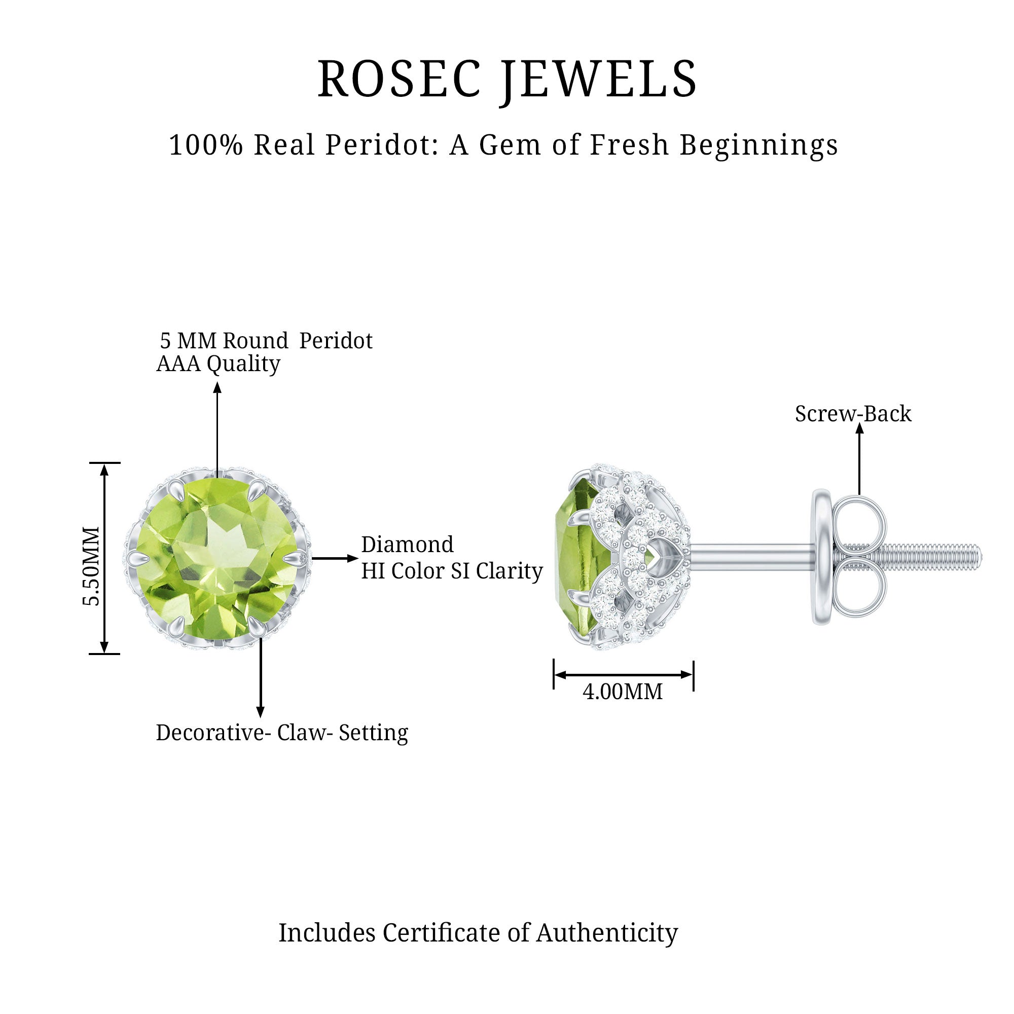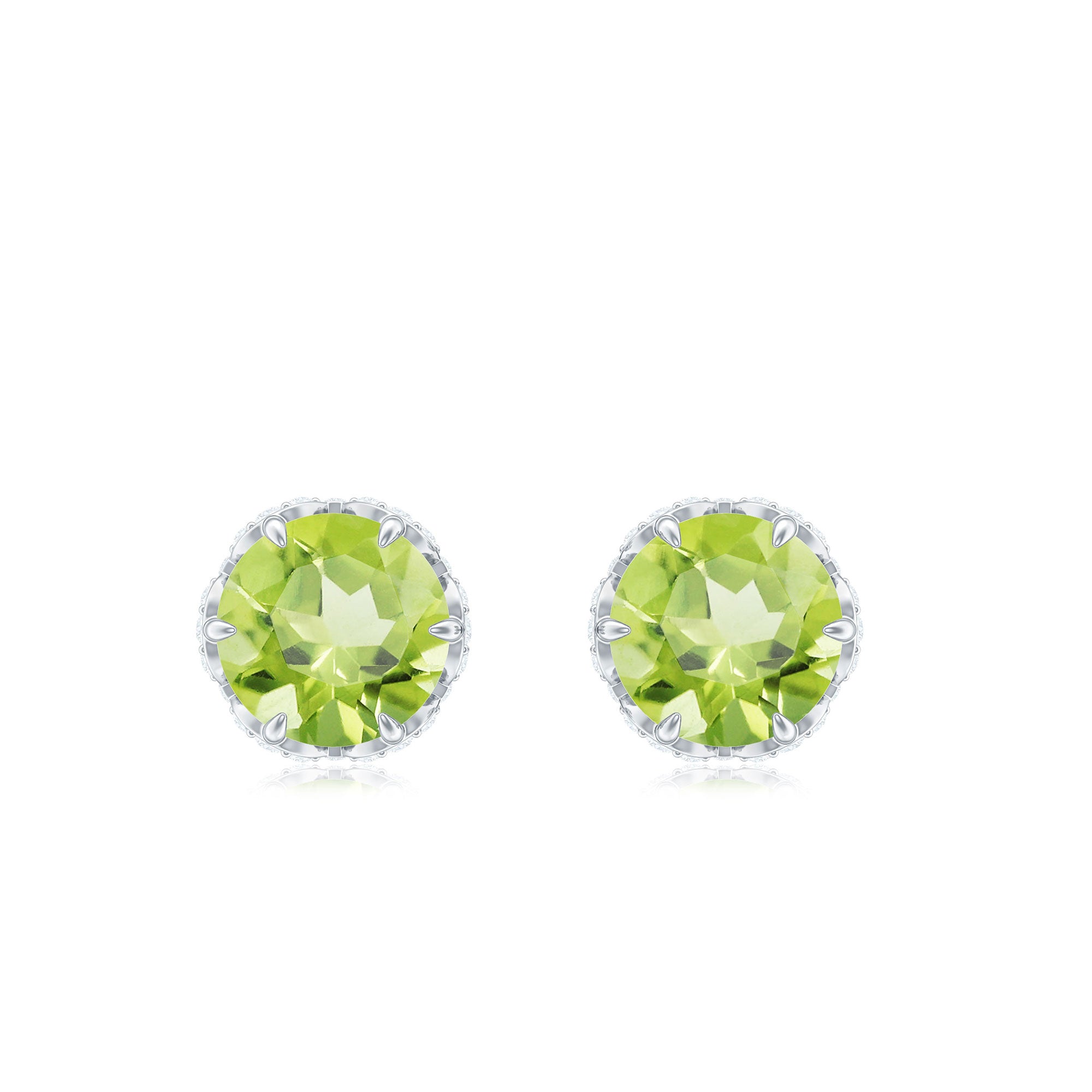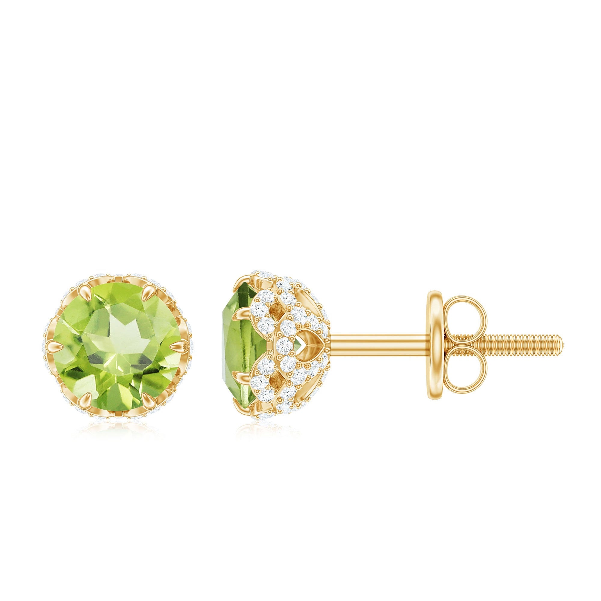 This Classic Stud Earring is embellished with Round Shape Peridot set as Solitaire and Diamond accent in Decorative Pattern.