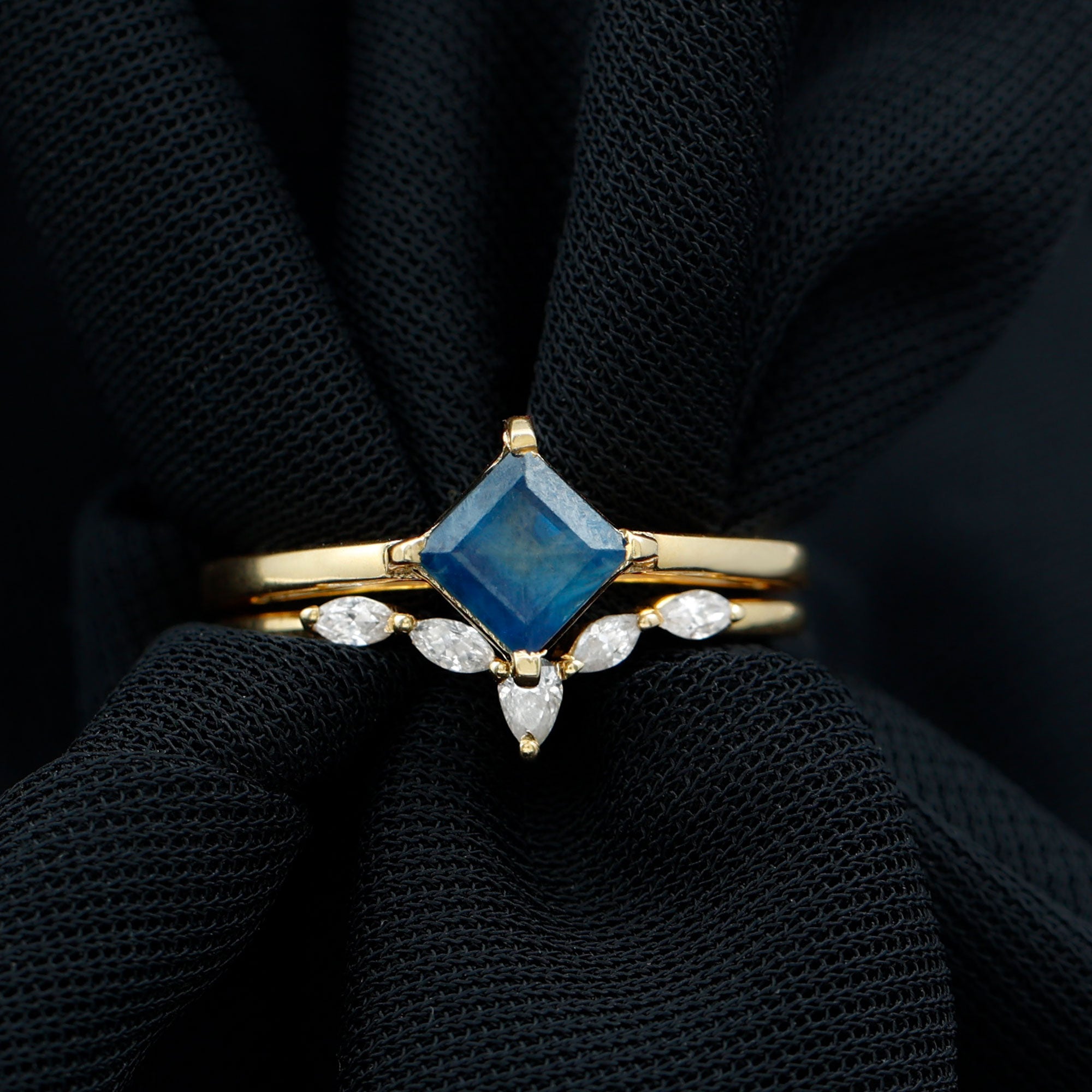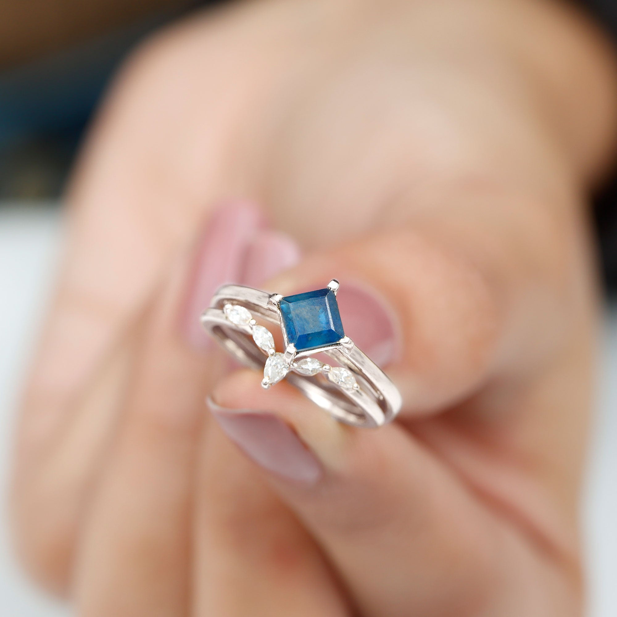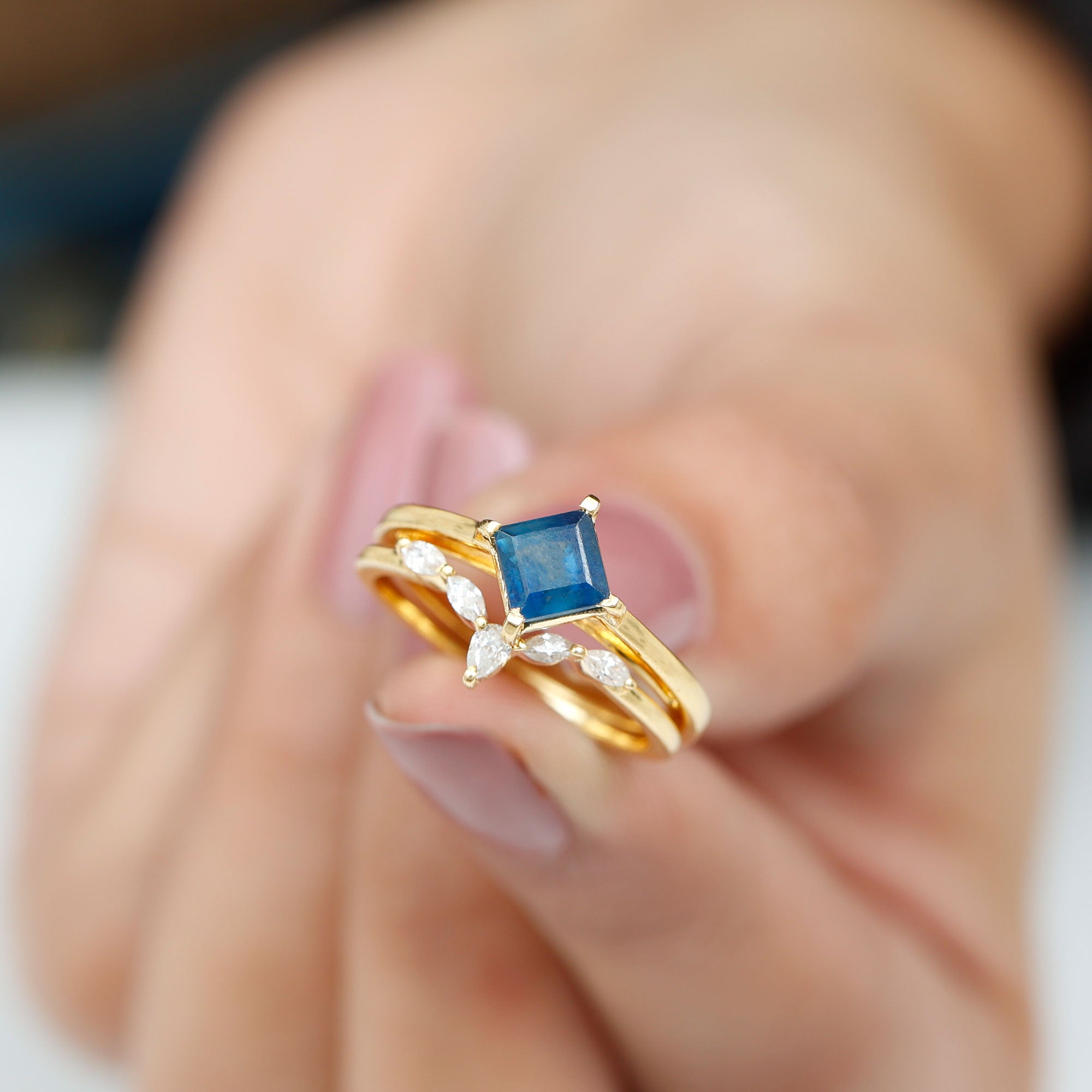 Make a striking impression on your special day with this exquisite Solitaire Ring Set featuring a stunning Princess Cut Created Blue Sapphire as the centerpiece, delicately placed in a secure Prong Setting. Accompanied by a dazzling Enhancer Band adorned with Pear and Marquise Cut Diamond stones, this ring set is a true masterpiece. Meticulously crafted in Solid Gold, it is designed to elevate your wedding ensemble and leave a lasting impression.