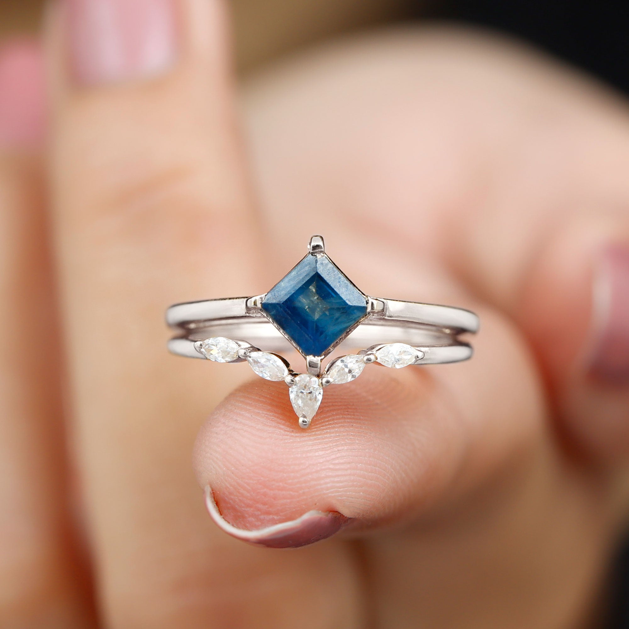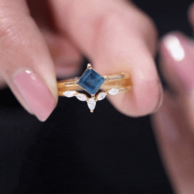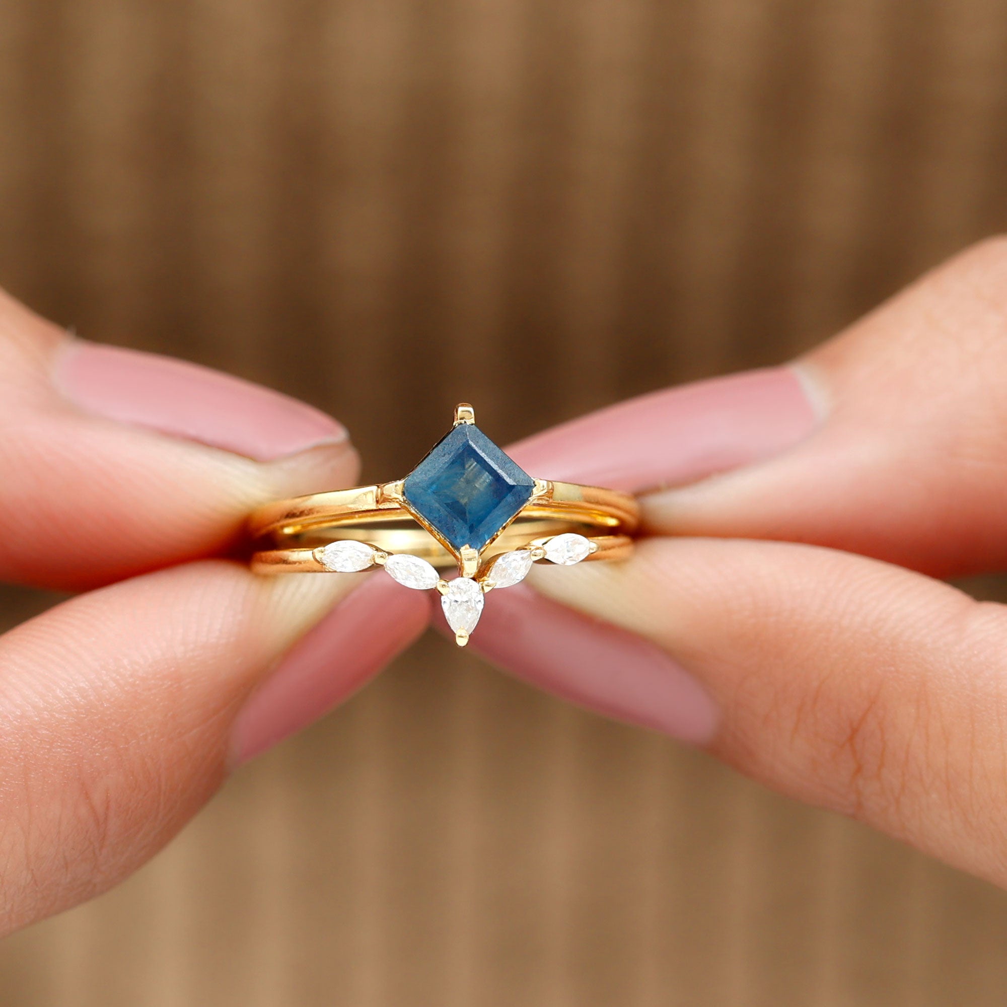 Make a striking impression on your special day with this exquisite Solitaire Ring Set featuring a stunning Princess Cut Created Blue Sapphire as the centerpiece, delicately placed in a secure Prong Setting. Accompanied by a dazzling Enhancer Band adorned with Pear and Marquise Cut Diamond stones, this ring set is a true masterpiece. Meticulously crafted in Solid Gold, it is designed to elevate your wedding ensemble and leave a lasting impression.