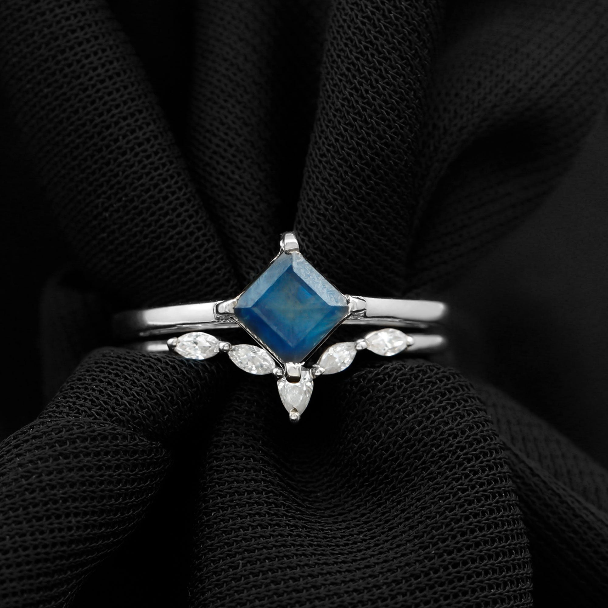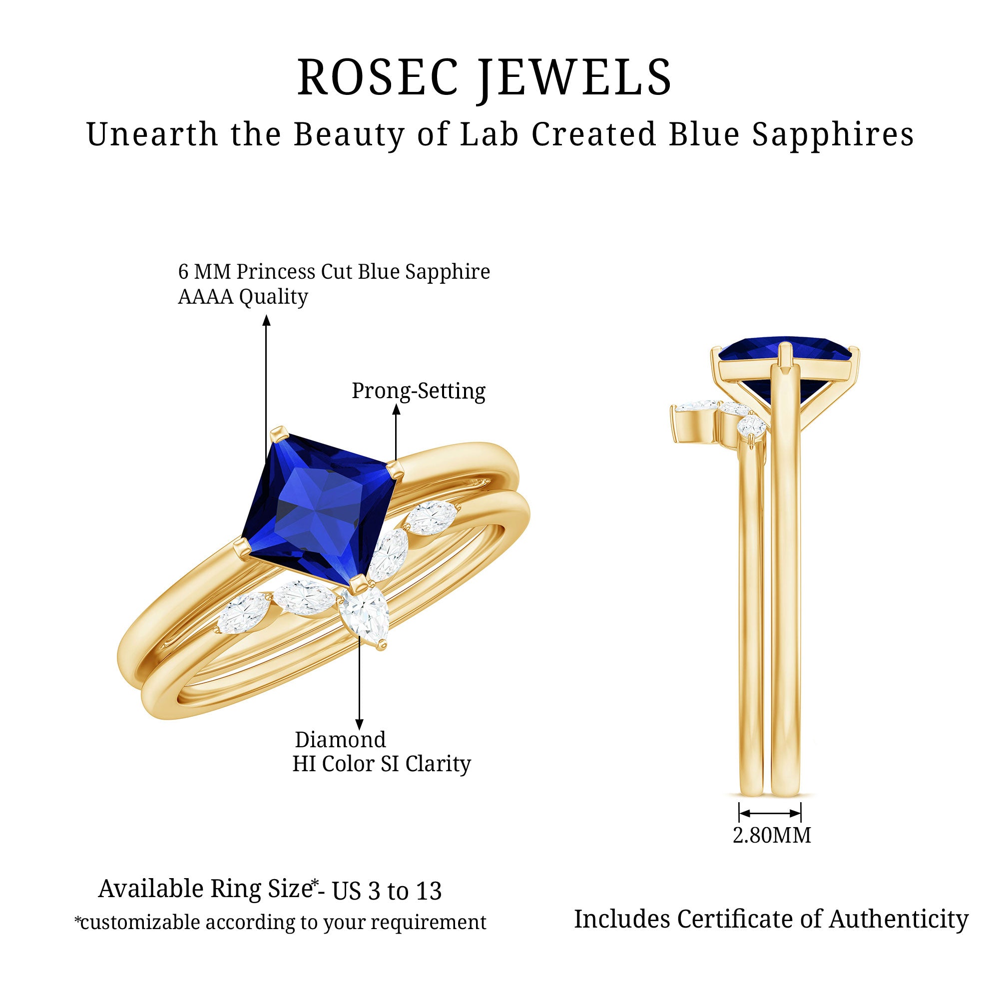 1.25 CT Princess Cut Created Blue Sapphire Solitaire Ring Set with Diamond
