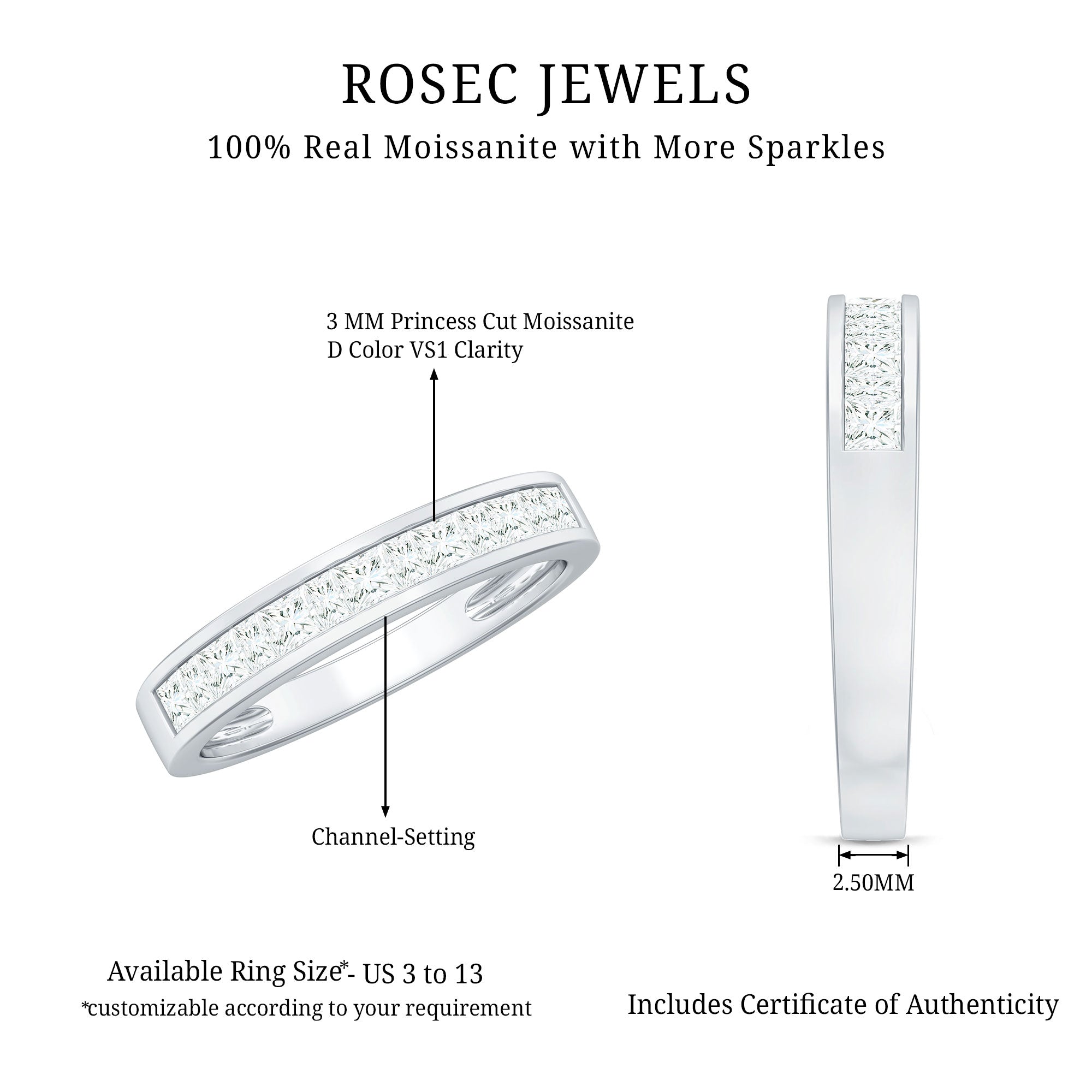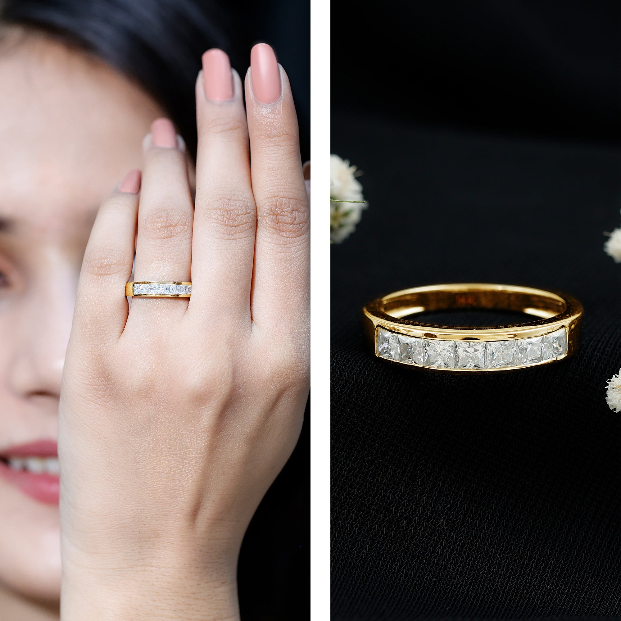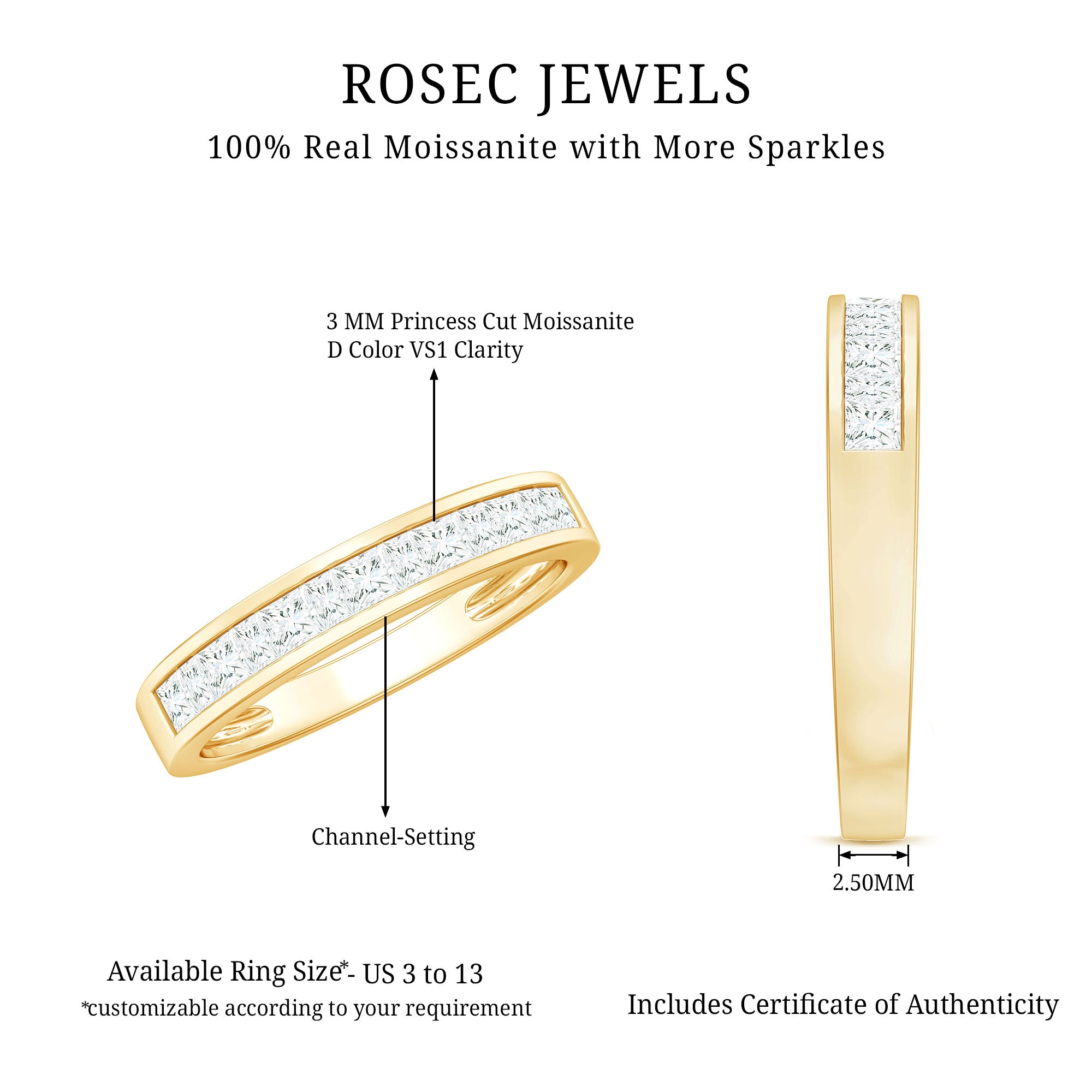 This gorgeous half eternity ring features princess cut moissanite stones set in channel setting. The princess cut stones and half eternity design make this ring a perfect choice for an engagement ring, wedding band, anniversary gift, or any special occasion. This beautiful ring is crafted with gold metal and is sure to impress.