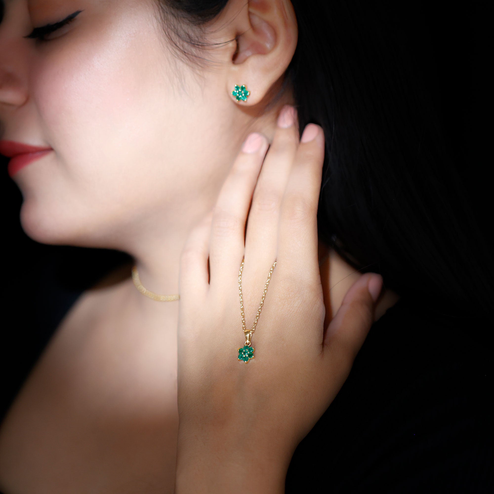 Gracefully created, this Floral Jewelry Set is adorned with Round Cut Emerald in Prong Setting to complement your outfit. It gives a luxurious appeal to this Pendant and Earring Set that a woman can wear on any occasion.