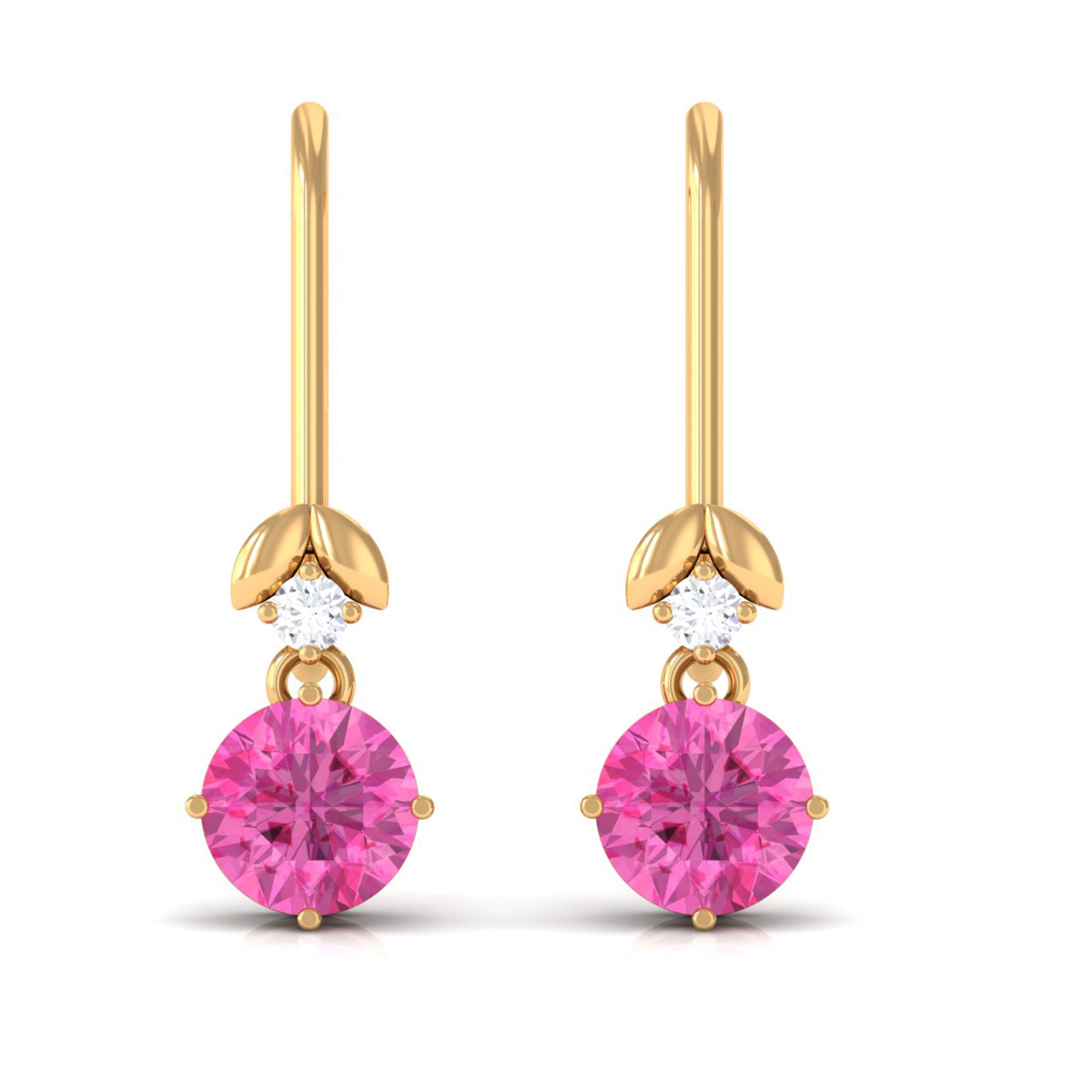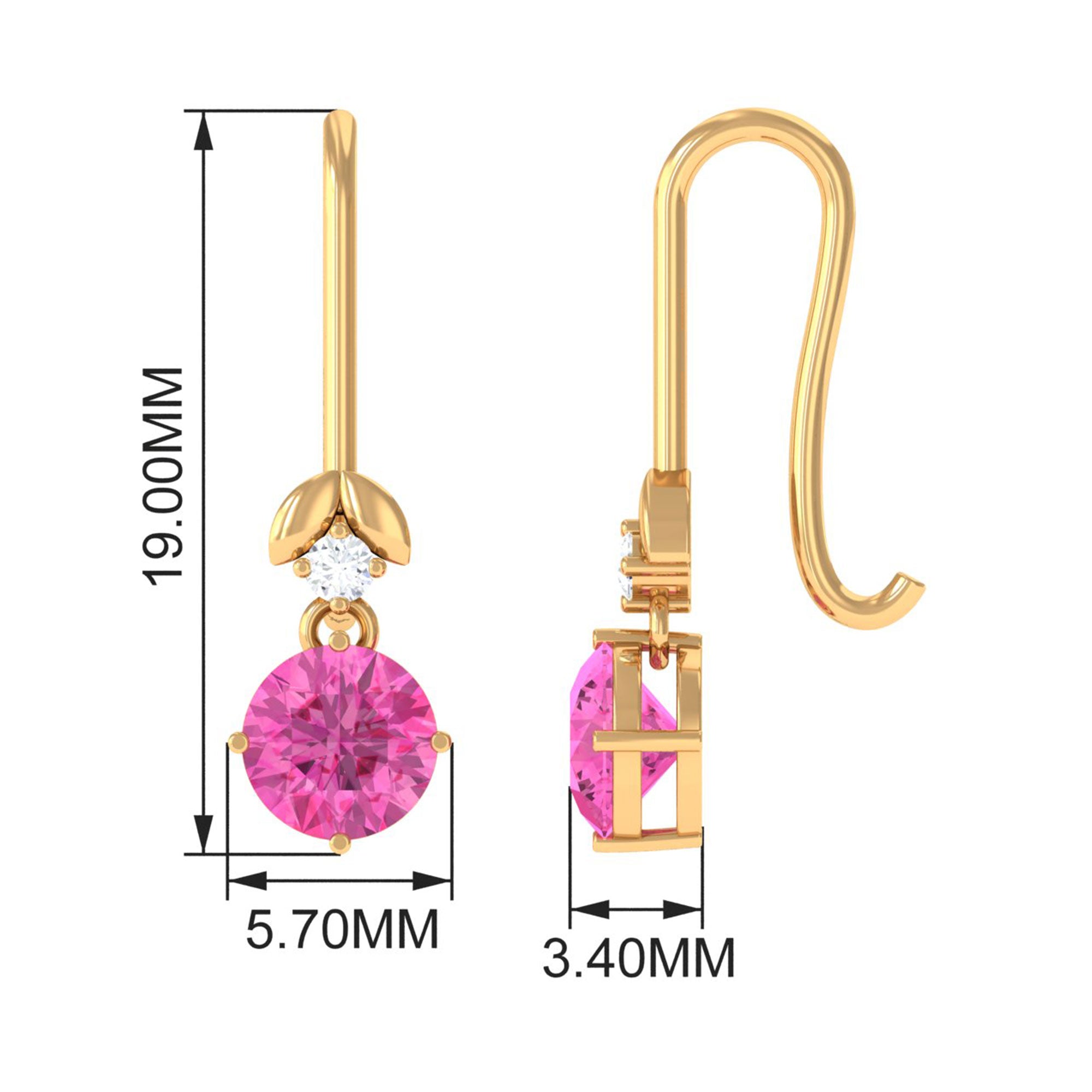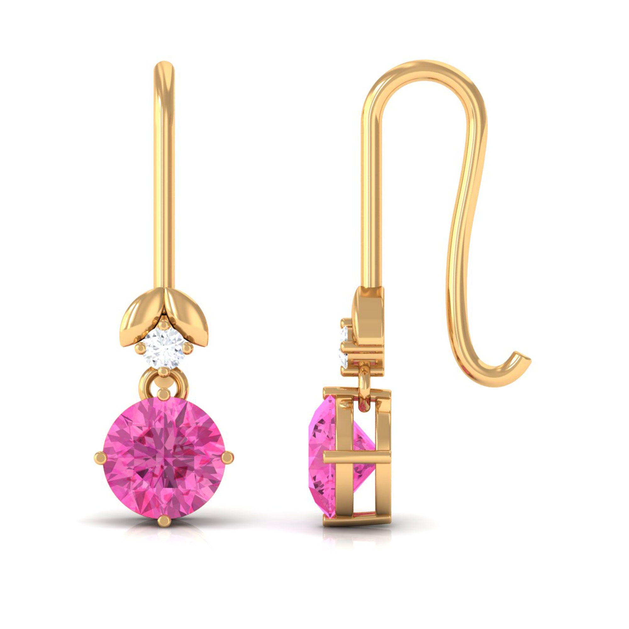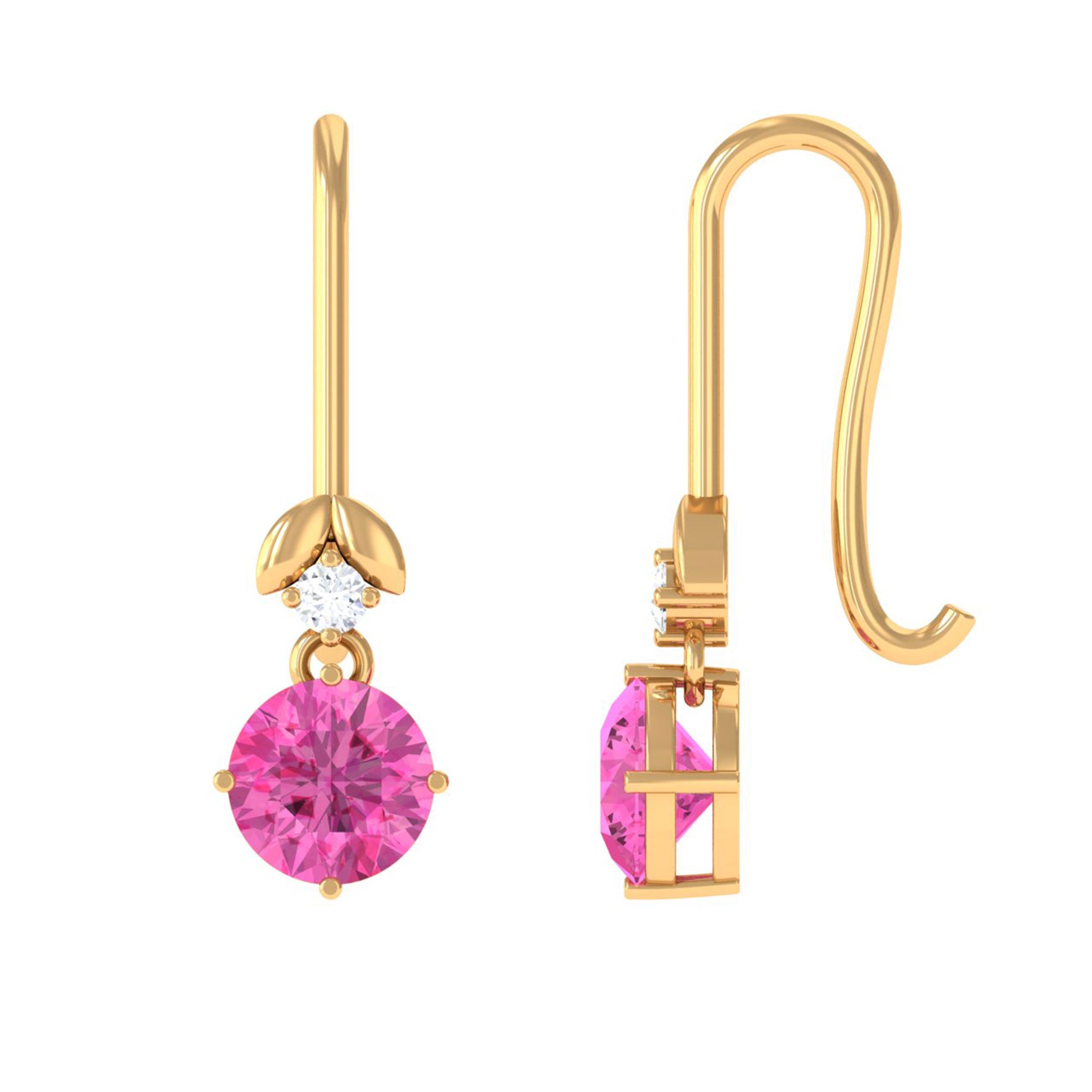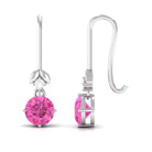 These charming drop earrings are a fun way to elevate your evening outfits. They feature a beautiful round-cut pink sapphire that dangles gracefully, accompanied by a small round Diamond in a prong setting. These pink sapphire earrings add a touch of brilliance to both your casual and formal attire. Surprise someone special with these fish hook earrings, which would make a fantastic birthday gift.