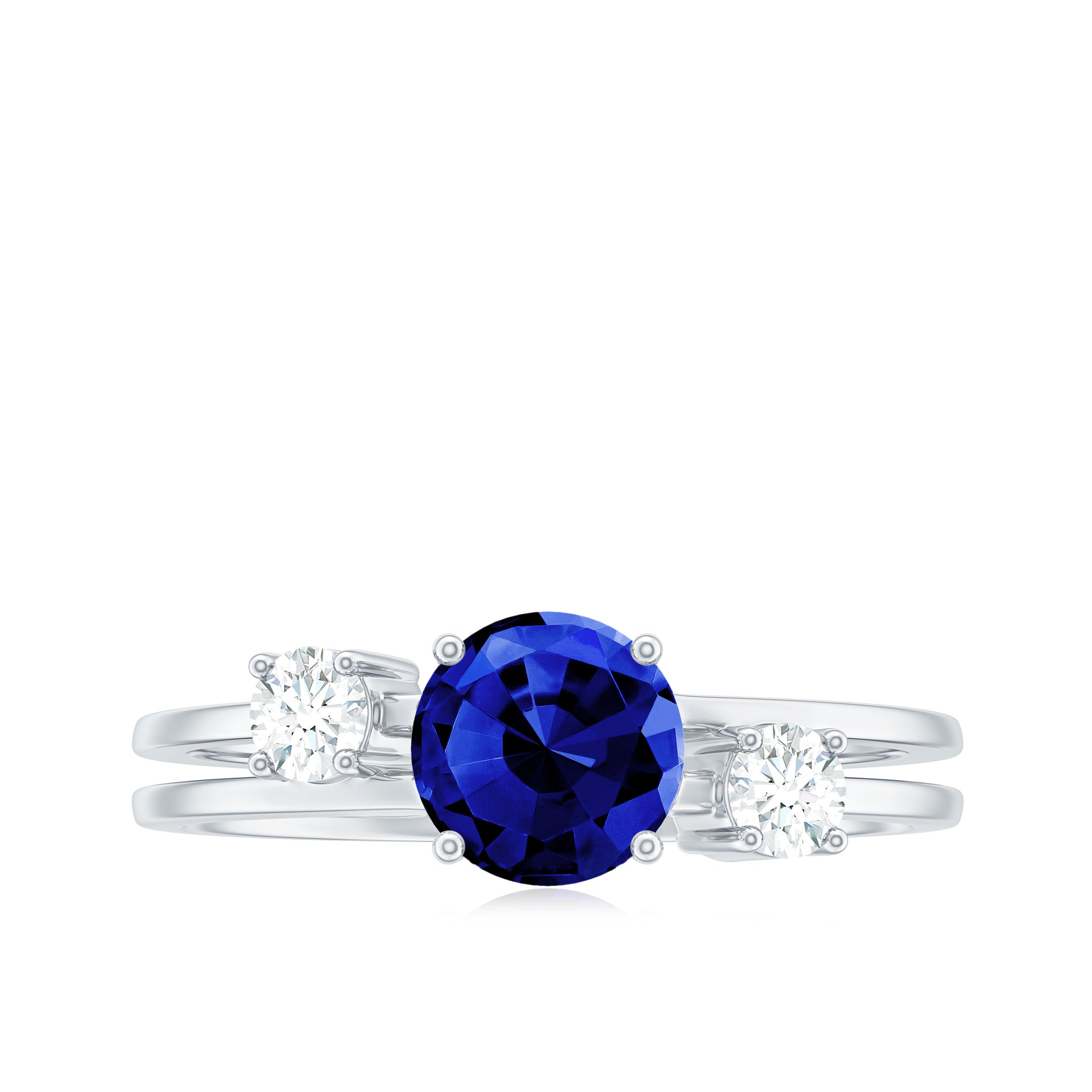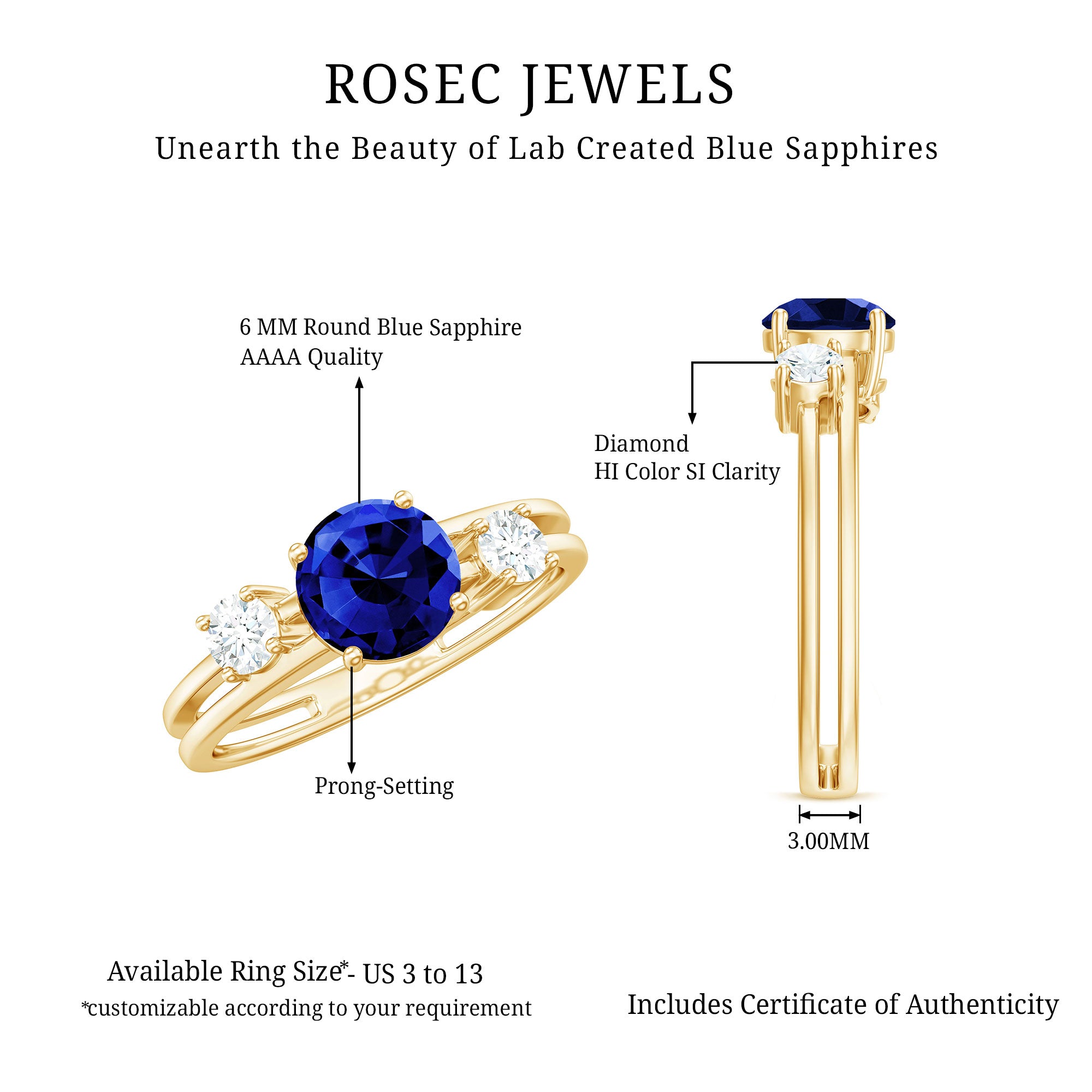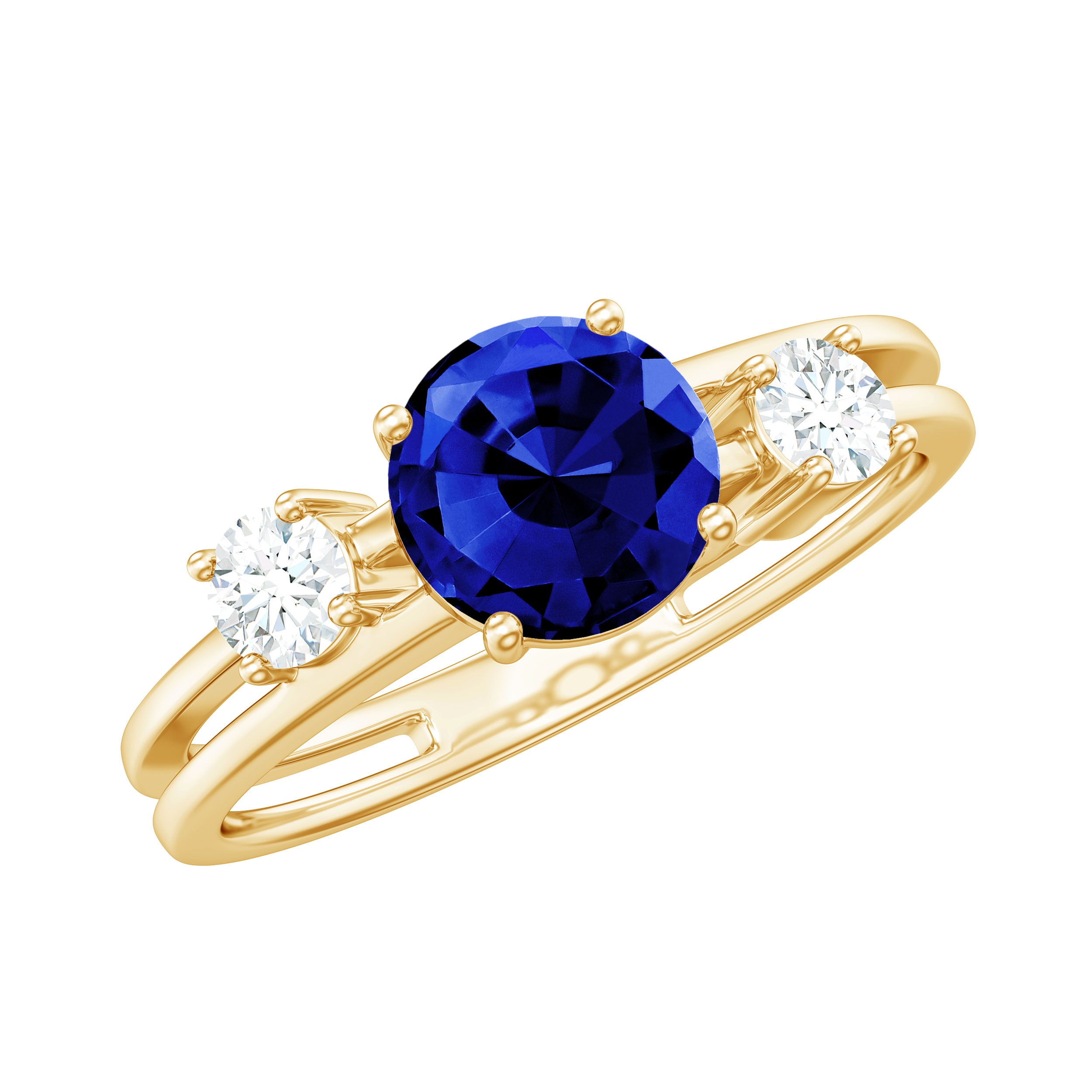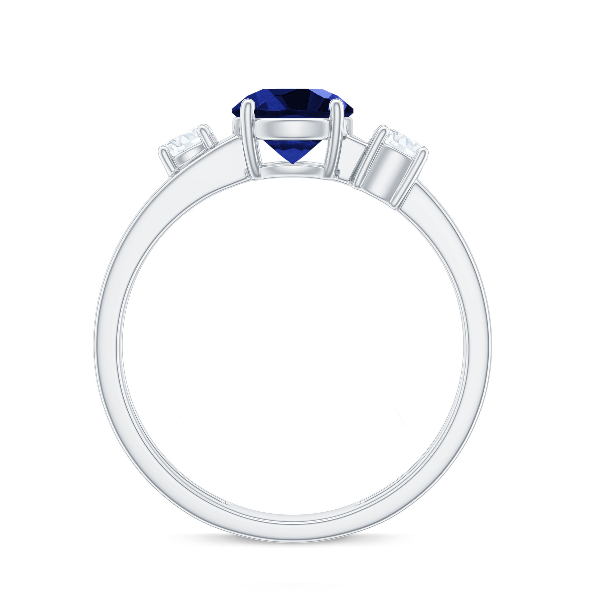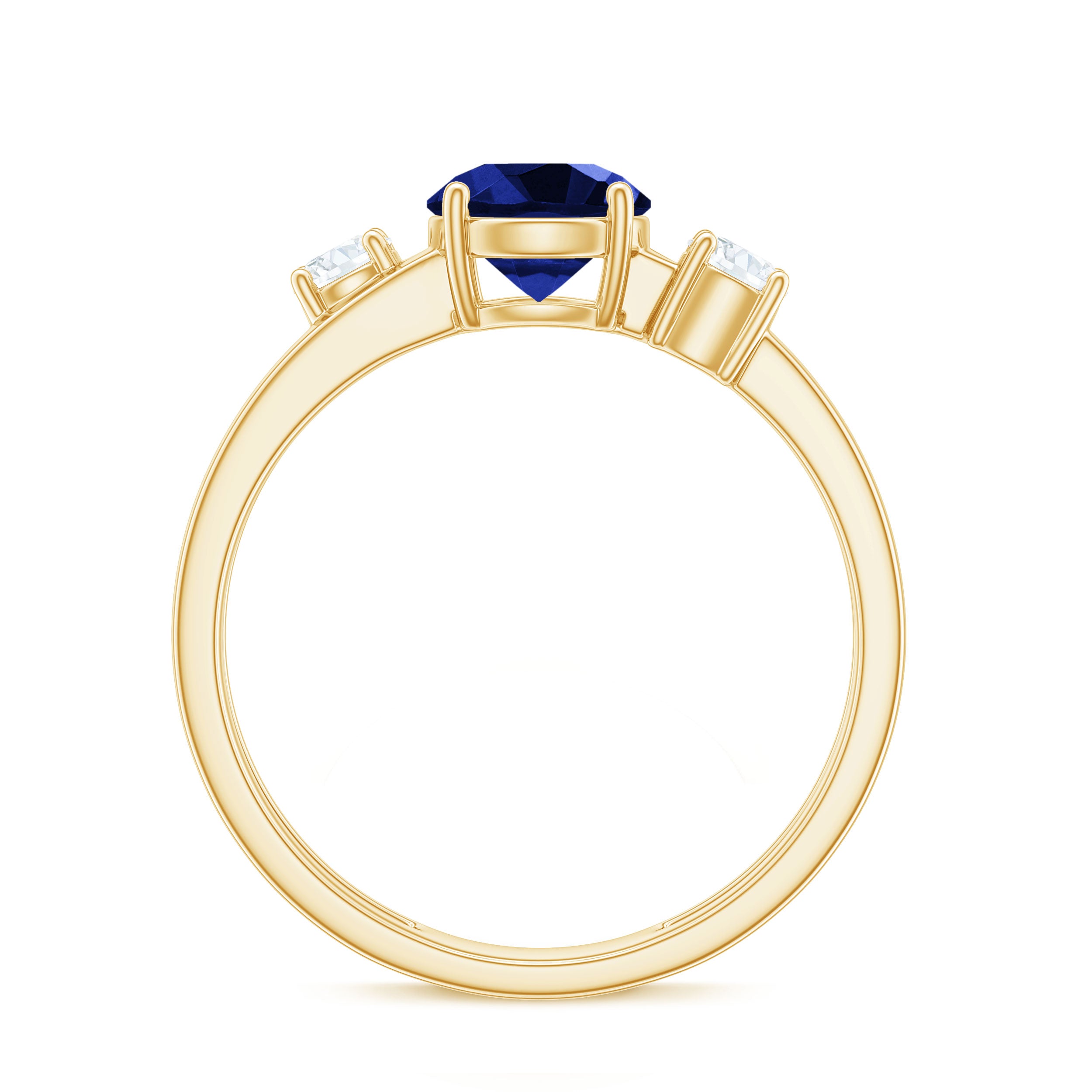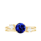 Round Shape Created Blue Sapphire Ring shows serenity of your personality, it is crafted in Gold for luxurious appeal. Created Blue Sapphire Solitaire held in Prong Setting creates a strong image of the wearer and along with that, Diamond on each side makes this ring look sumptuous. Created Blue Sapphire Engagement Ring showcases brilliance with its rich blue hue. Get this Solitaire Engagement Ring for your lady and impress her with your choice.