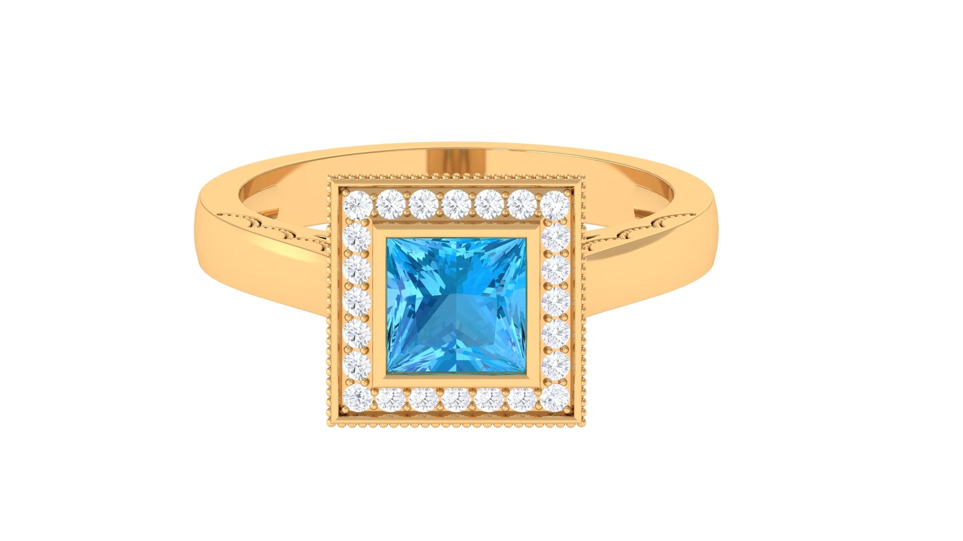 This Engagement Ring is in Gold featuring Princess Cut Swiss Blue Topaz and Round Shape Diamond for you to feel special.