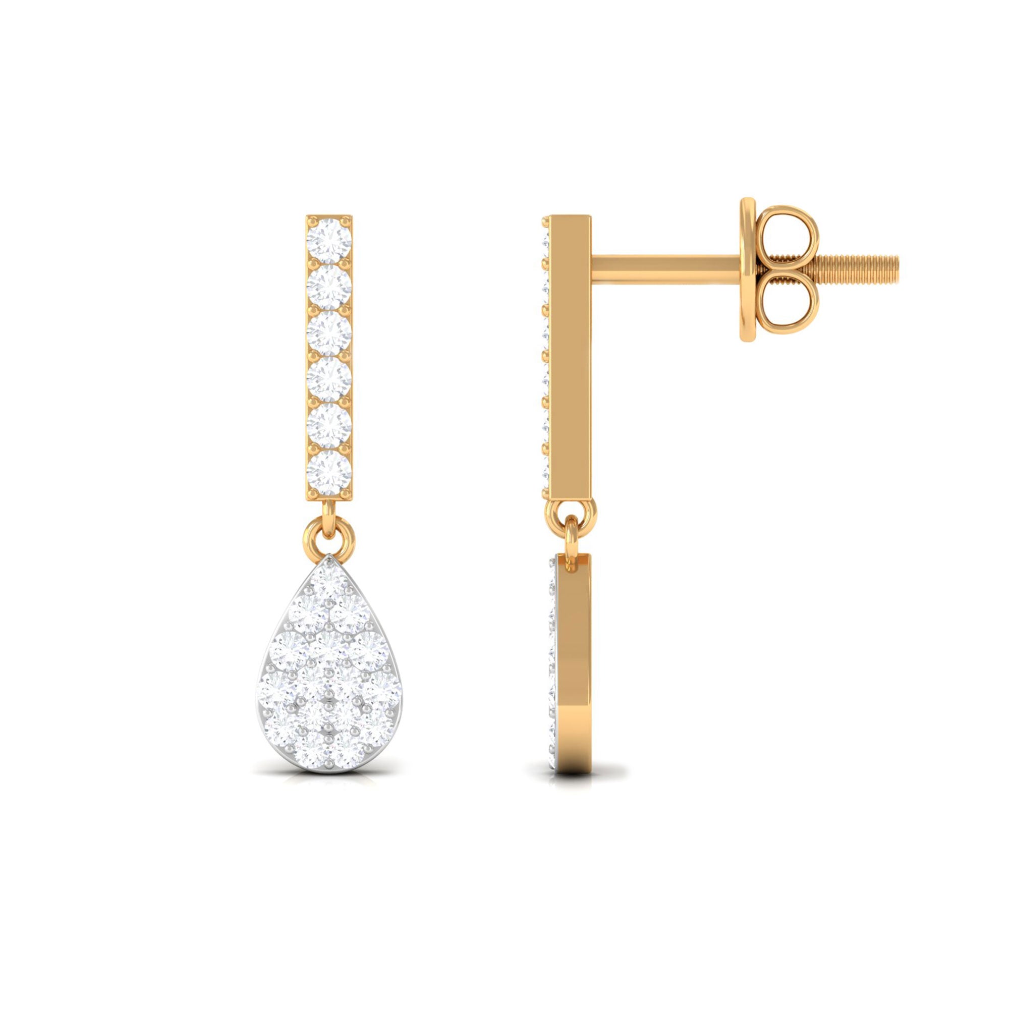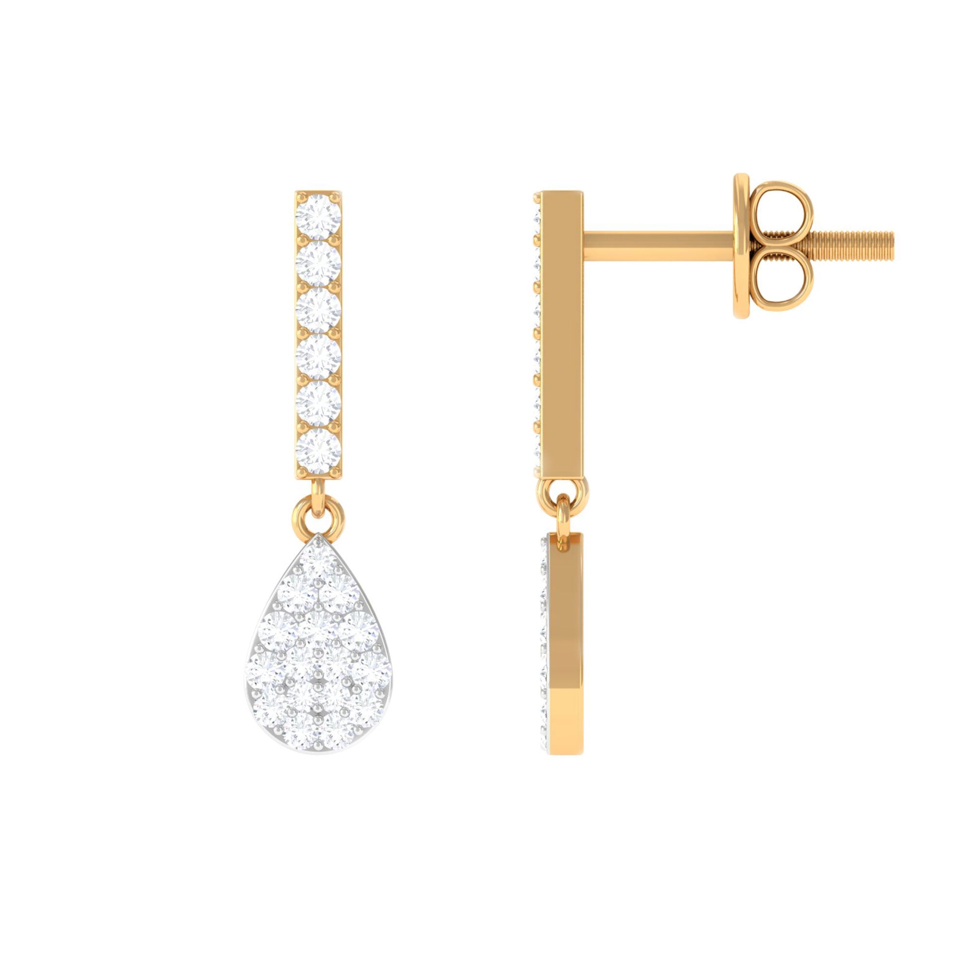 Make your days sparkle with these Shining Moissanite Dangle Earrings. These Moissanite earrings feature a dangle pattern adorned with round Moissanite in a pave setting, held in place by a screw back. Crafted from gold, these dangle drop earrings radiate a brilliant shine that will catch the eye and enhance your appearance. Add these dazzling earrings to your collection for a touch of glamour and elegance.