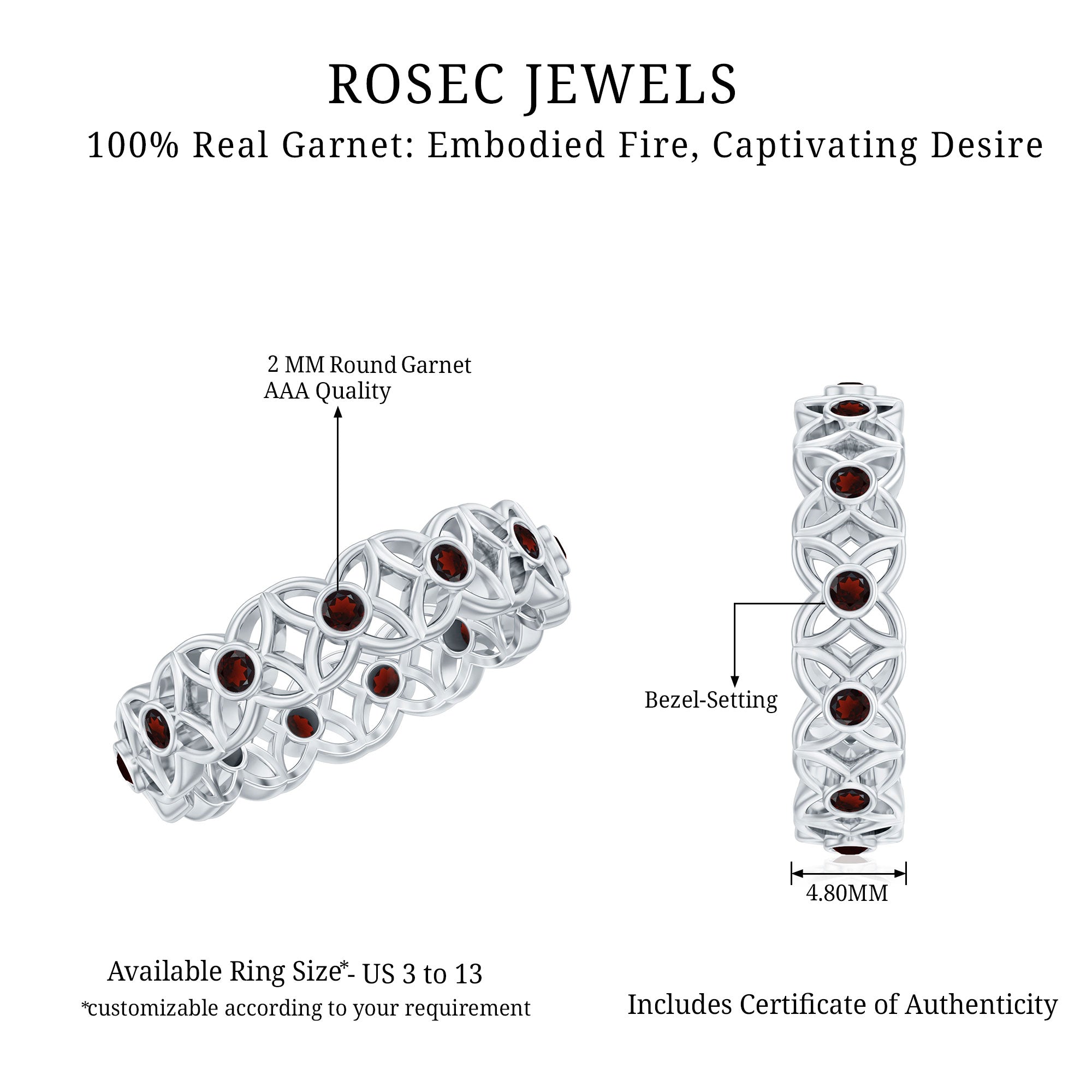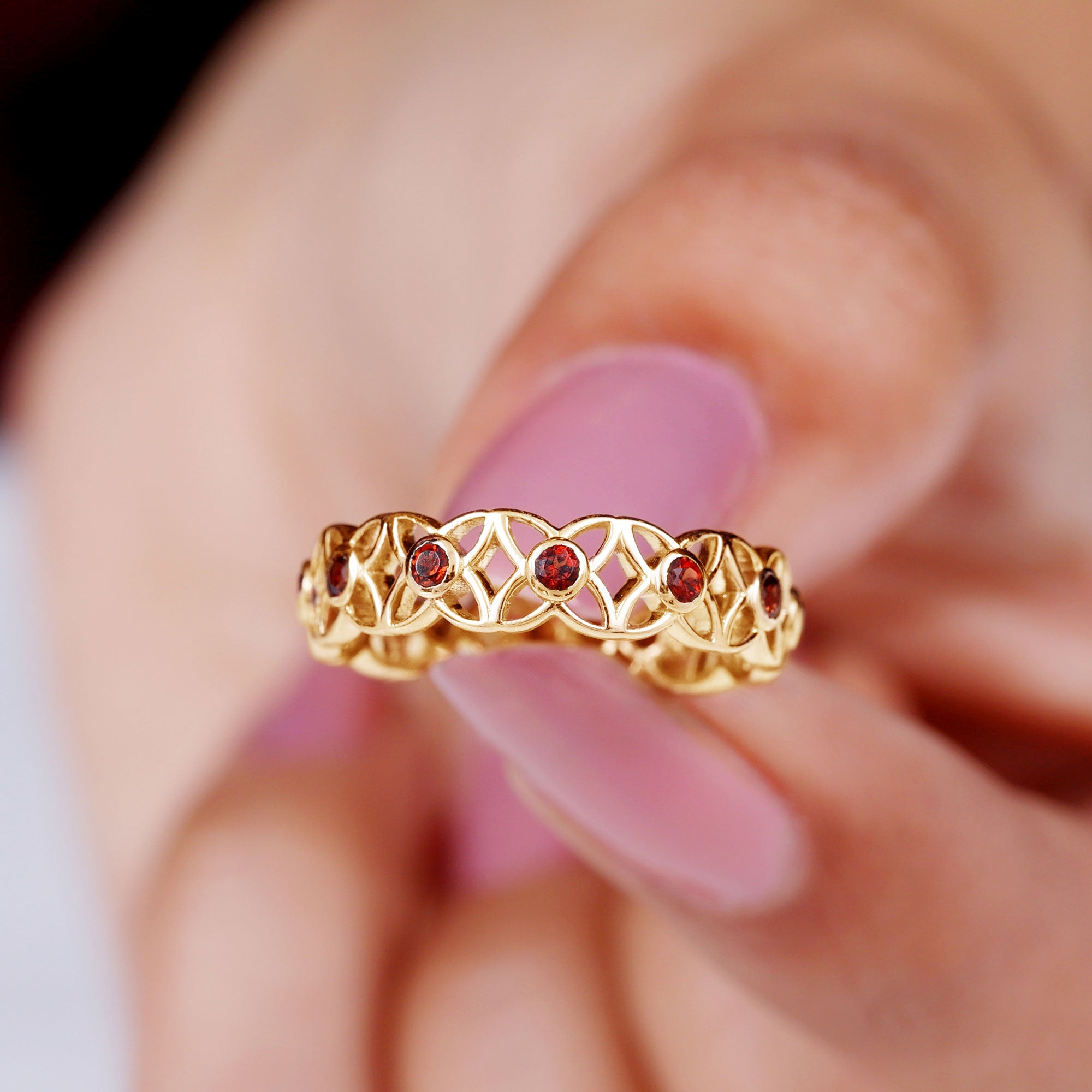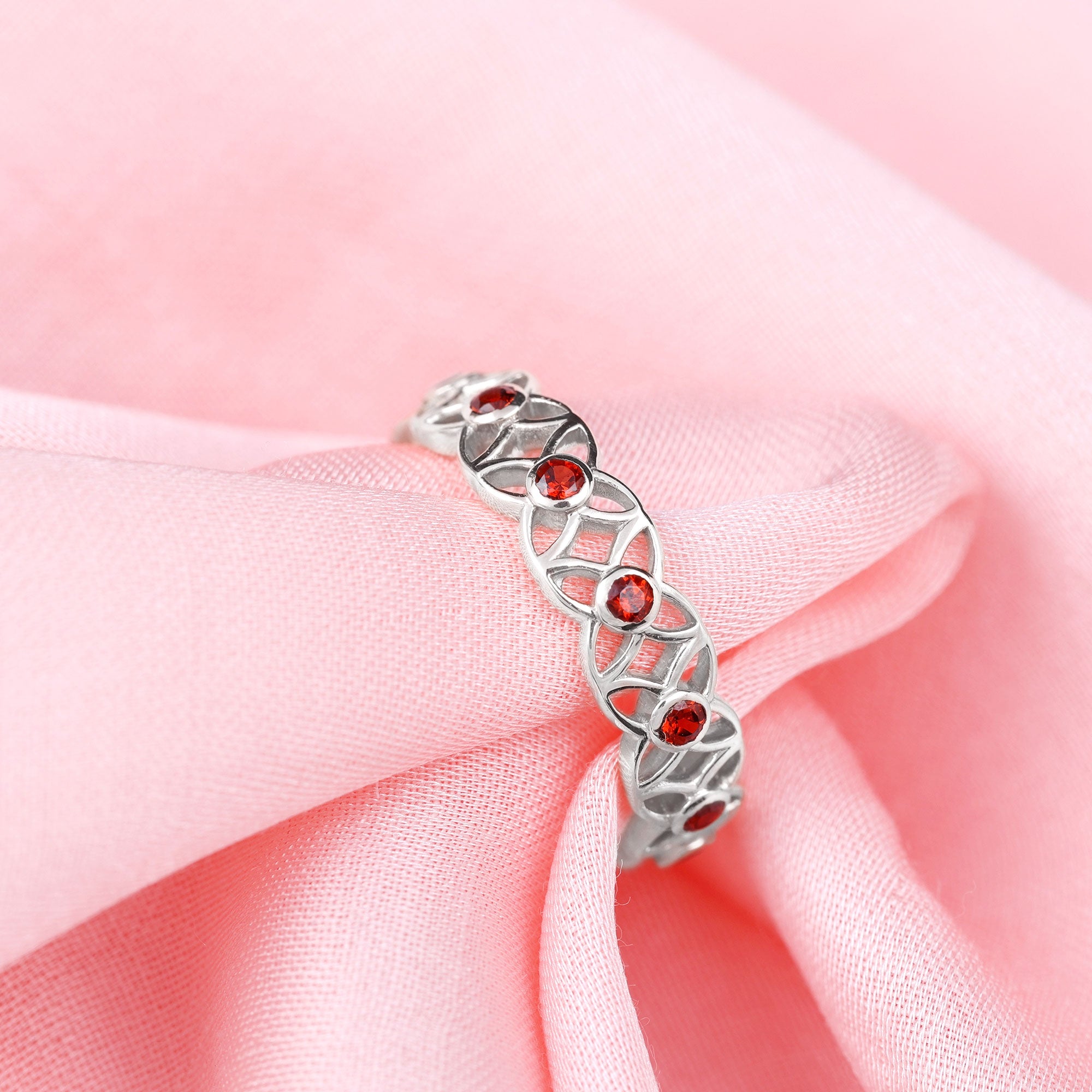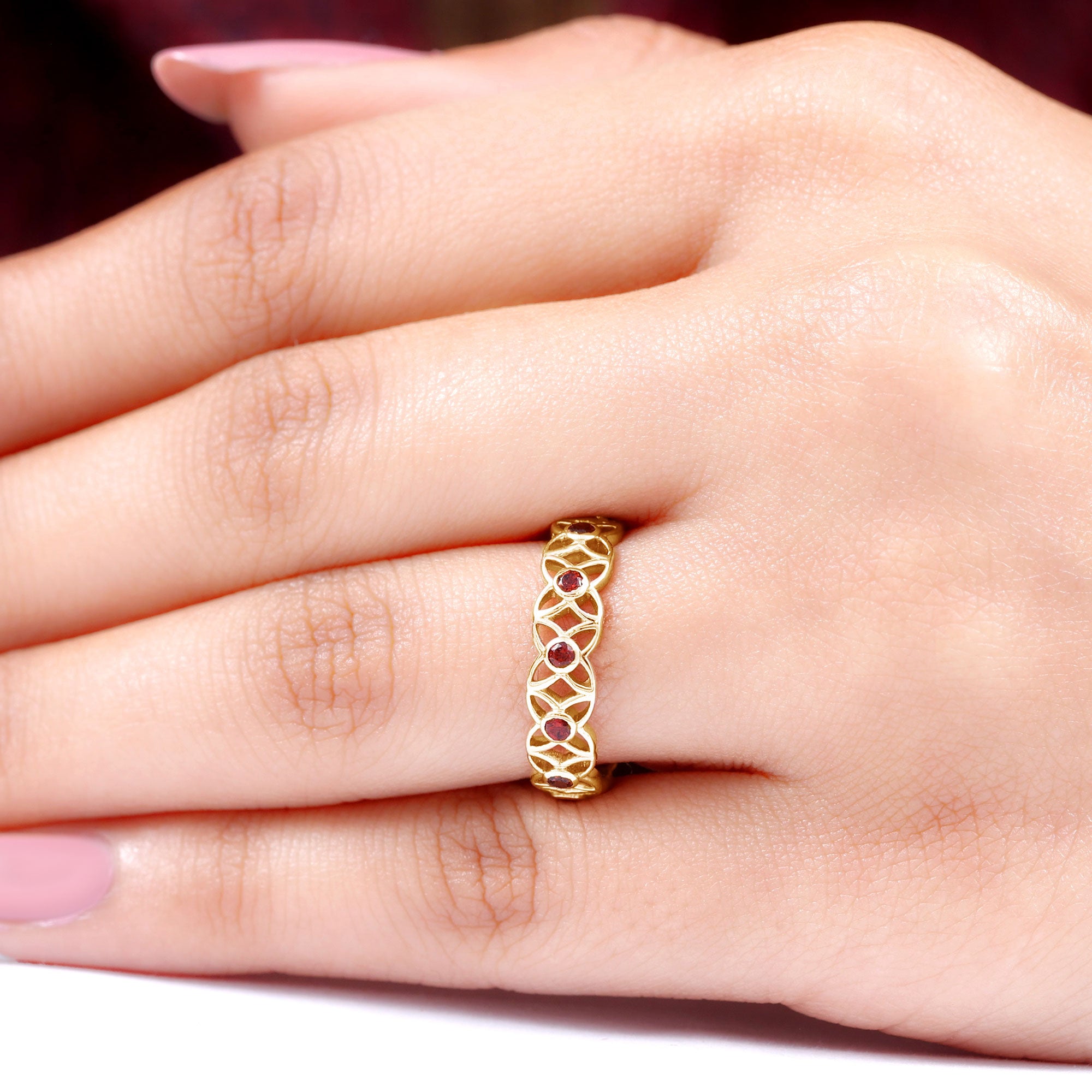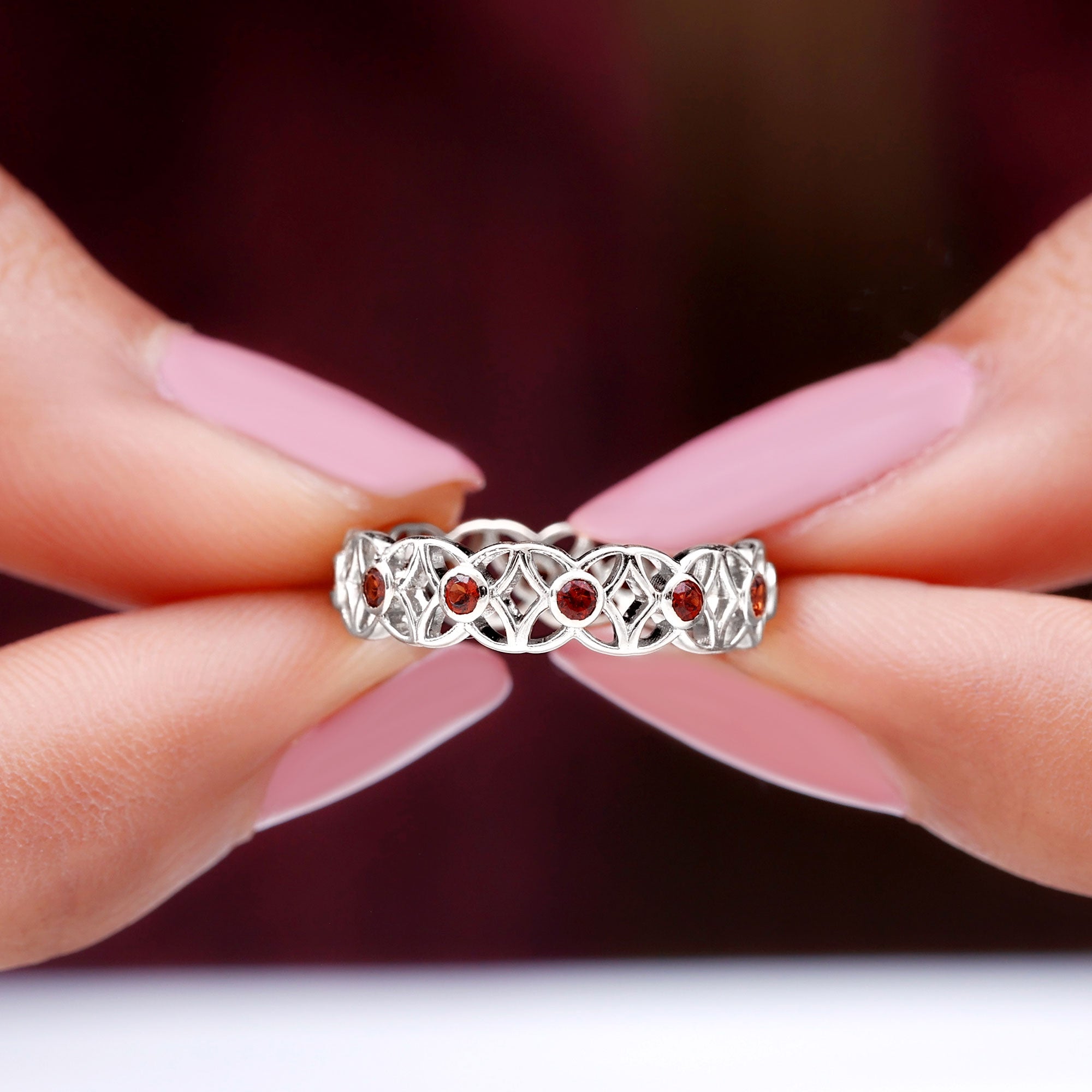 Inspired by the delicate beauty of blooming flowers, this Flower Wedding Band captures the essence of romance and timeless elegance. Each Flower is adorned with a vibrant 2 mm Round Shape Garnet at its center, creating a stunning display of deep red sparks that symbolize passion, love and devotion. The intricate floral design wraps gracefully around the finger, making this Garnet Wedding Band a perfect choice for someone who loves romantic details with a modern twist. Available in various ring sizes and presented in a signature jewelry box, this Garnet Eternity Band is ready to be gifted to celebrate weddings, anniversaries or milestones that deserve to be cherished forever. Beyond its striking beauty, this Eternity Wedding Band tells a story of love that blooms endlessly. Elegant, romantic and full of charm, it is a symbol of eternal affection and the joy of a love that continues to flourish.