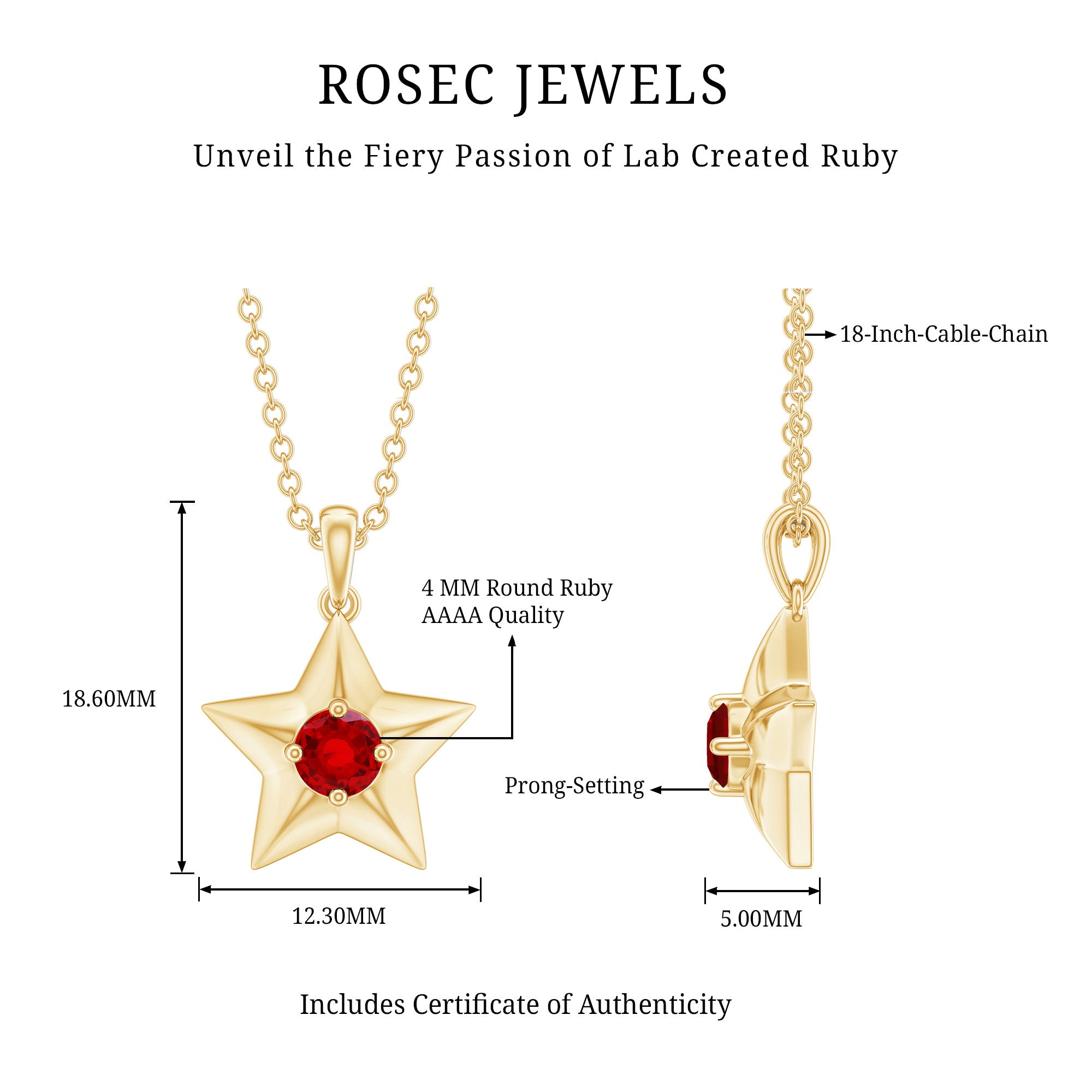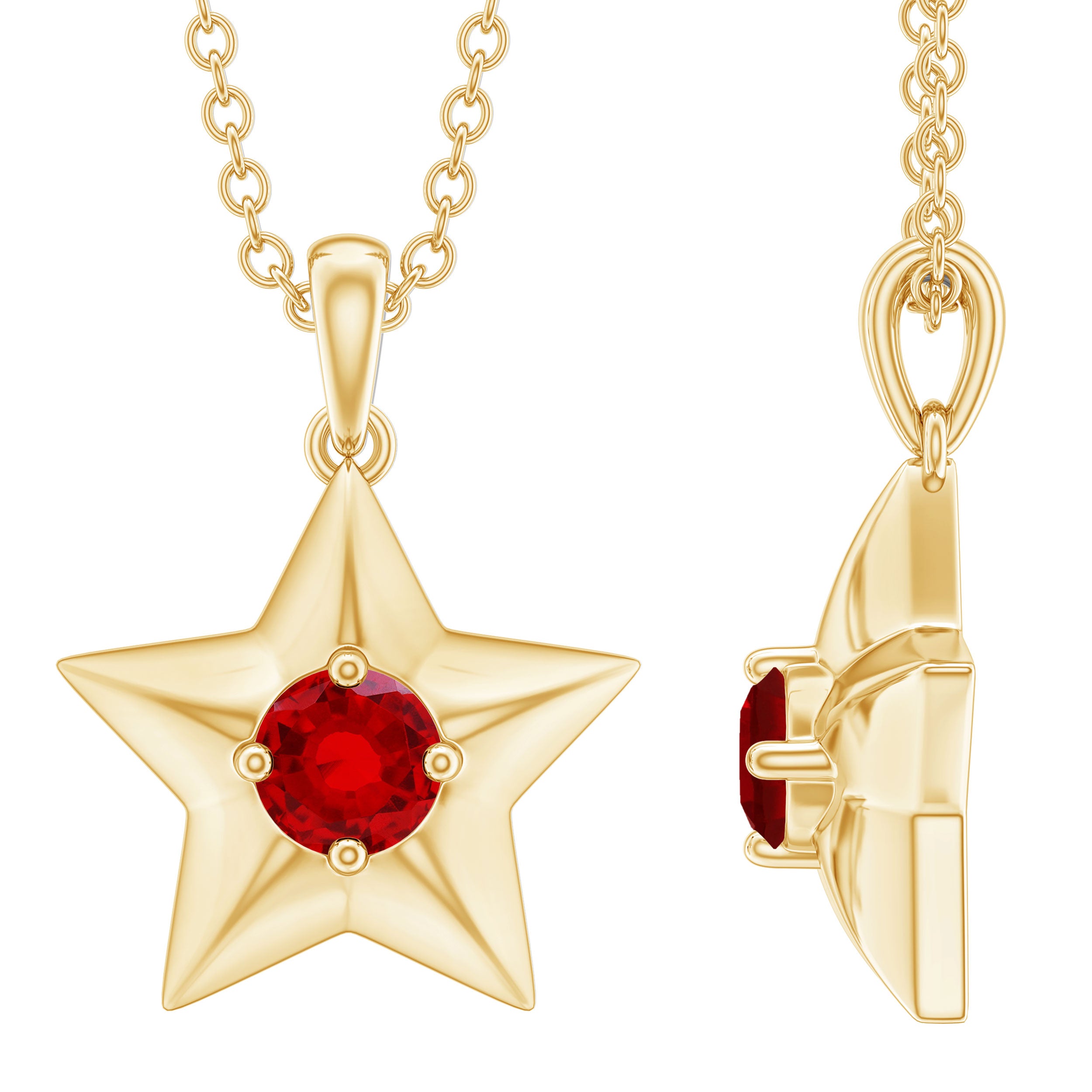 Elevate your style with this exquisite Star Pendant adorned with a dazzling Round Shape Created Ruby gemstone. The Created Ruby Gold Star Pendant is a one-of-a-kind piece that will add a touch of sophistication to any outfit. Perfect for a woman who wants to stand out from the crowd and express her individuality. Get yours today and let it shine bright like a star.
