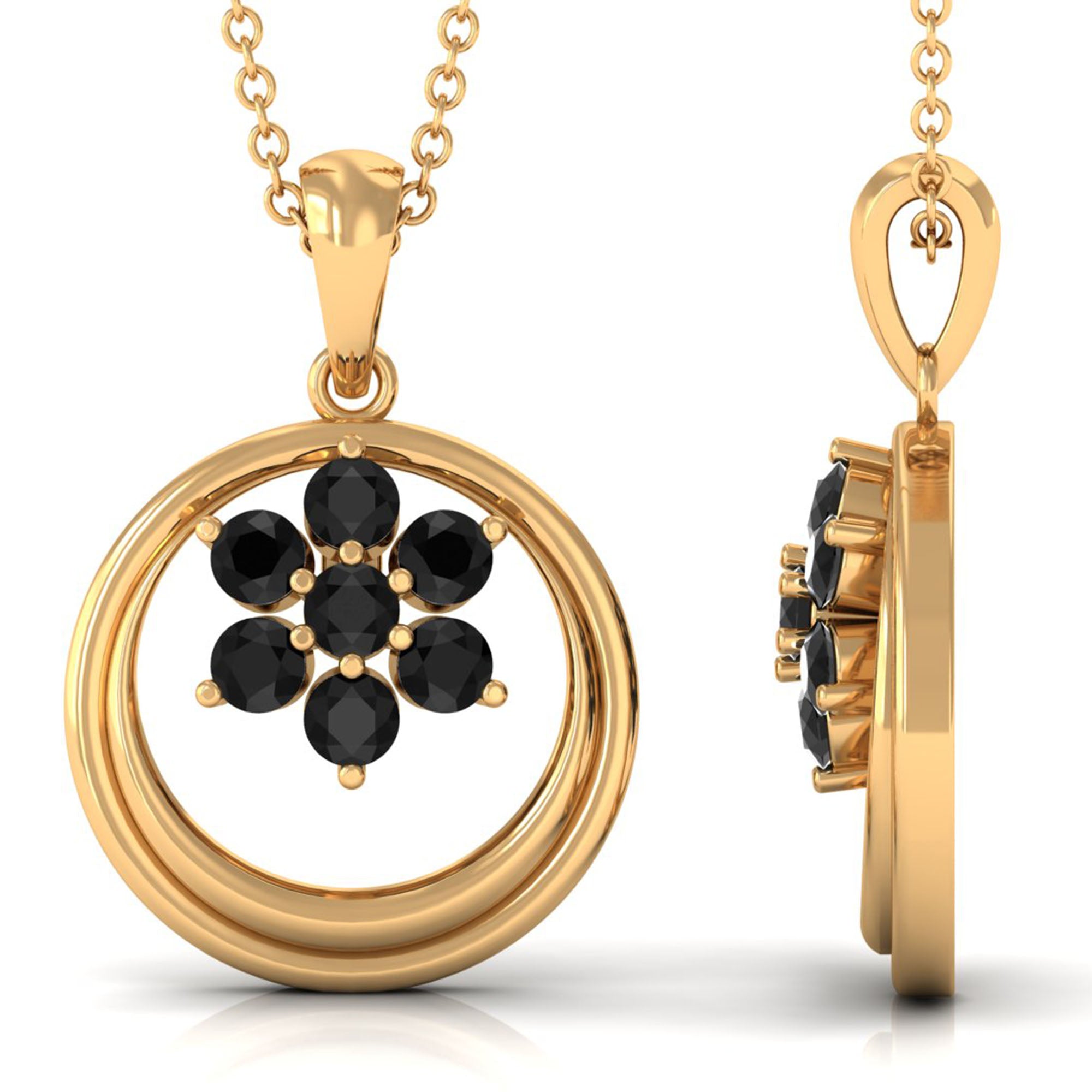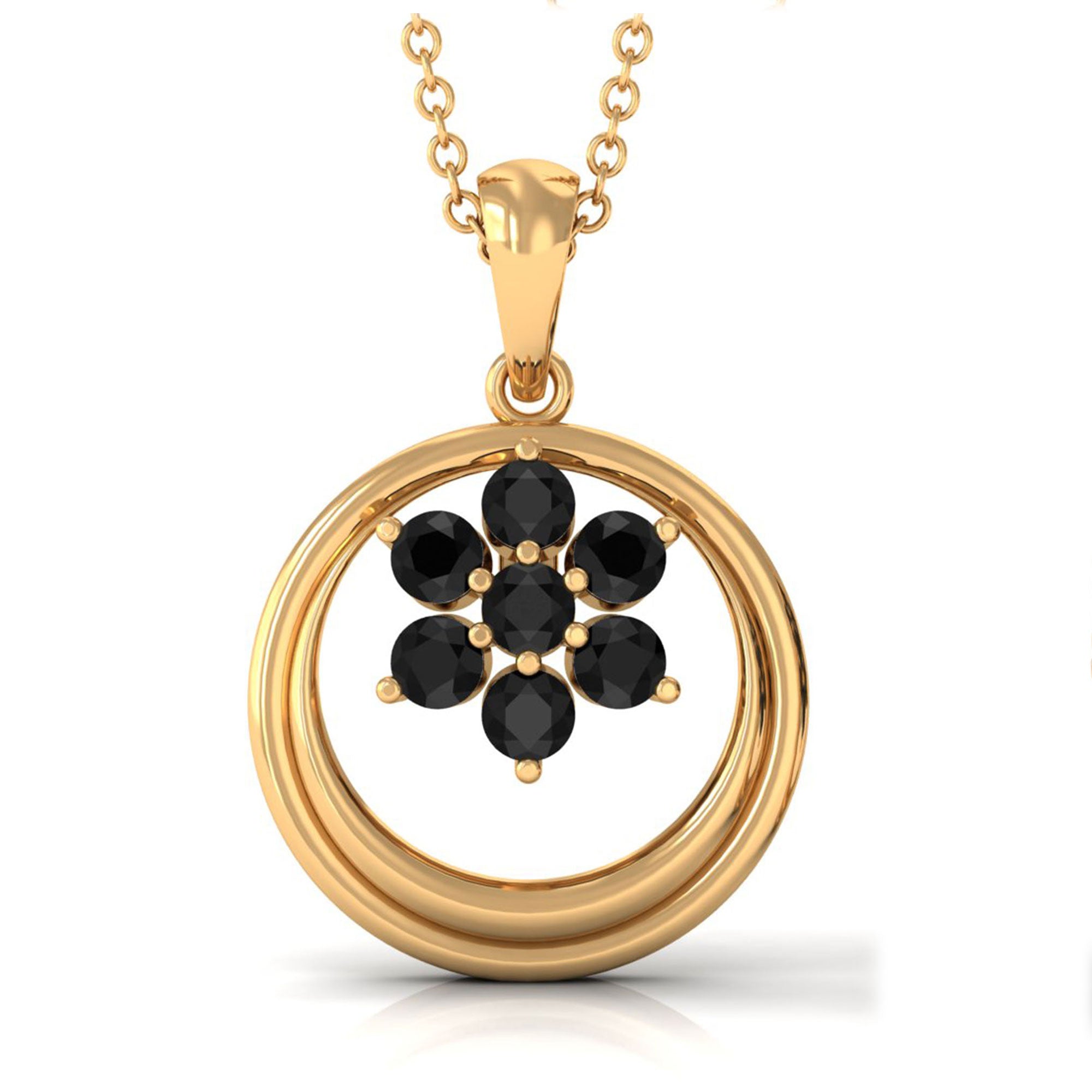 Black Spinel Cluster Flower Pendant is securely covered by Solid Gold, which Makes a Black Spinel Pendant Piece. The bold and lavish design will steal your heart Black Spinel Pendant Necklace is all you need to rock the party. The Black Spinel Cluster is surrounded by Open Gold Circle giving it a pristine look.