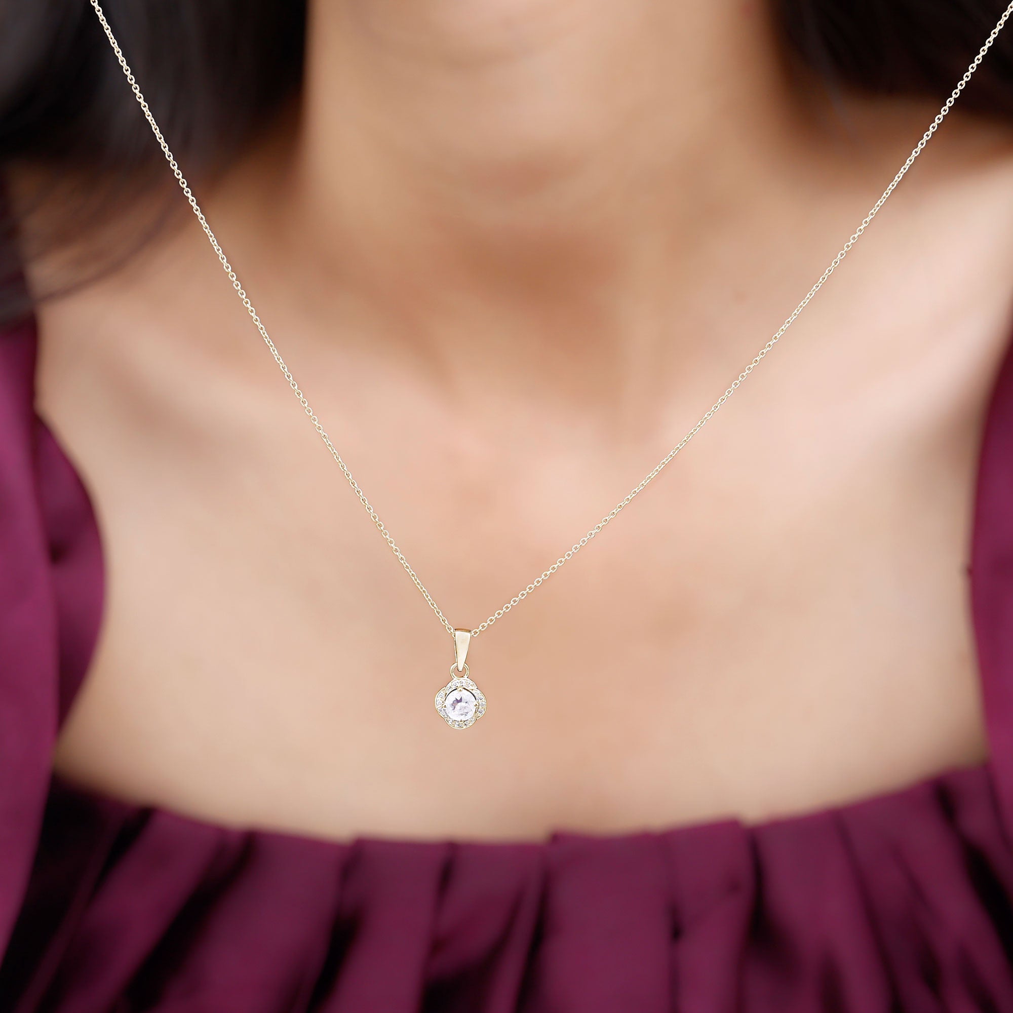 Be Dazzle with this Beautiful Gold Flower Pendant embellished with Round Shape Moonstone and Diamond set in Prong Setting. This Gold Drop Pendant Necklace is Composed of Solid Gold.