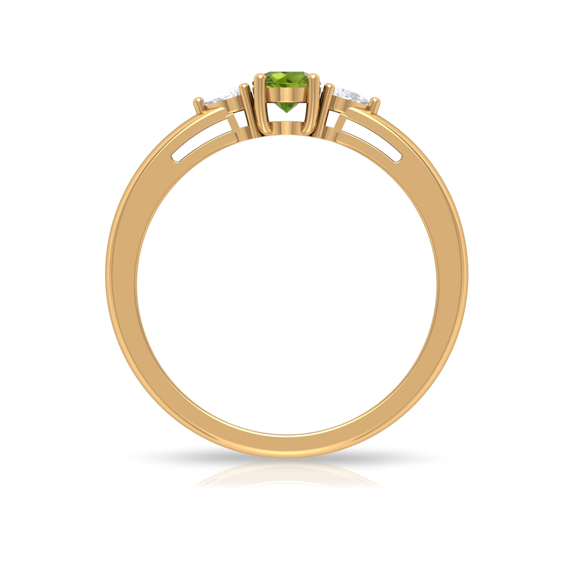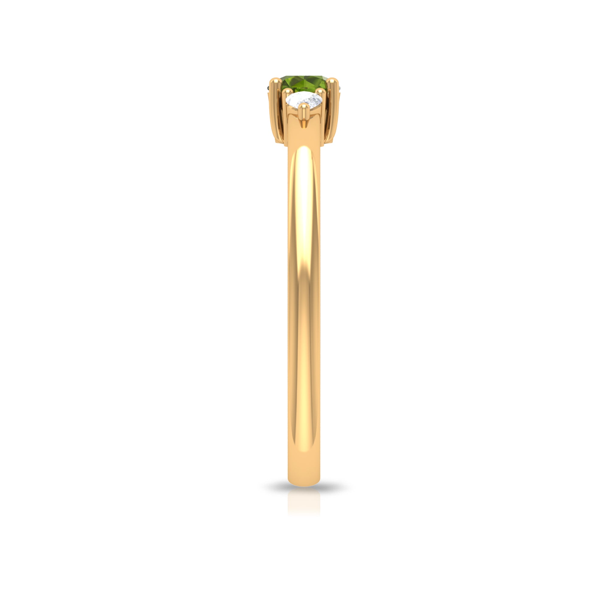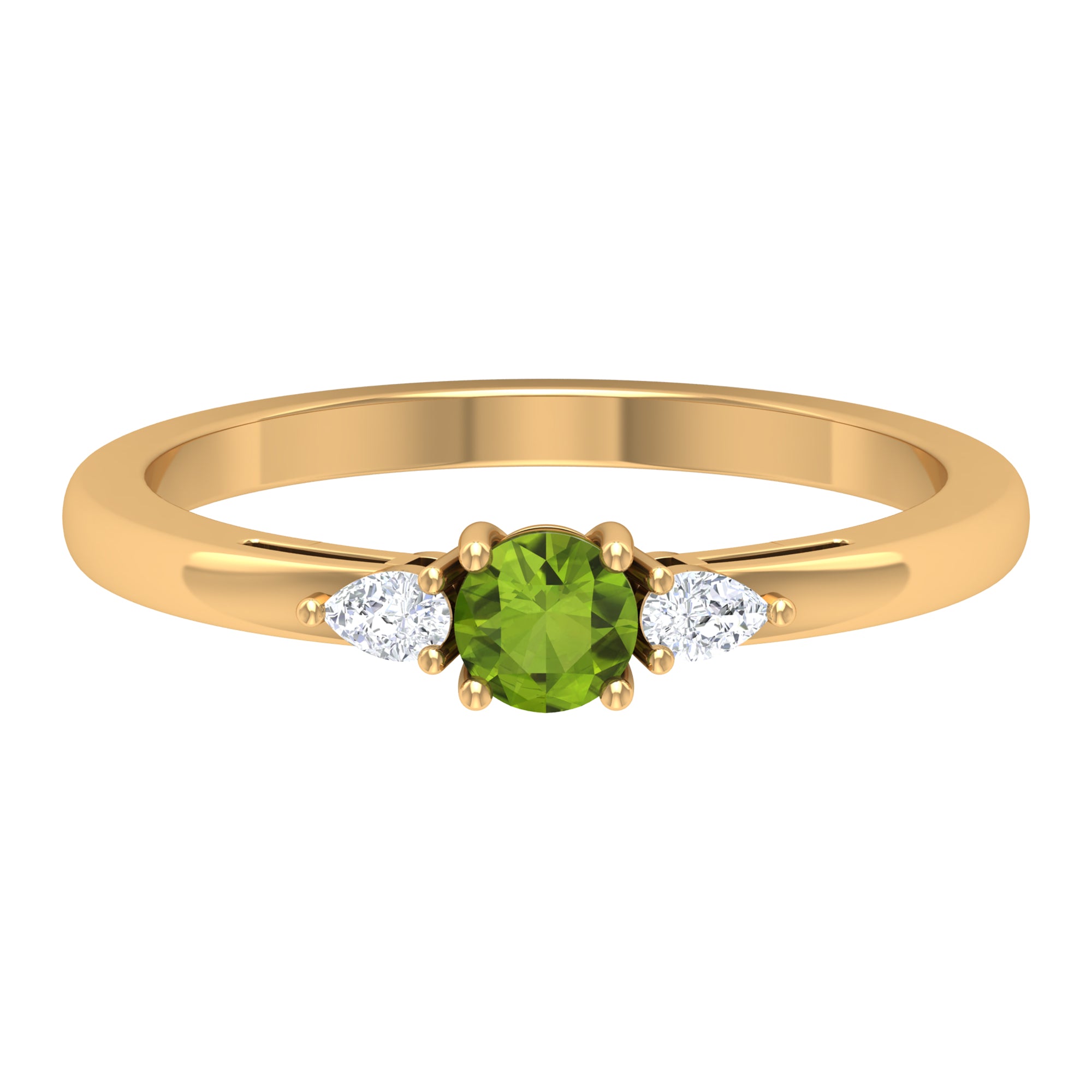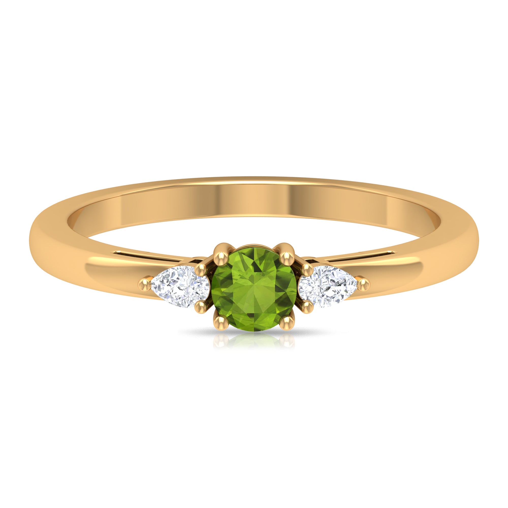Bring more love, warmth, and grounding into your life with this symbolic Peridot Three Stone Ring. The ring features a round-cut peridot at the center and is accented with two Diamond stones on the sides. Ideal for August-born women, this ring is made from solid gold for a touch of luxury. Embrace the greenery and sparkle of life with this beautiful piece.