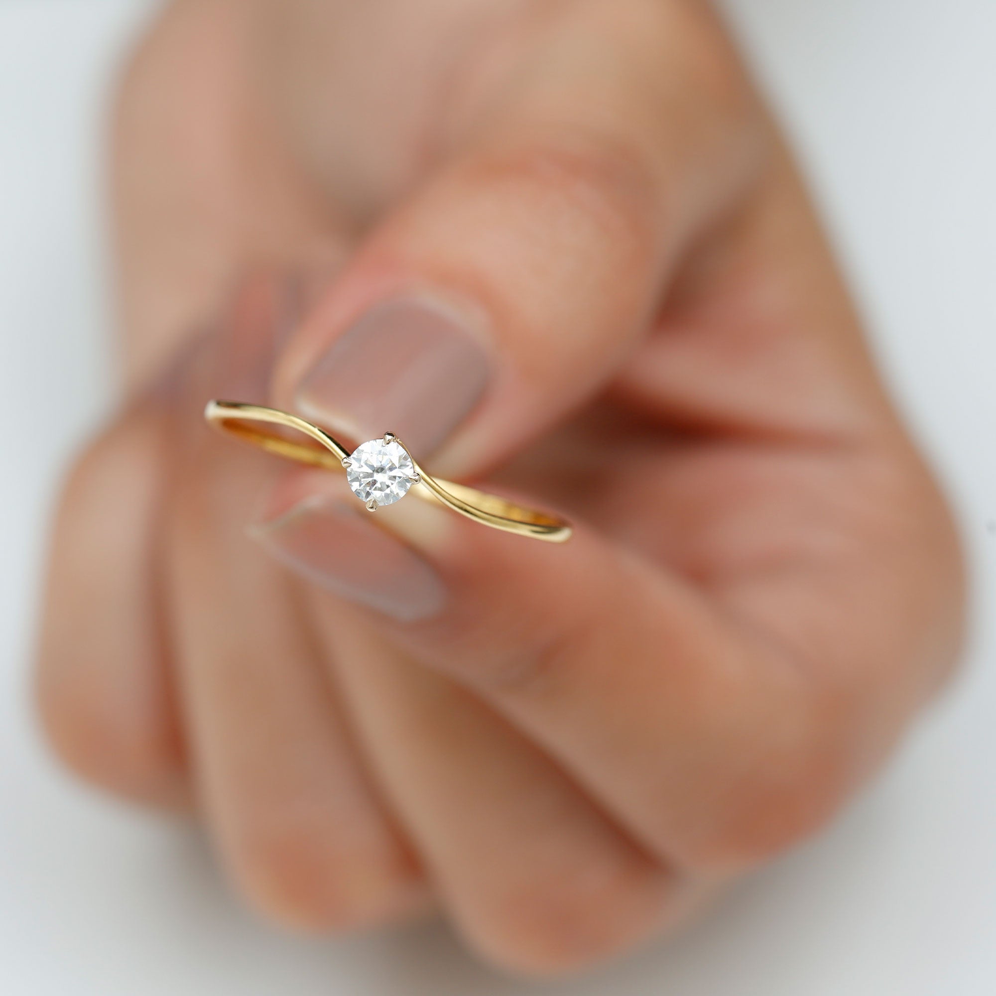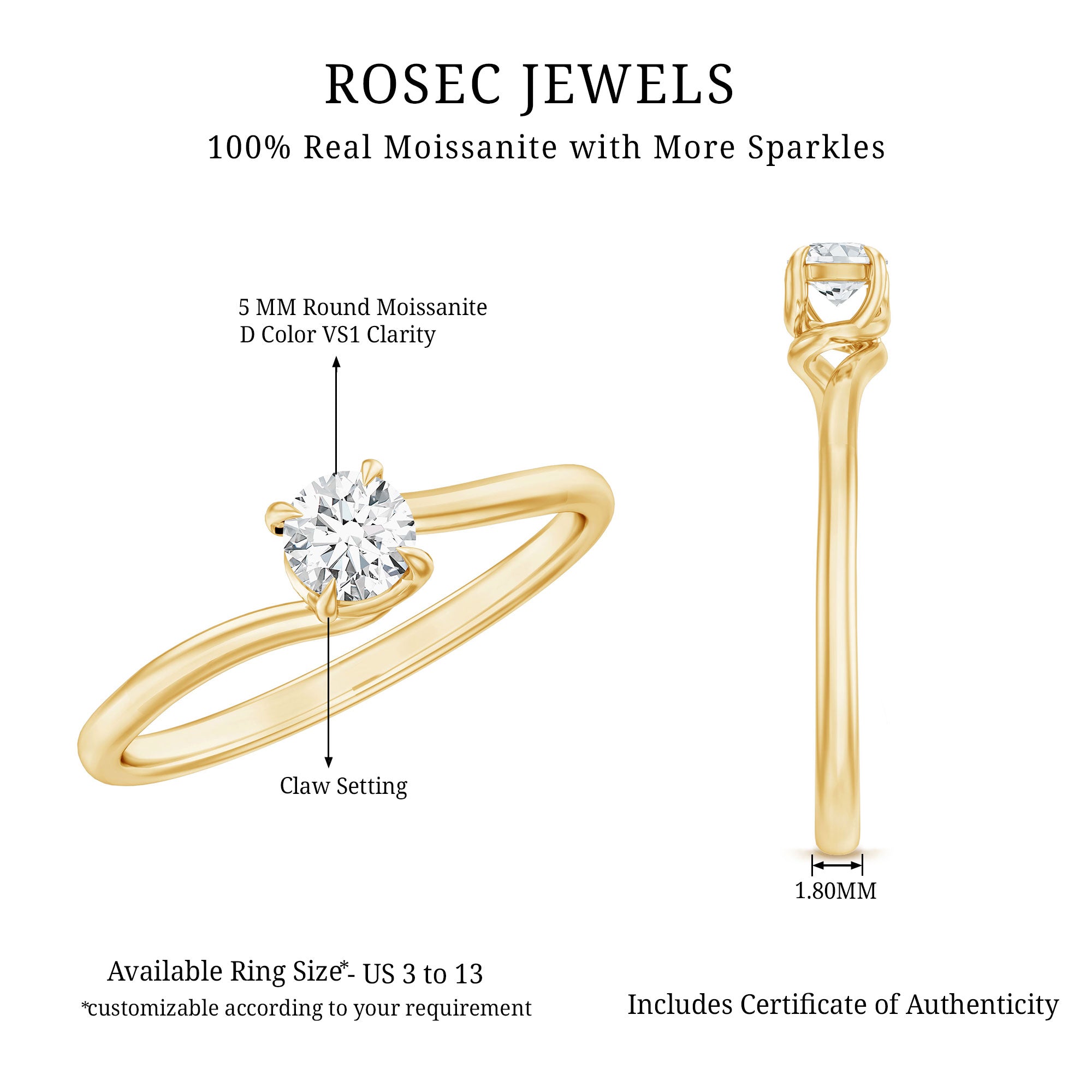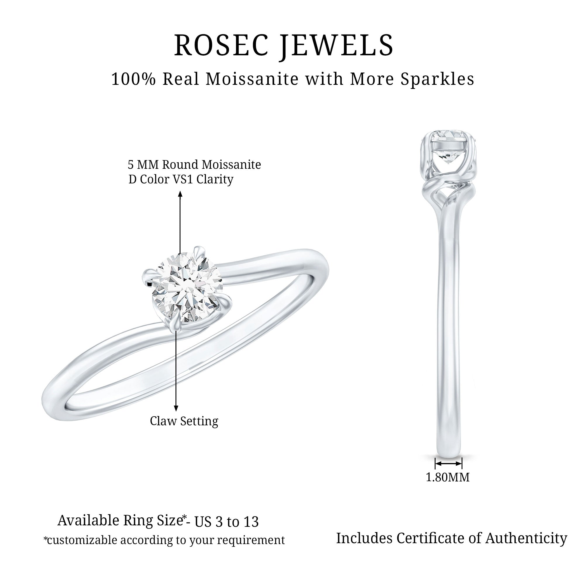 This gorgeous Solitaire Promise Ring elegantly merges timeless design with a growing commitment. Express your deepening affection with this Moissanite Promise Ring for Her, which boasts a simple yet enduring design, beautifully enhanced by a distinctive bypass shank that represents the wonderful journey of two souls uniting. This charming Commitment Ring features a 5 MM round shaped moissanite set in a 4-Claw-Prong-Twist-Setting. Highlighting the clarity and brilliant cut of a D-VS1 Quality Moissanite, it truly sparkles with breathtaking beauty, making it perfect for an unconventional romance. Celebrate your commitment with this Moissanite Bypass Ring, whose graceful design captures attention while maintaining a subtle and enchanting glow. This exquisite Womens Moissanite Ring will elevate any ensemble, adding a touch of refined shine and elegance. Furthermore, it is offered in a variety of metal colors and purity options, allowing you to select what best fits your style.