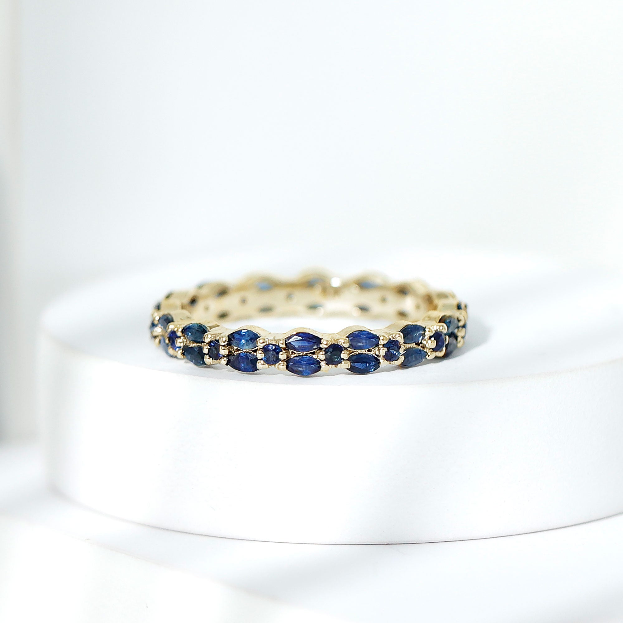 This full eternity ring features blue sapphire gemstones arranged around the band in a combination of marquise and round shapes. The alternating forms create a dynamic pattern that highlights both the color and brilliance of the gemstones.