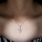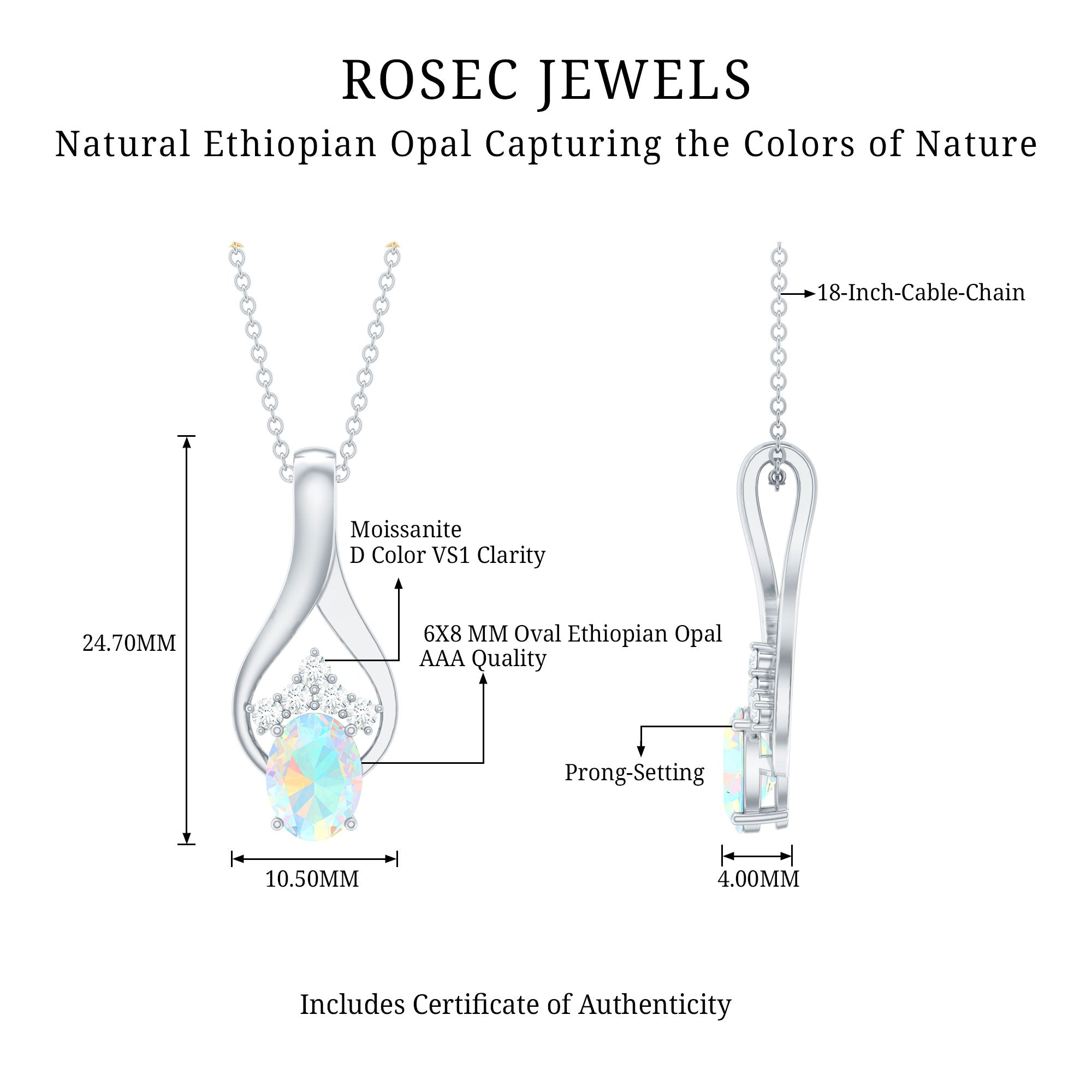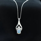 Dangling gracefully from an exquisite metal design is a captivating teardrop pendant necklace showcasing an oval-shaped Ethiopian Opal. The opal is securely held in place by delicate prongs, allowing its natural beauty to shine through. Surrounding the opal are shimmering round moissanite stones, forming a dazzling crown that effortlessly captures everyones attention.