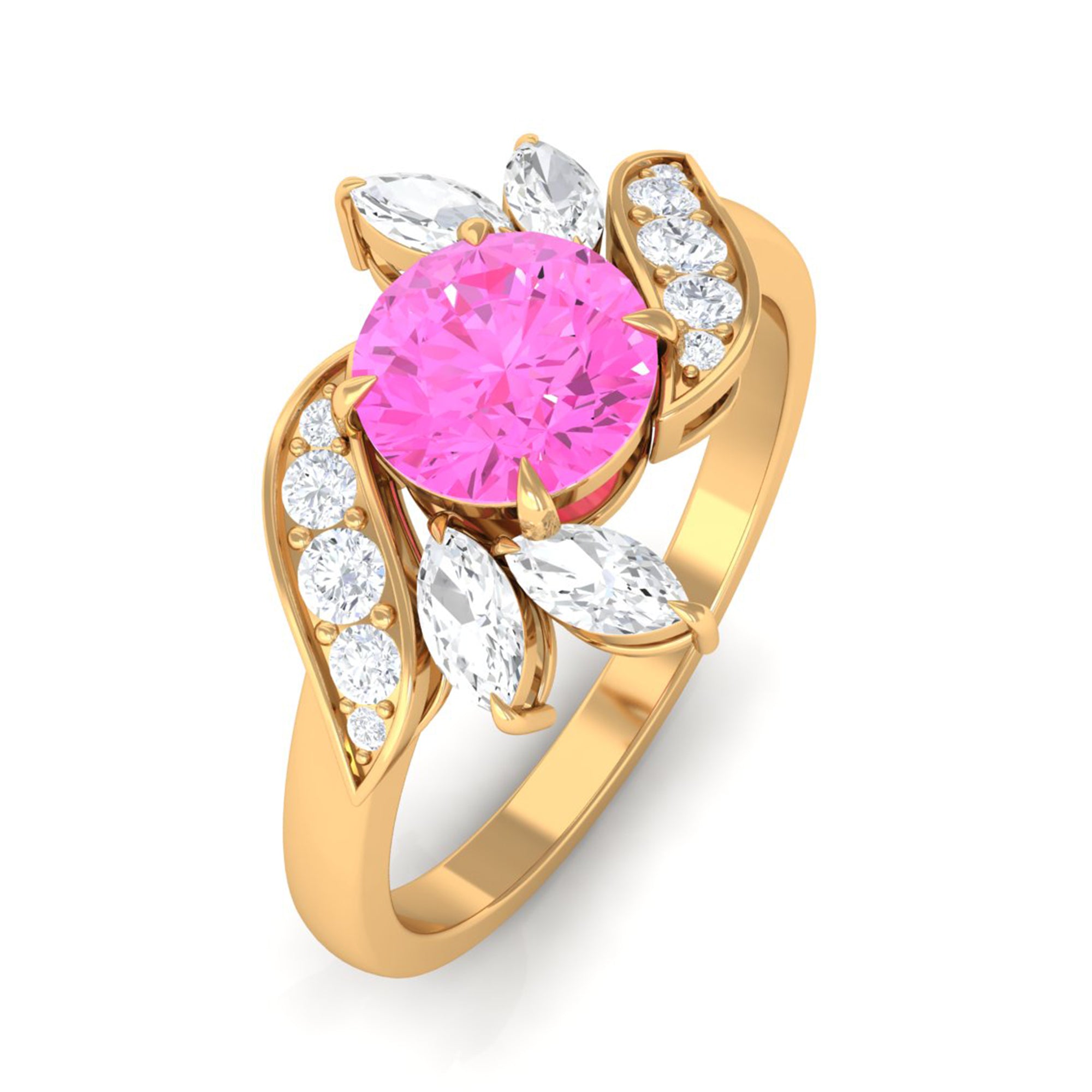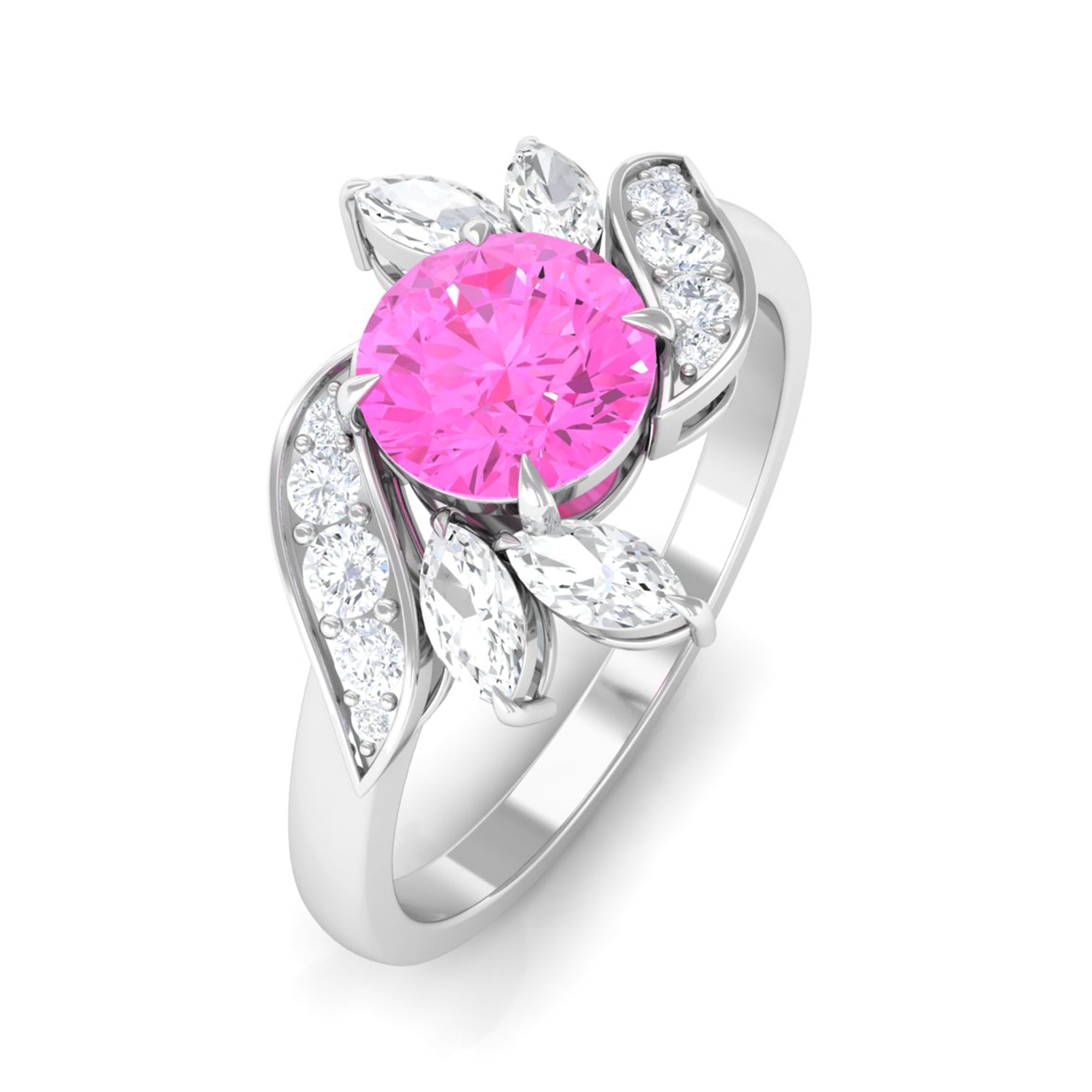 Every moment of yours is worth celebrating, so why not celebrate it with an alluring fine jewelry. This Pink Sapphire Engagement Ring is exactly what your are looking for your partner, Round Pink Sapphire and Marquise Diamond is held in Claw Setting and Round Diamond is held in prong setting are featured in leaf pattern. Show your love to your partner with this Vintage Pink Sapphire Ring.