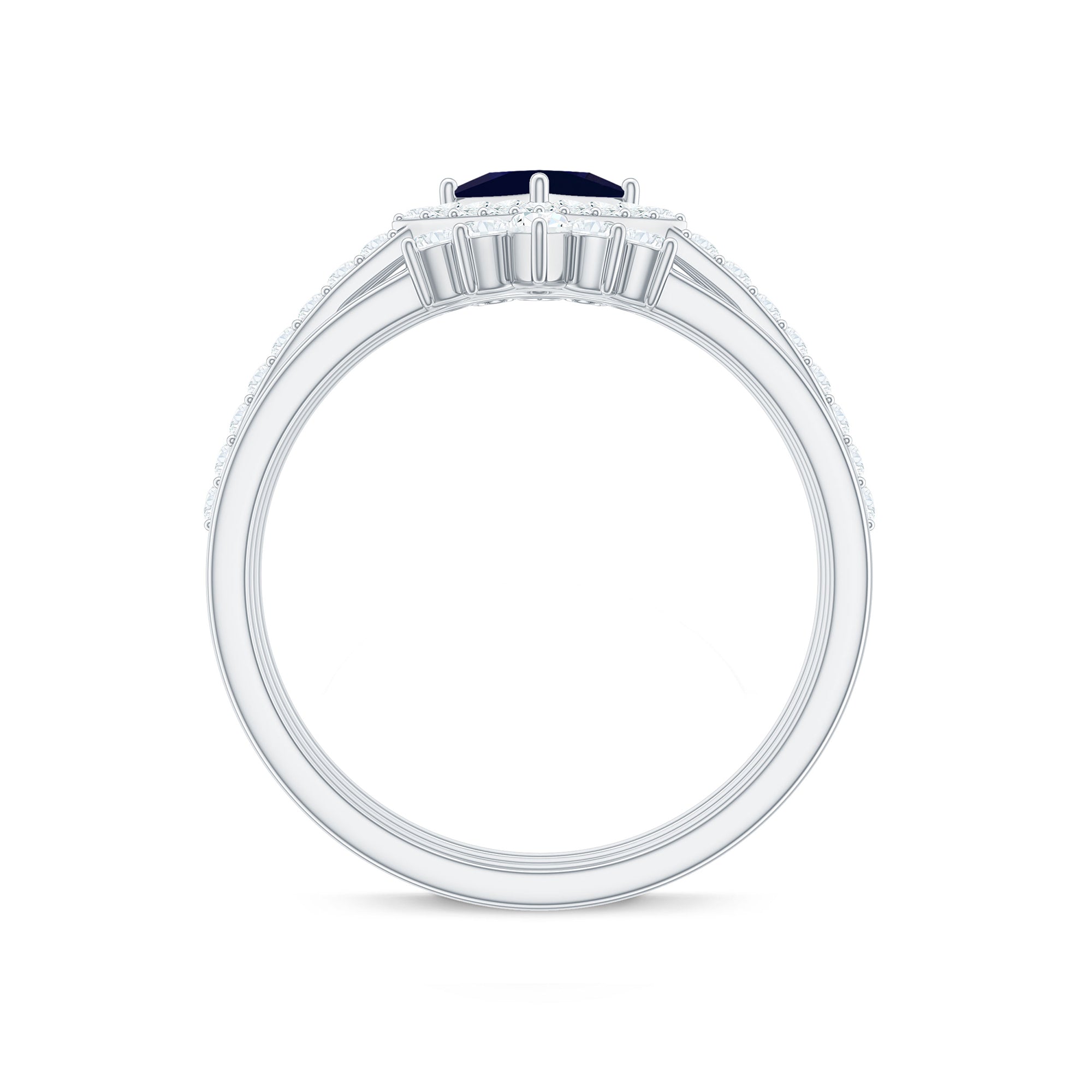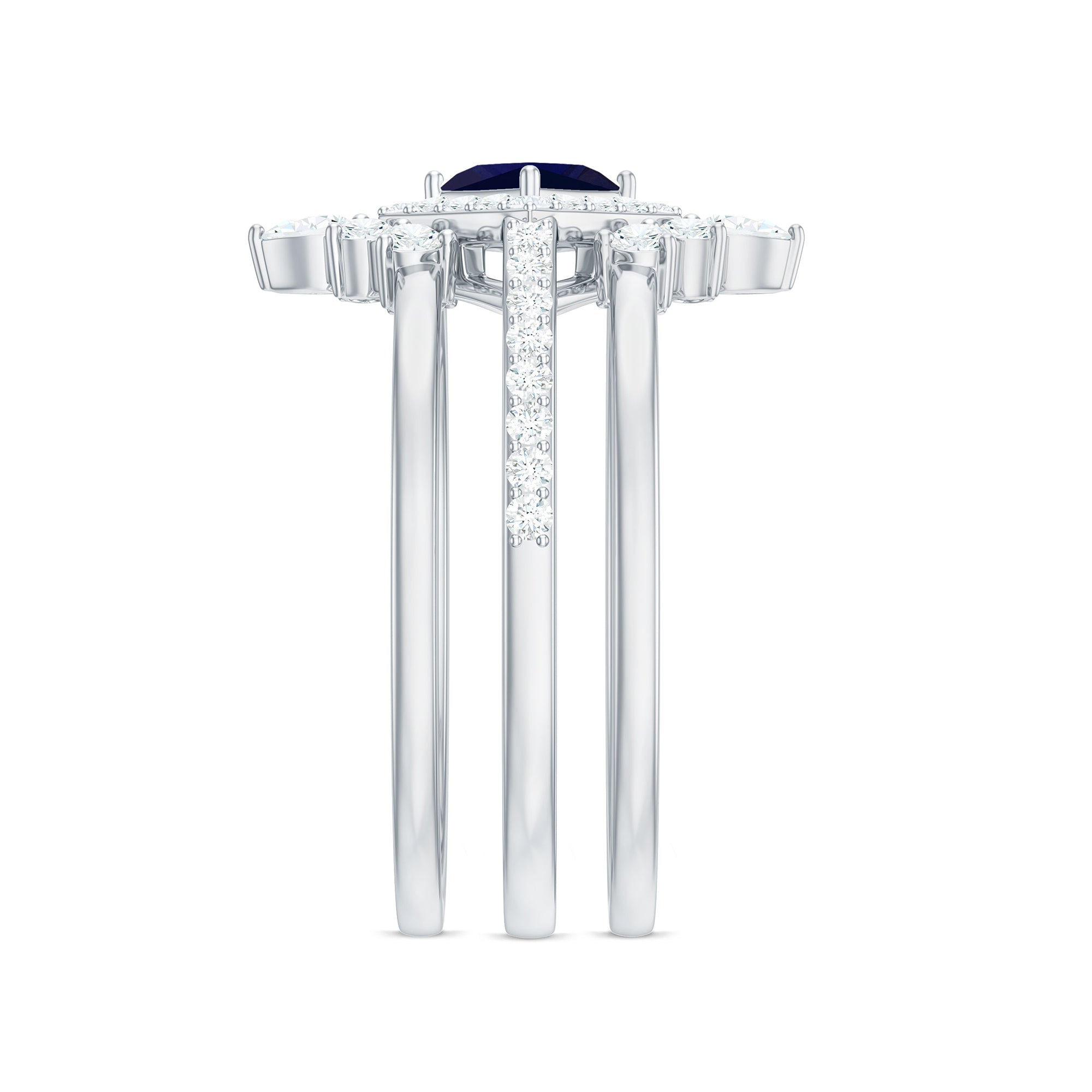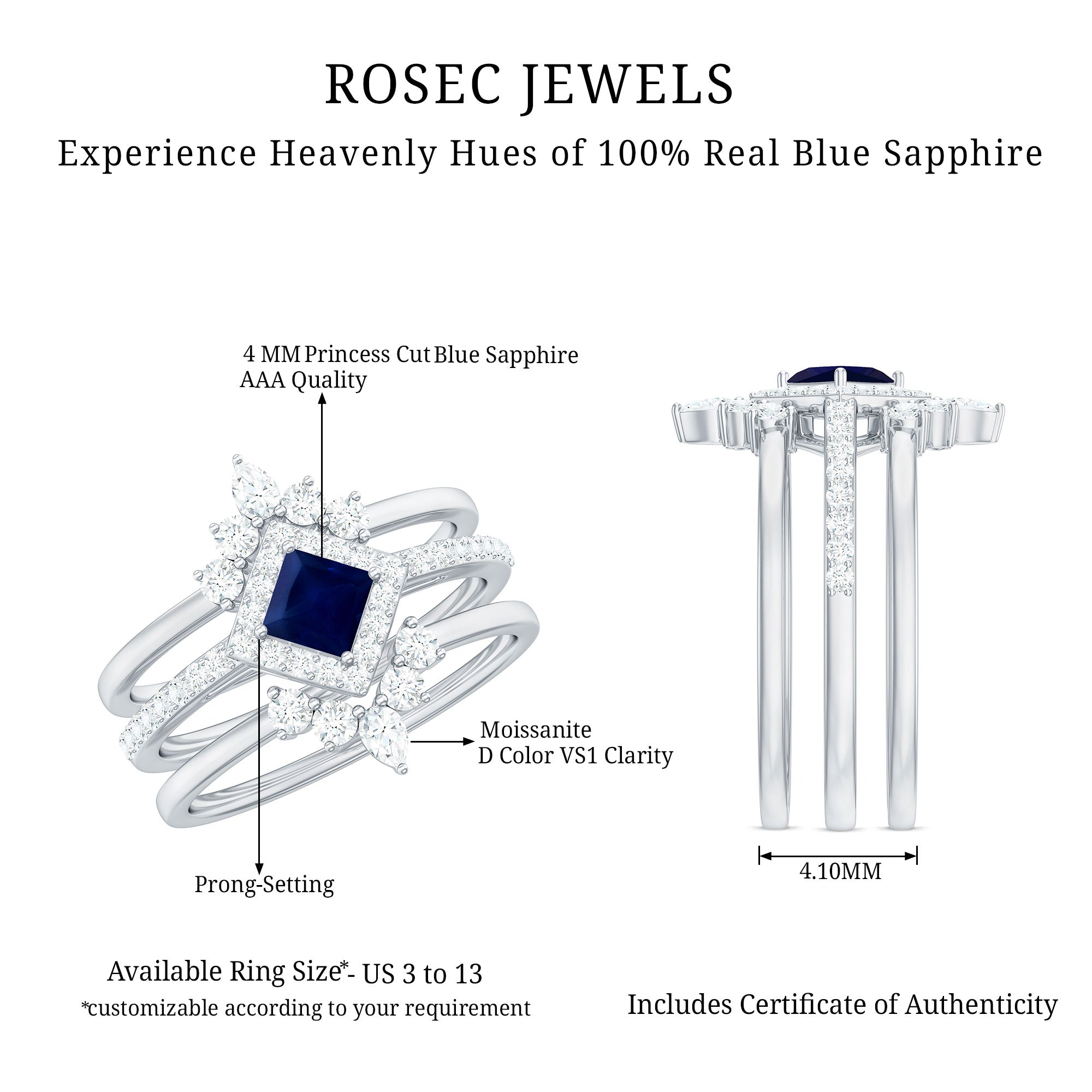 1.5 CT Princess Cut Blue Sapphire Bridal Ring Set with Moissanite Halo