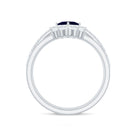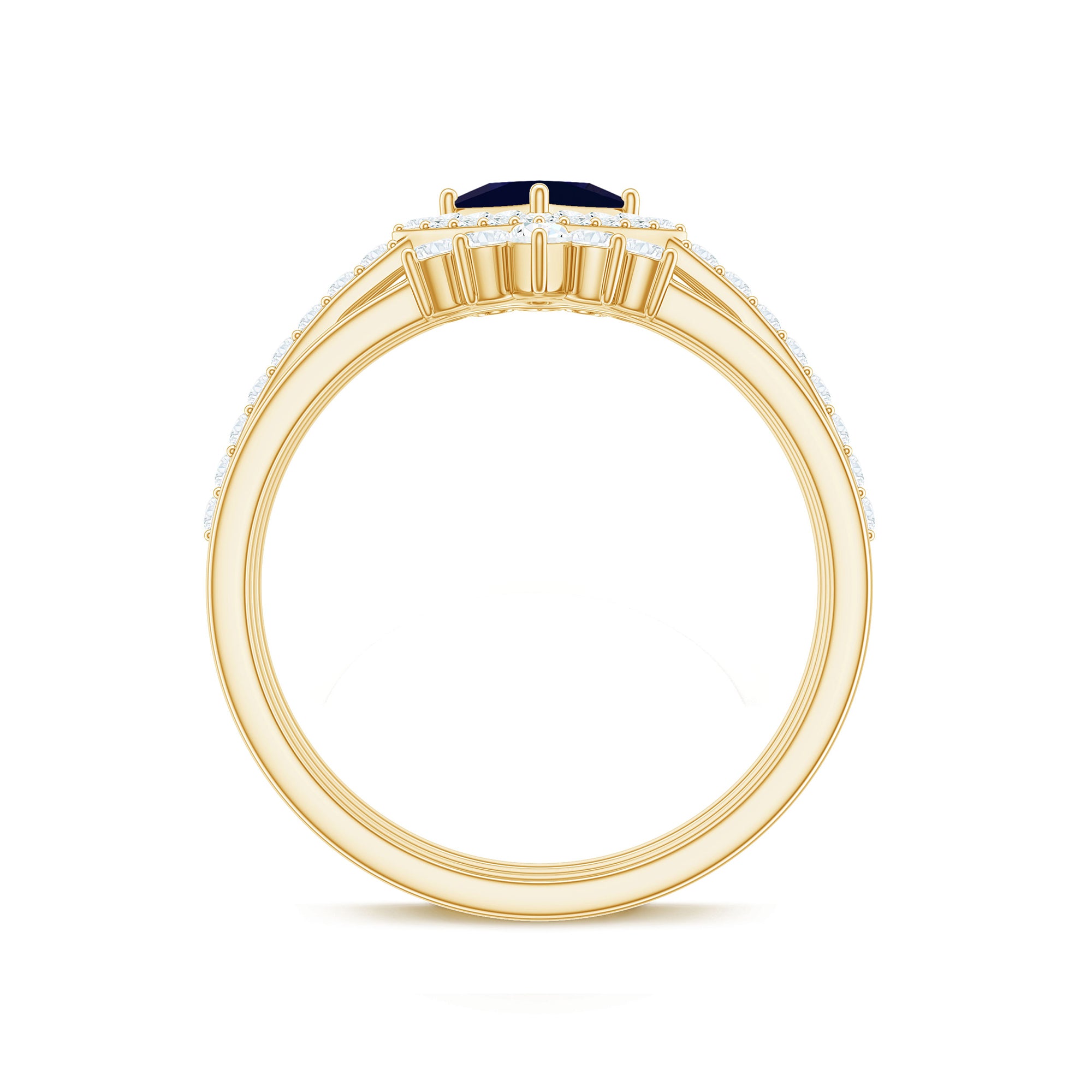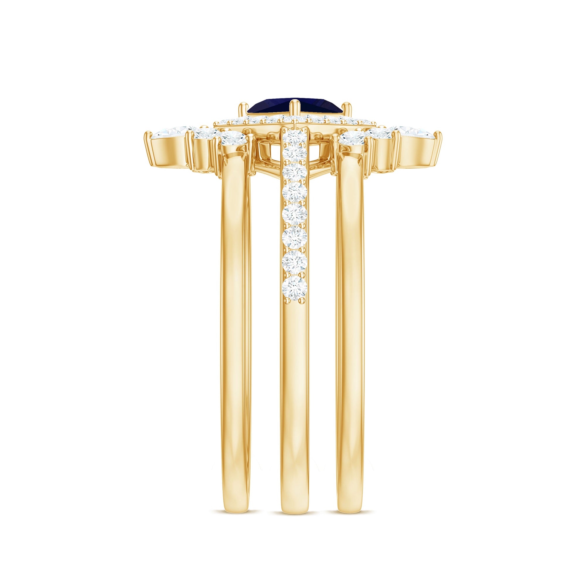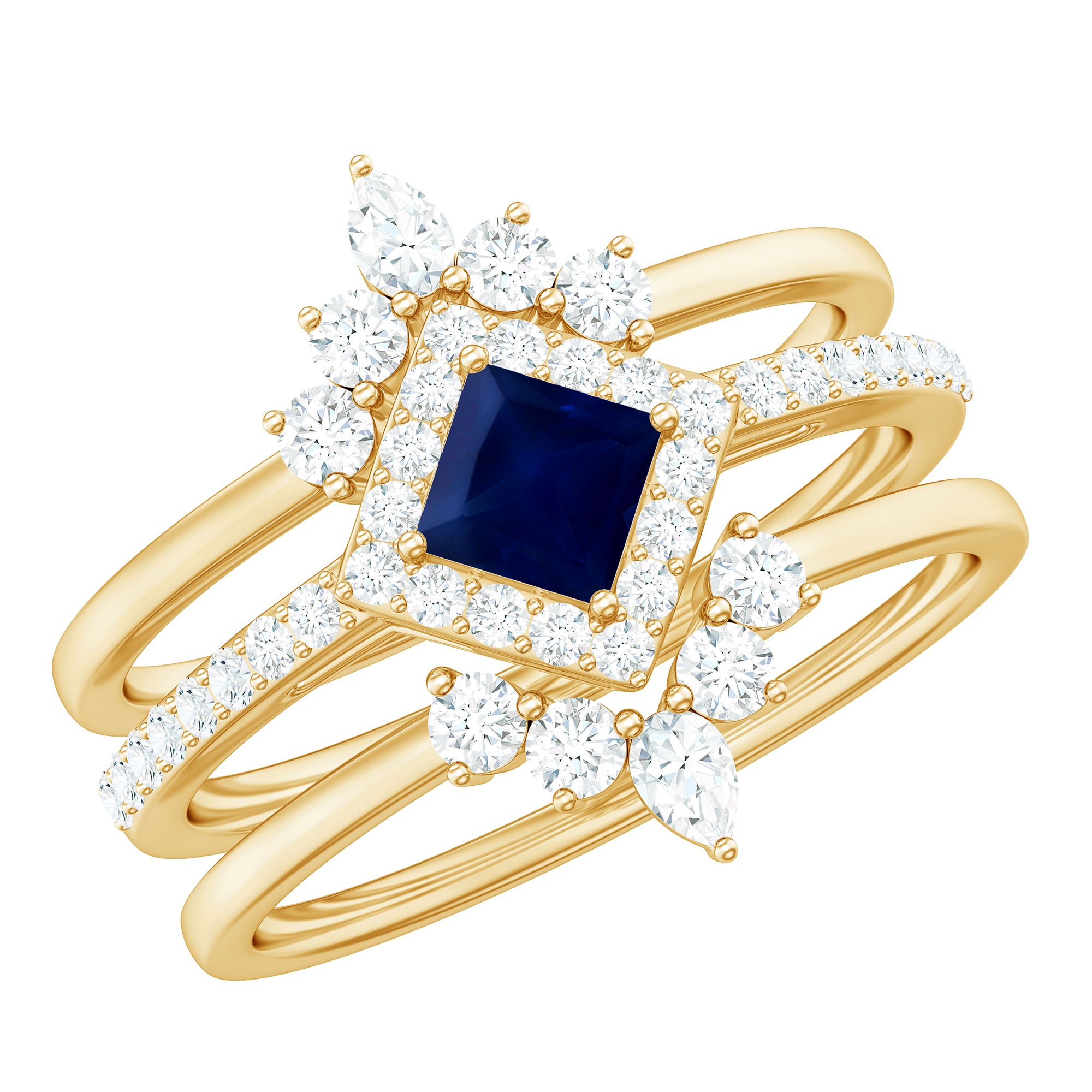 Dress your finger with this Blue Sapphire Ring Set. Being adorned with Princess Cut Blue Sapphire in Prong Setting and Moissanite on Bridal Ring Set. Composed of Gold, this Ring Set is a stunning jewelry for her special day.