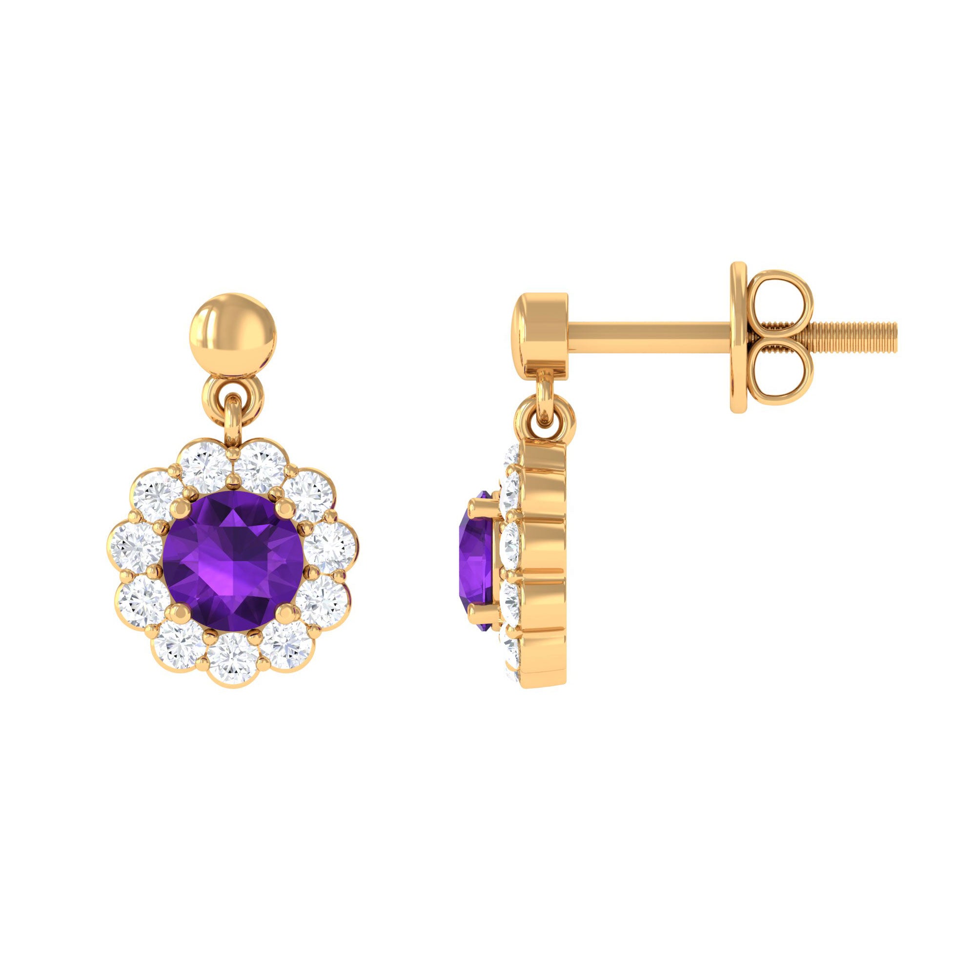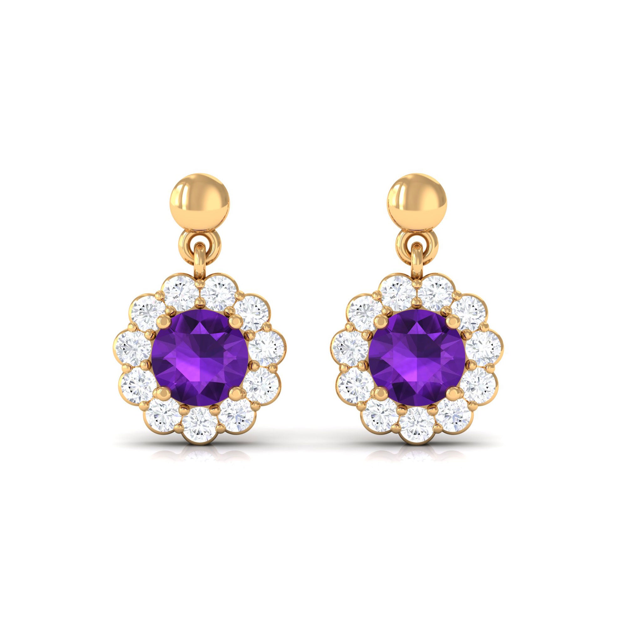 Complete your outfit with this elegantly designed Amethyst Earrings. This Flower Drop Earrings is crafted with Gold and adorned with Round Shape Amethyst with Diamond to make for a lovely choice for different occasions. These Halo Earrings and your love make her eyes glitter.
