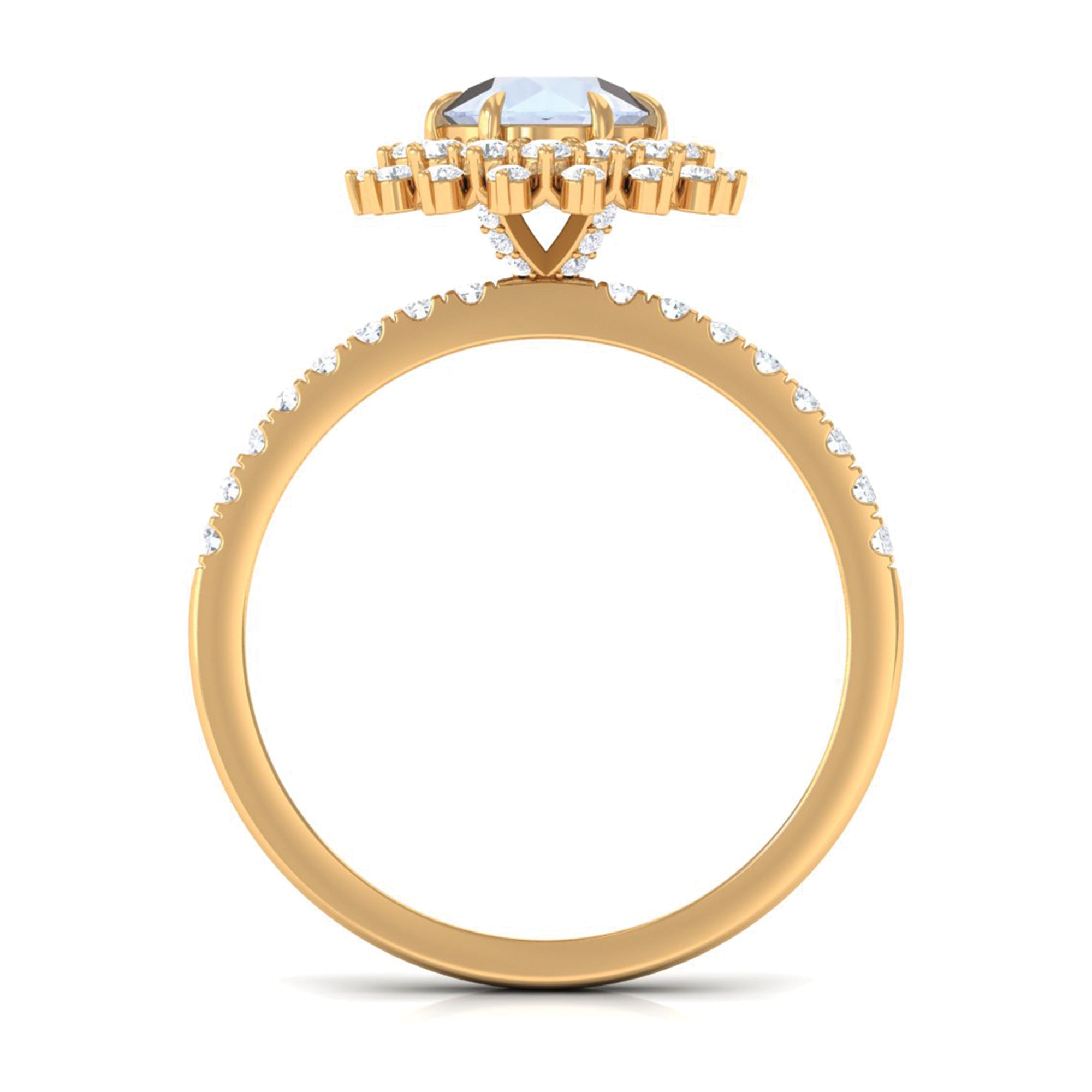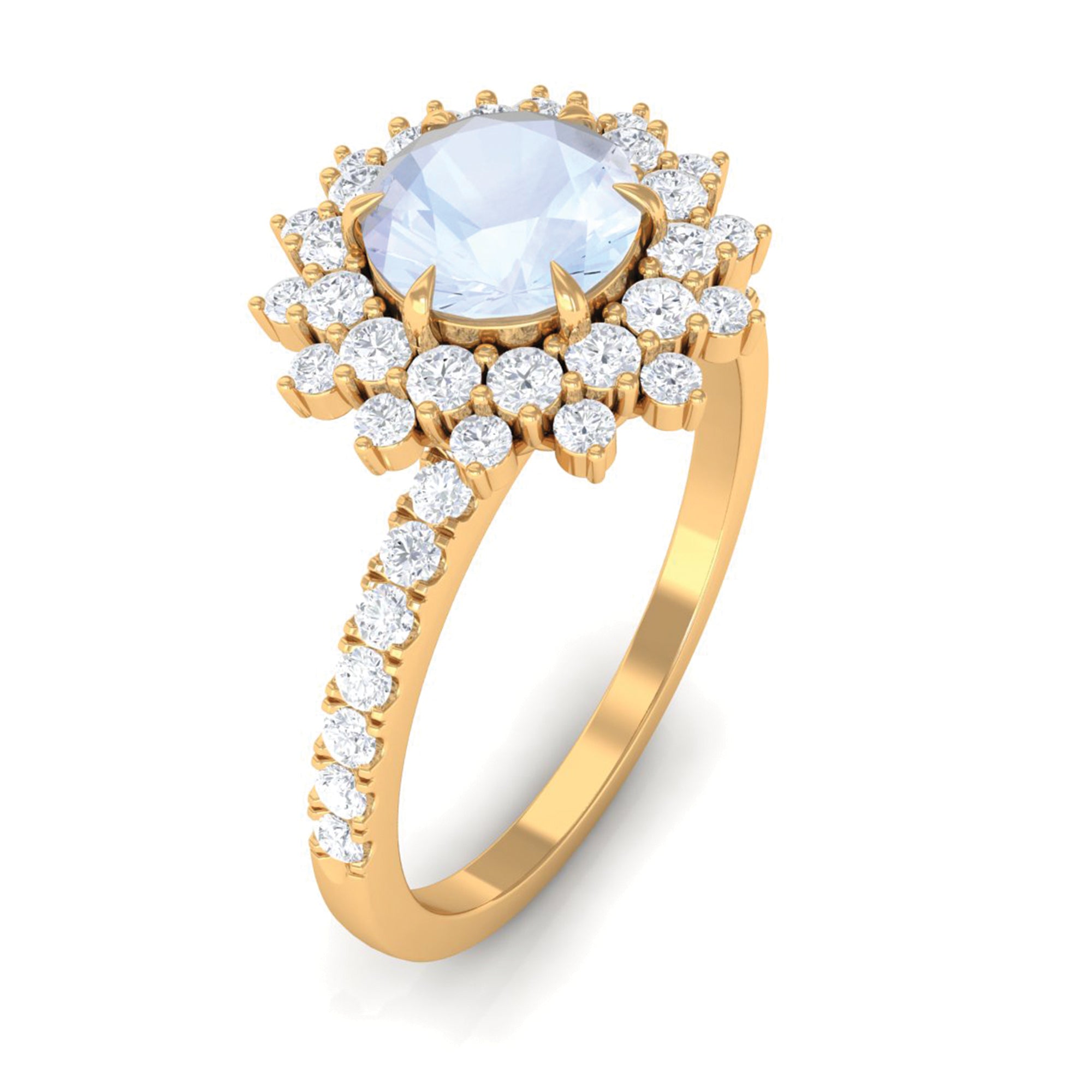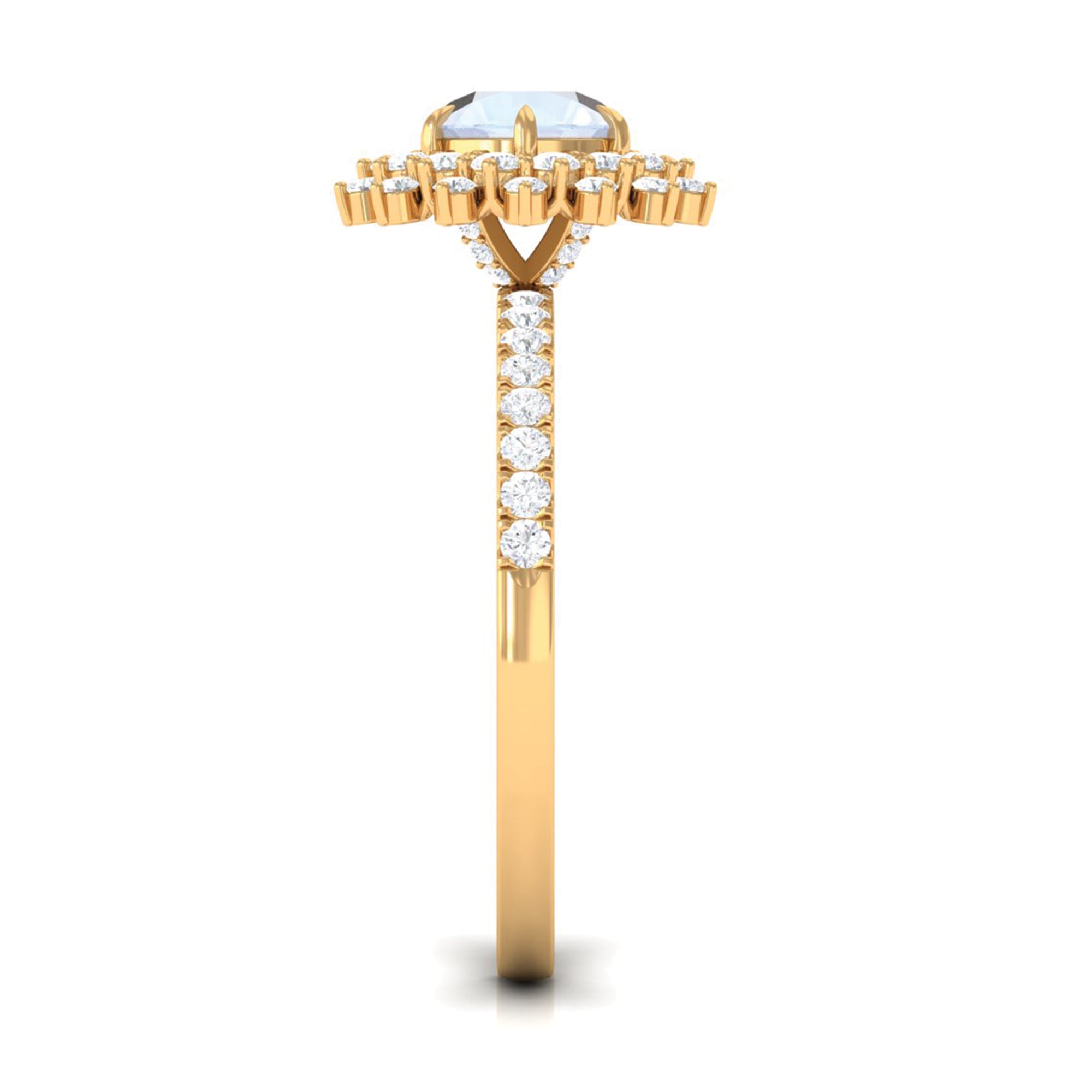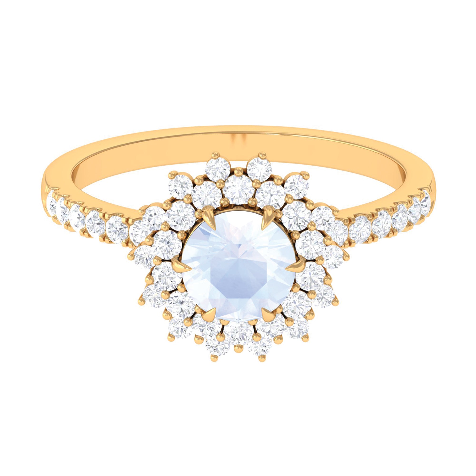 Crafted with the sumptuous appeal, this engagement ring features a stunning round Moonstone held in a six-claw prong setting, surrounded by a captivating cluster halo of moissanite stones. The intricate design of this moonstone statement ring exudes a regal appearance and is crafted in gold. Impress your lady with your exquisite taste by gifting her this beautiful Moonstone engagement ring.