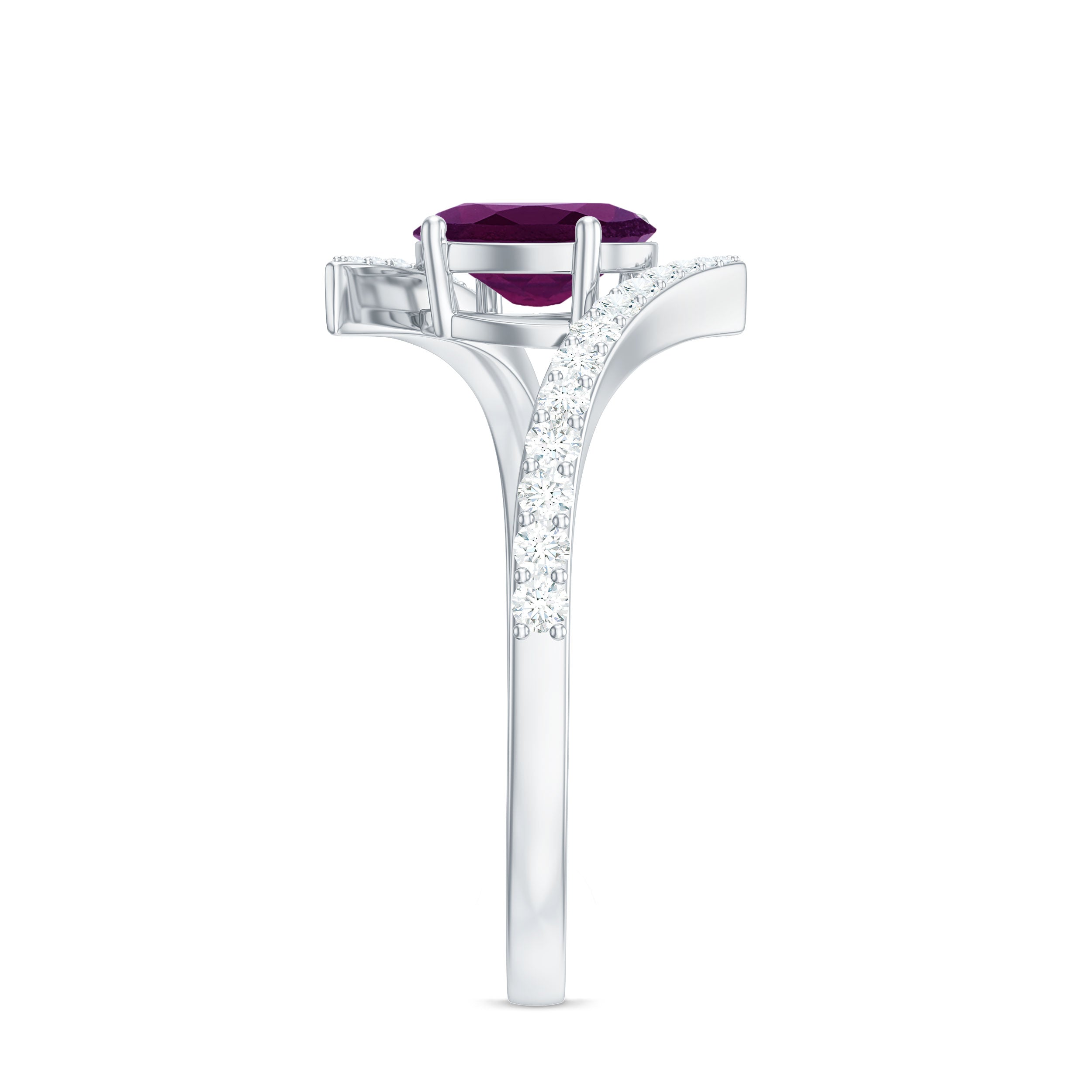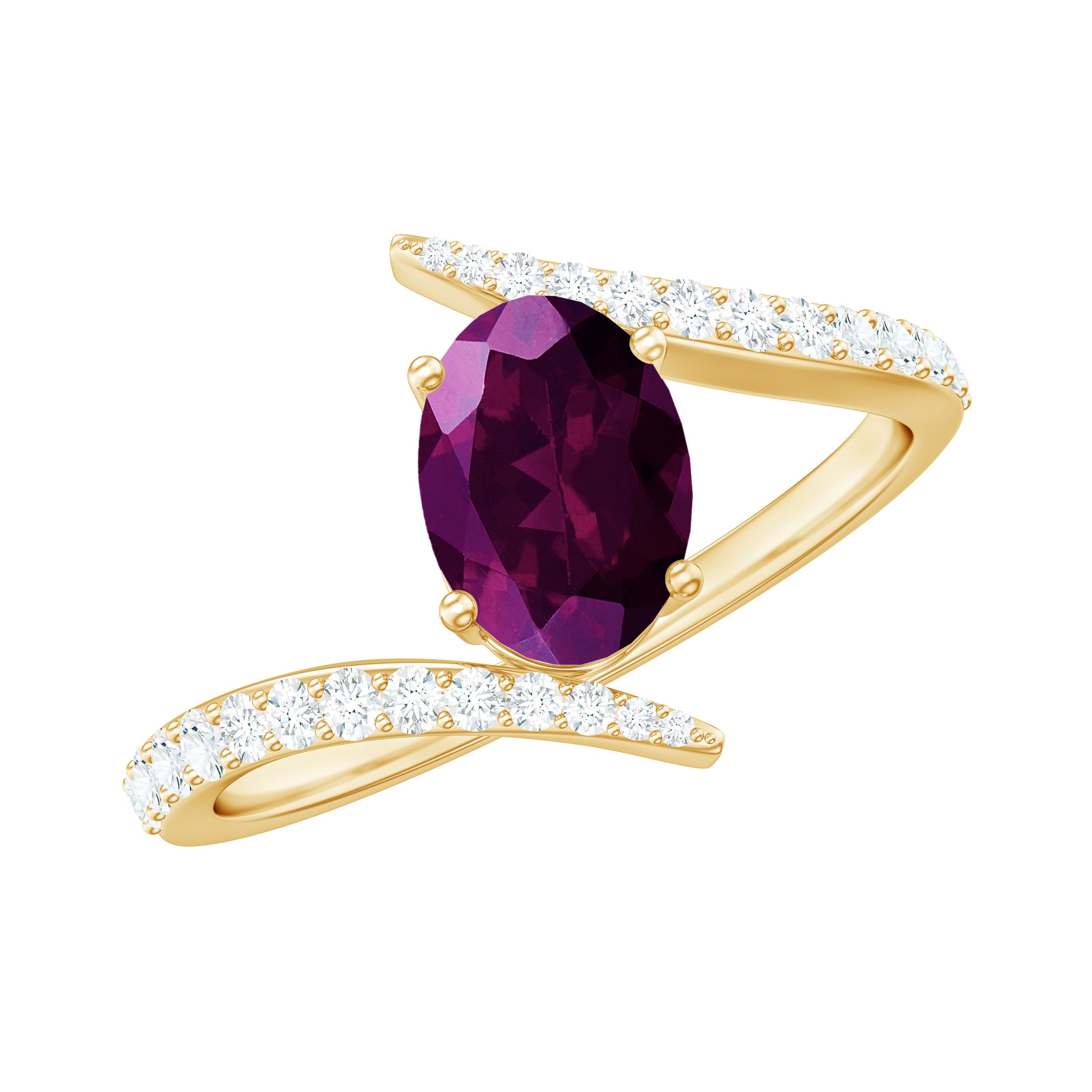 This exquisite engagement ring features an oval cut rhodolite gemstone, set in a solitaire style and accented by a bypass design. The shank is adorned with sparkling Diamond, making this a truly unique and stunning piece. The perfect symbol of love and commitment, this rhodolite ring is sure to take her breath away.