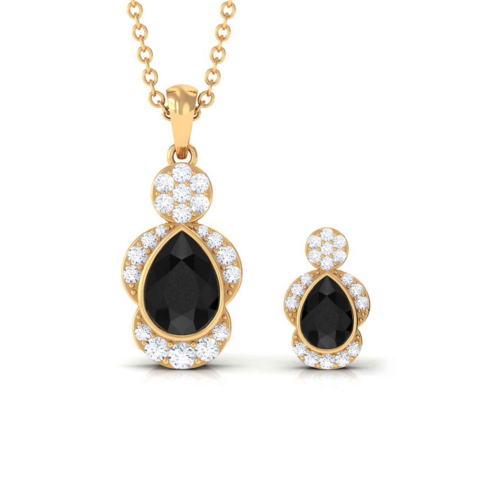 This unique and elegant Dangle Jewelry Set is embellished with Pear Cut Black Onyx set in Bezel Setting and Round Shape Diamonds set on a unique design. So, wear this Sapphire Pendant and Earrings Set with your matching dress to grab all the attention at a party.