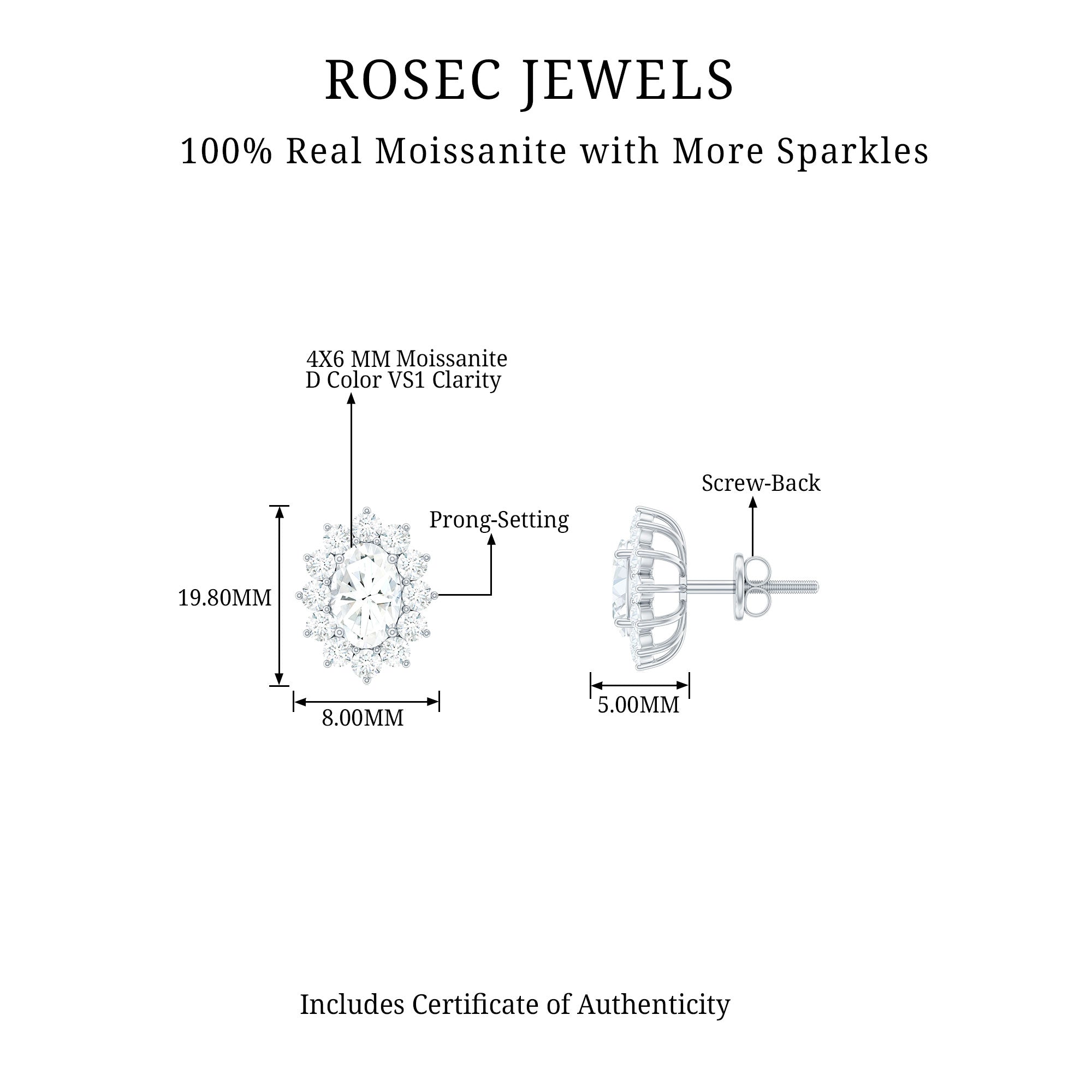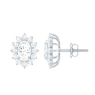 Keep your sparkle alive with these Starburst Moissanite Stud Earrings. The earrings feature an oval-cut moissanite in a prong setting at the center, surrounded by a halo of round-cut moissanite in prong setting. These earrings are made with solid gold and have screw backs.