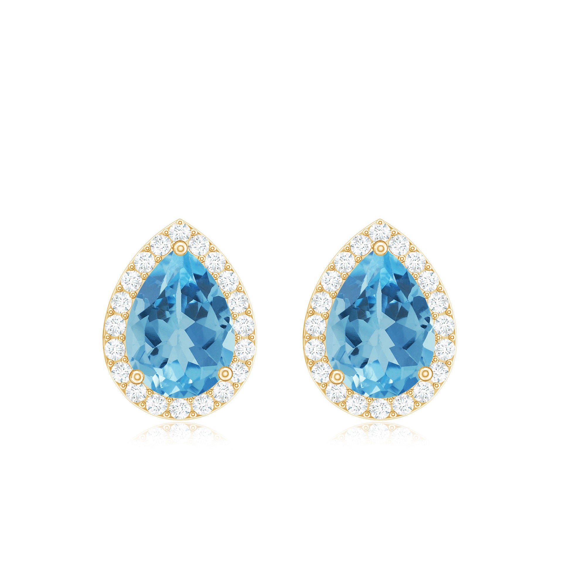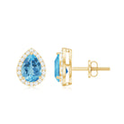 This Beautiful Teardrop Stud Earrings is embellished with Pear Cut Swiss Blue Topaz as Solitaire and Diamond set in Halo. This Solitaire Stud Earring is Composed of Solid Gold.