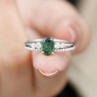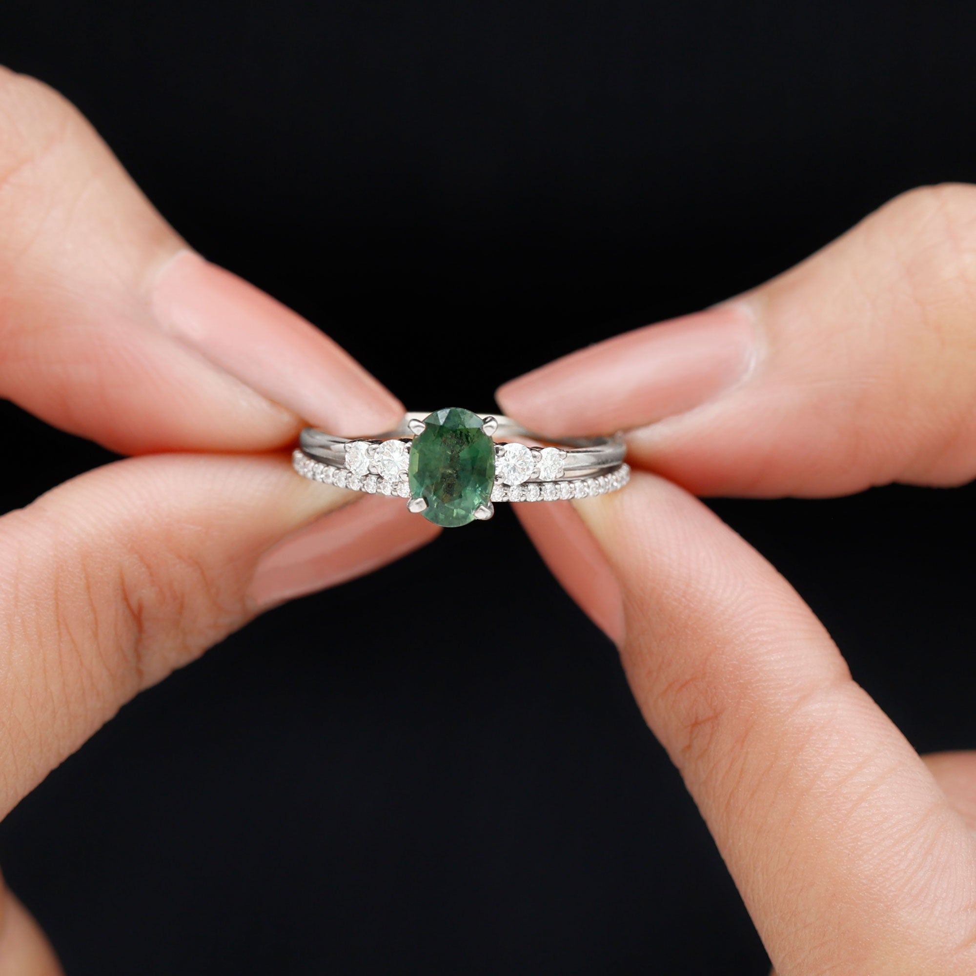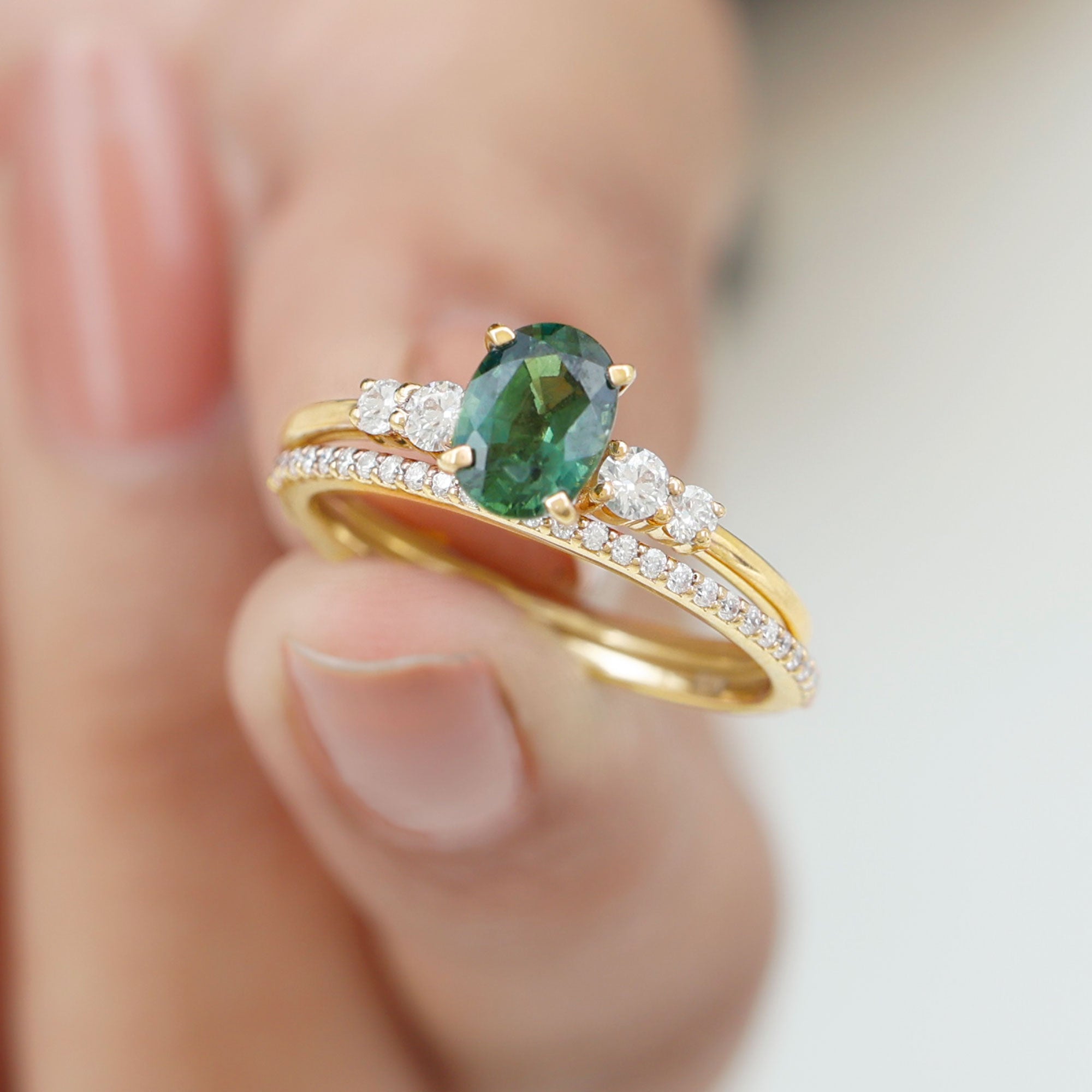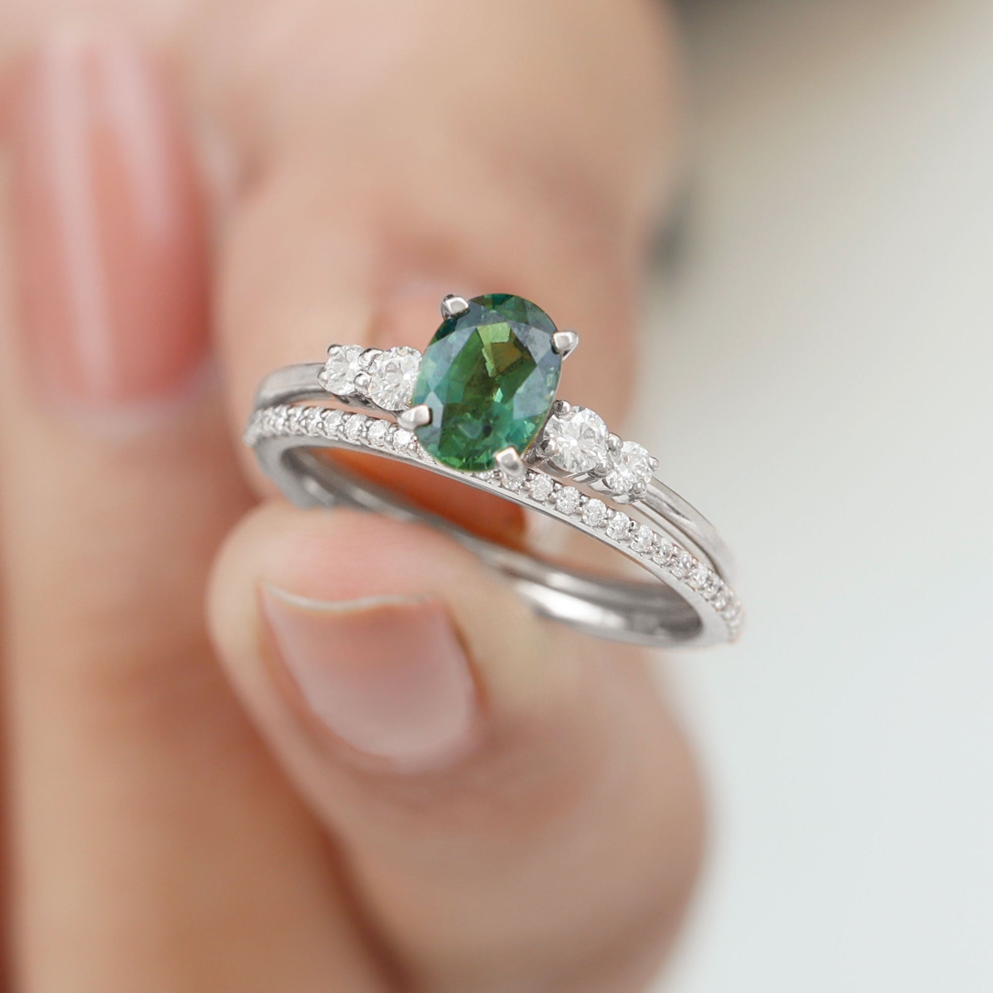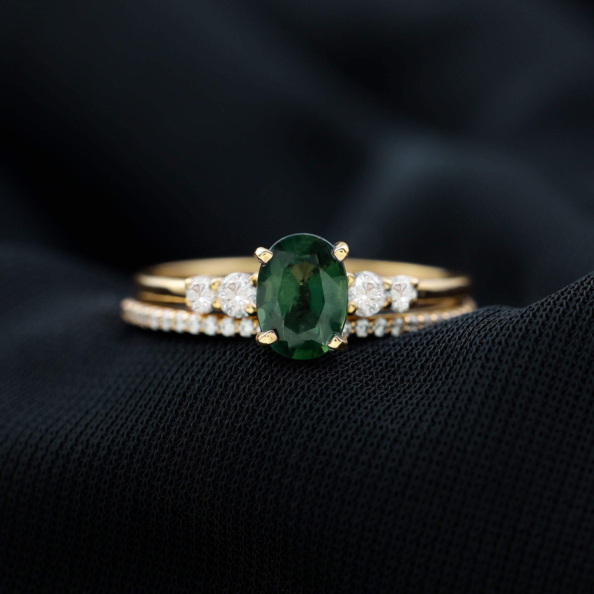 Look gorgeous by wearing this pleasing Solitaire Ring Set embellished with Oval Cut Created Green Sapphire in Peg Head Setting with Diamond Stones and a Diamond Enhancer Ring. Crafted with Gold, this Created Green Sapphire Ring Set will give you a stand out look from others. Stack this delicate Stackable Ring Set with your other favorite pieces, or wear it alone for a sleek, modern look