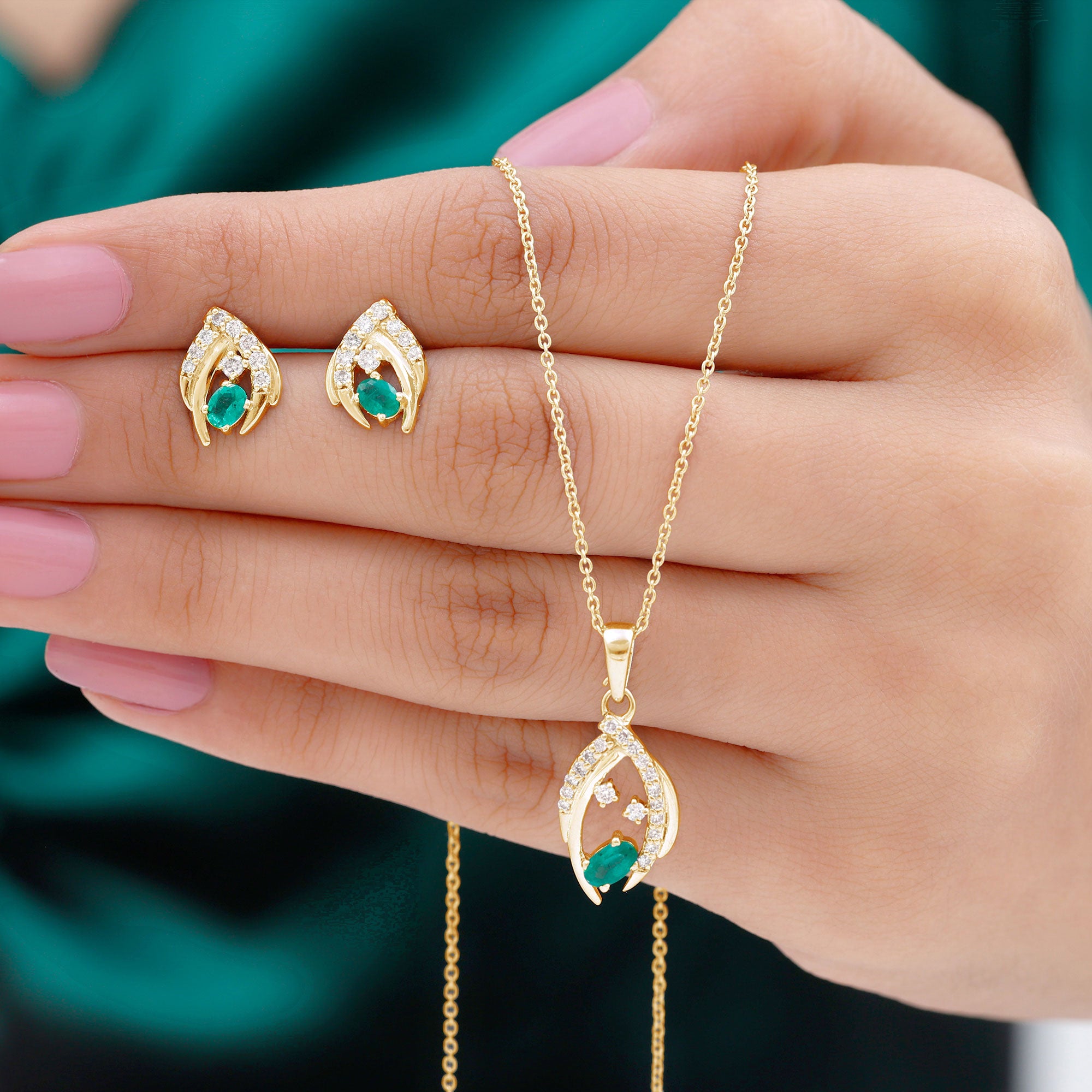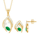 This Simple Jewelry Set is embellished with Oval Shape Emerald tilted in Center of Uniquely Designed Solid Gold with Round Shape Diamond gemstones in Prong Setting. Get this Pendant Earring Set for Lovely Lady of your Life.