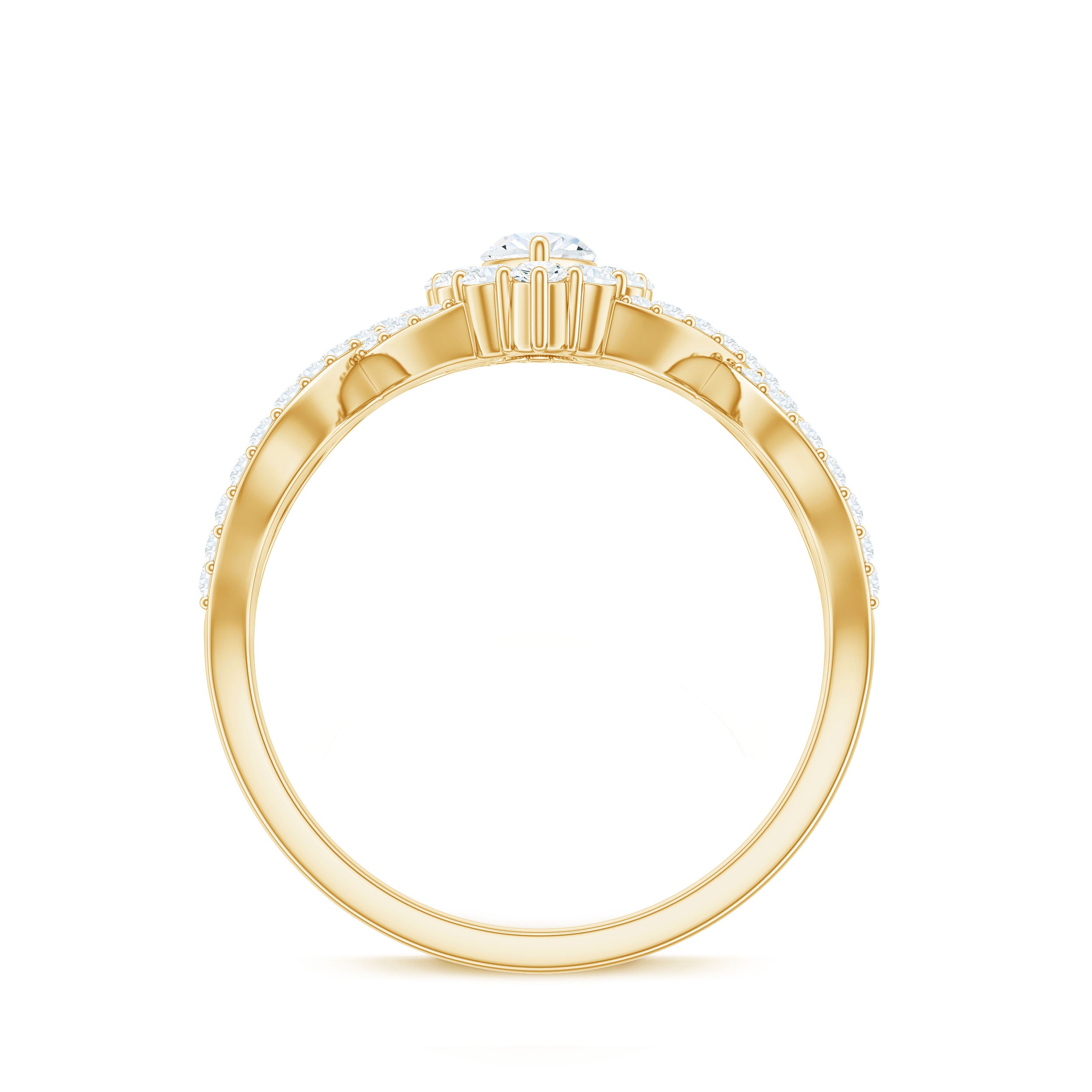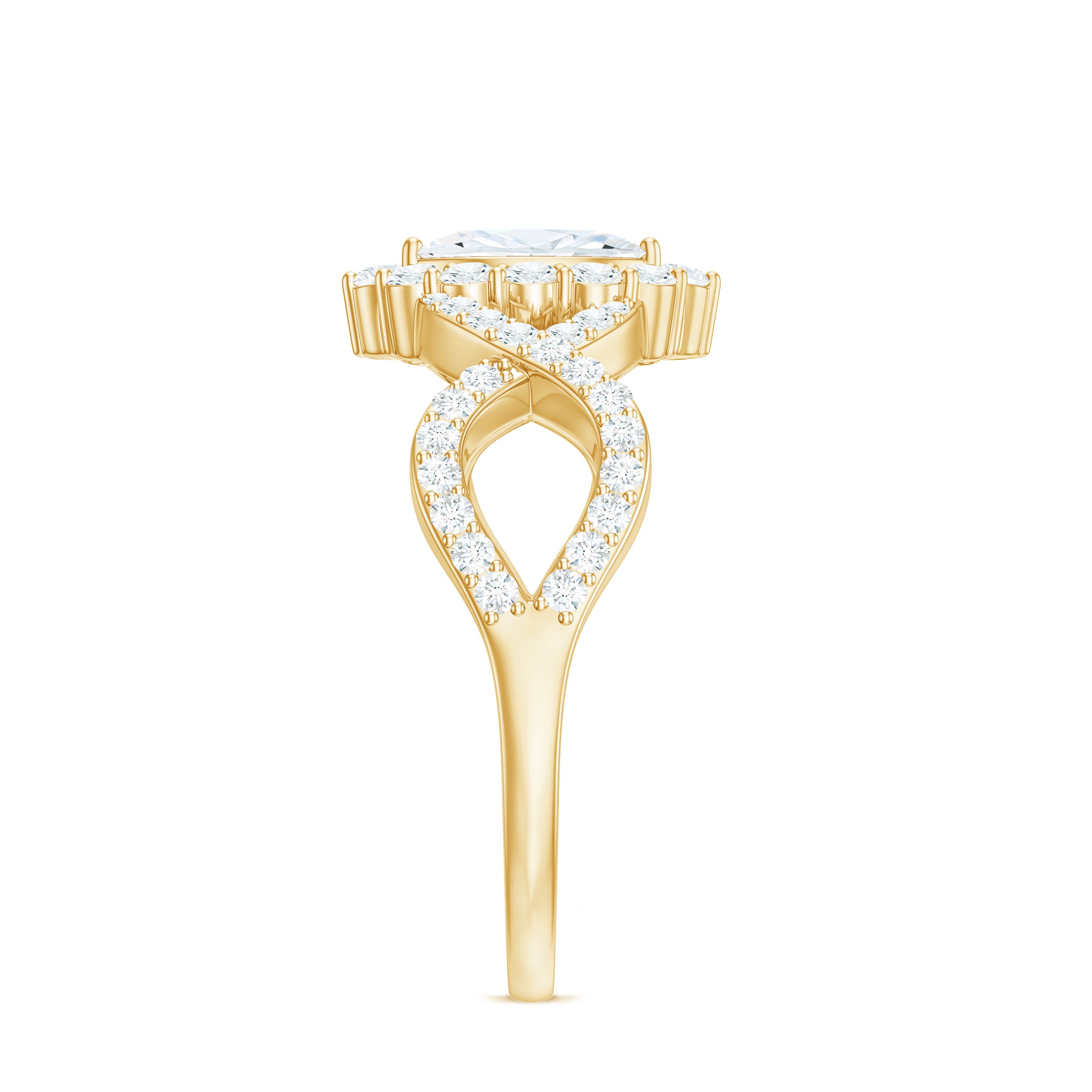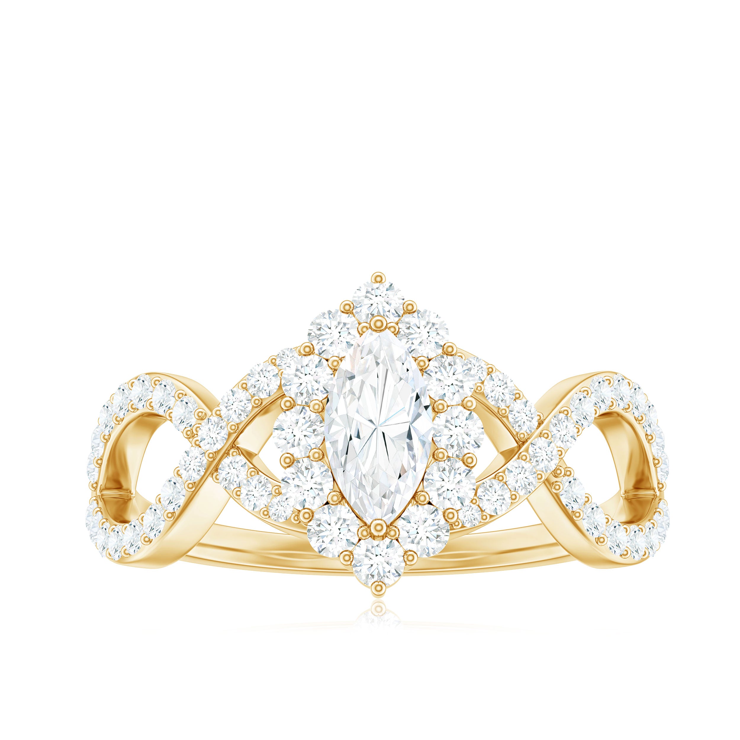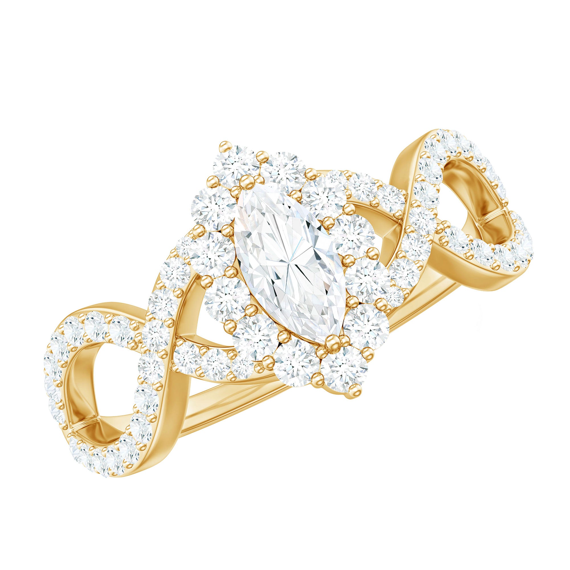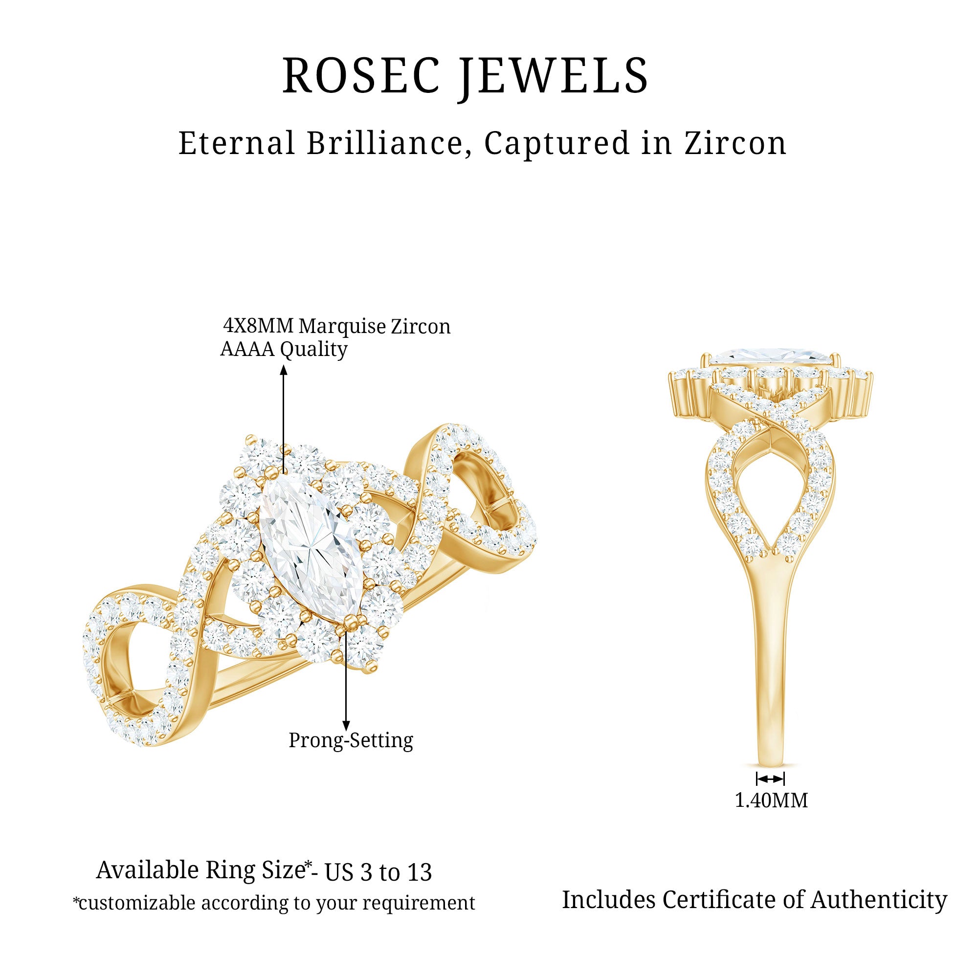 Delicately presenting a marvelous Marquise Shape Cubic Zirconia embedded in the center with Halo, this Simulated Diamond Engagement Ring features a crossover shank decorated with glimmering zircon gemstones. Heavenly crafted in gold to make an style statement.