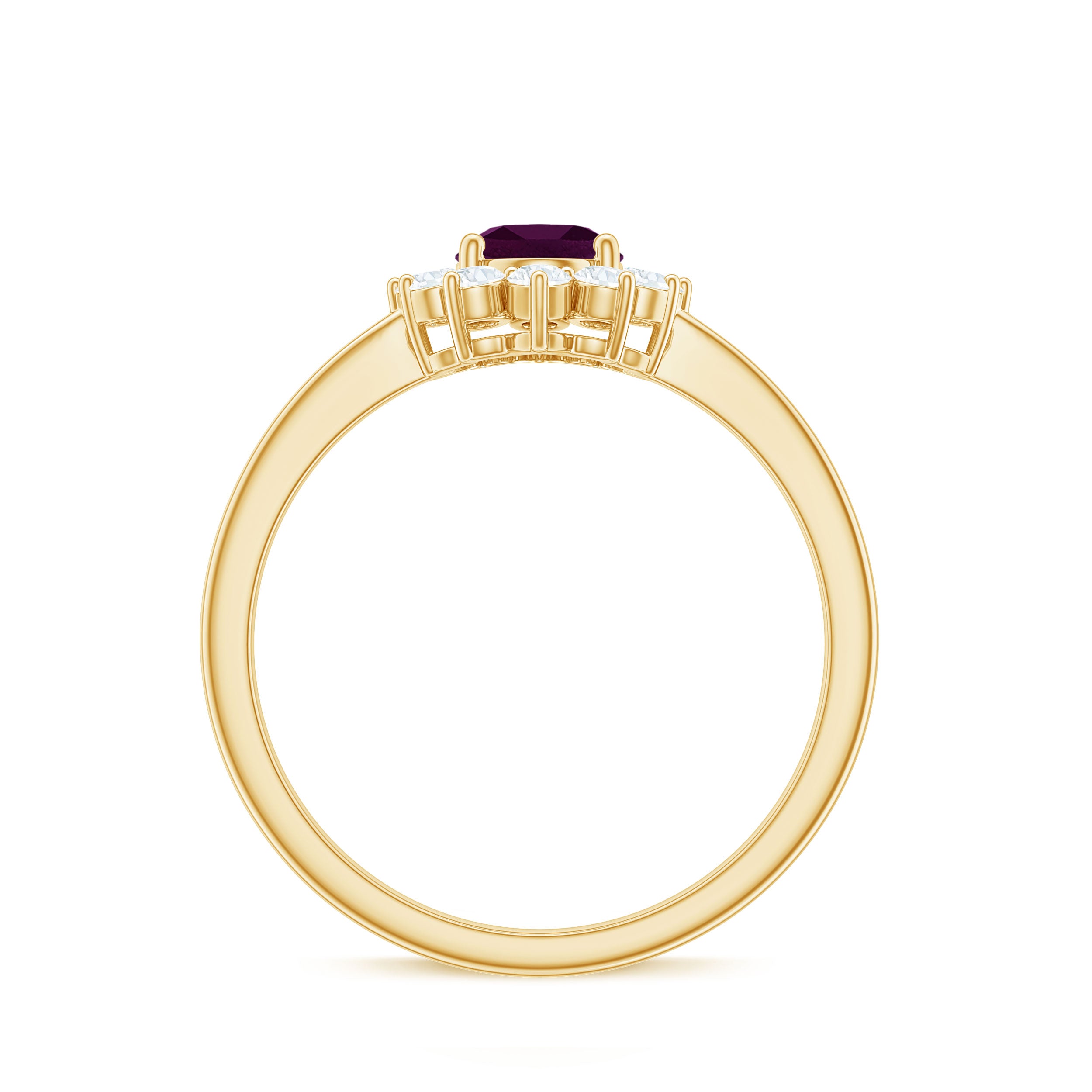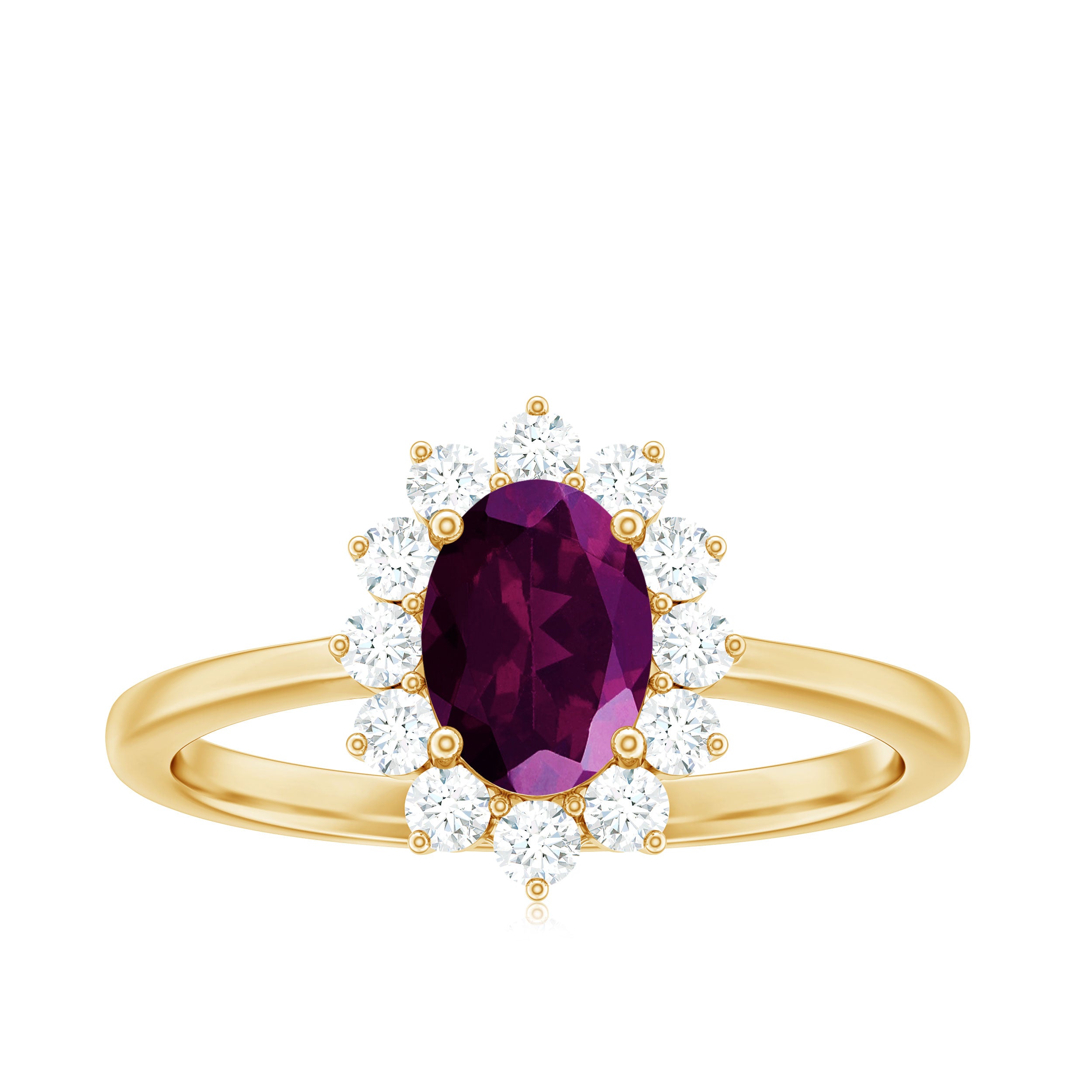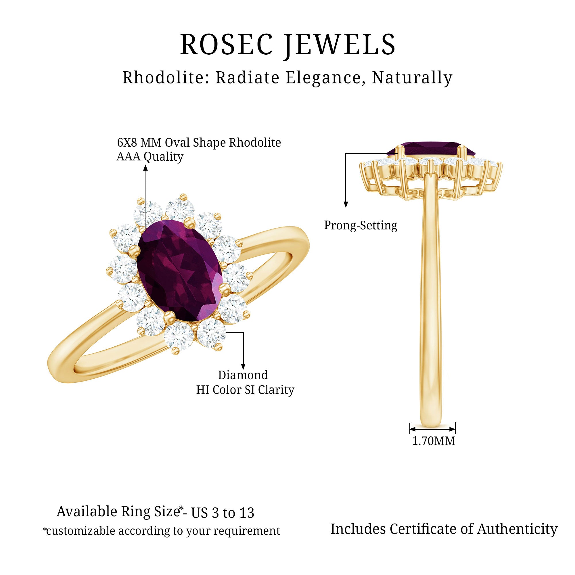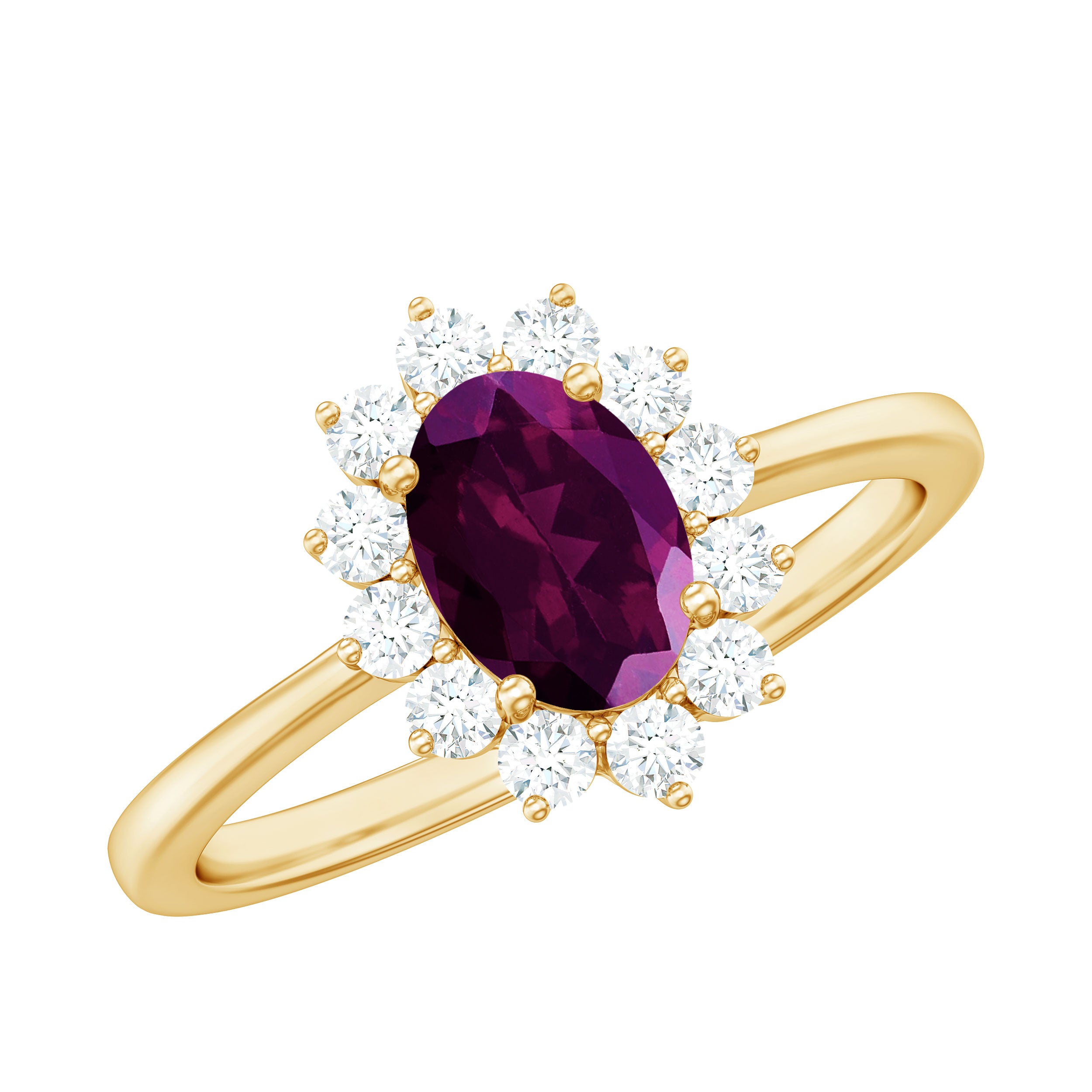 Make her feel like a princess on your special day with this Princess Diana Inspired Ring adorned with Oval Shape Rhodolite is set as a Solitaire with Diamond Halo. This Engagement Ring is crafted with Solid Gold for a luxurious appeal.