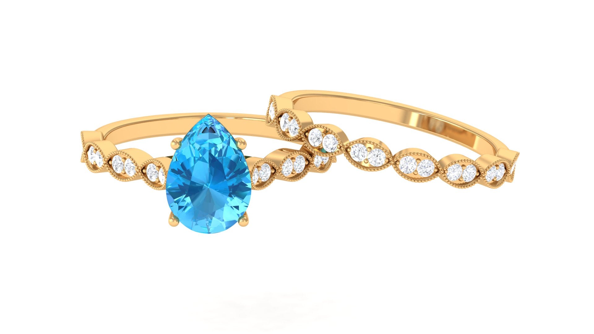 Win her heart when you present her with this Engagement Ring Set adorned with a 5X7 MM Pear Cut Swiss Blue Topaz Solitaire accentuated by round moissanite accents and a half eternity ring studded with moissanite accents that add to the look of this ring.