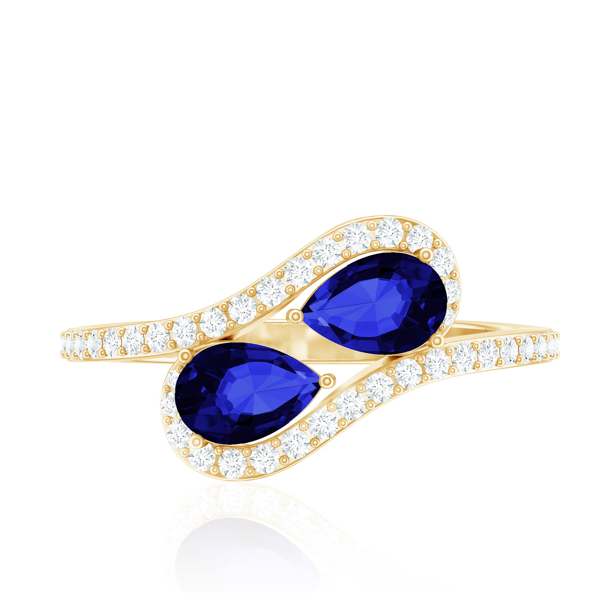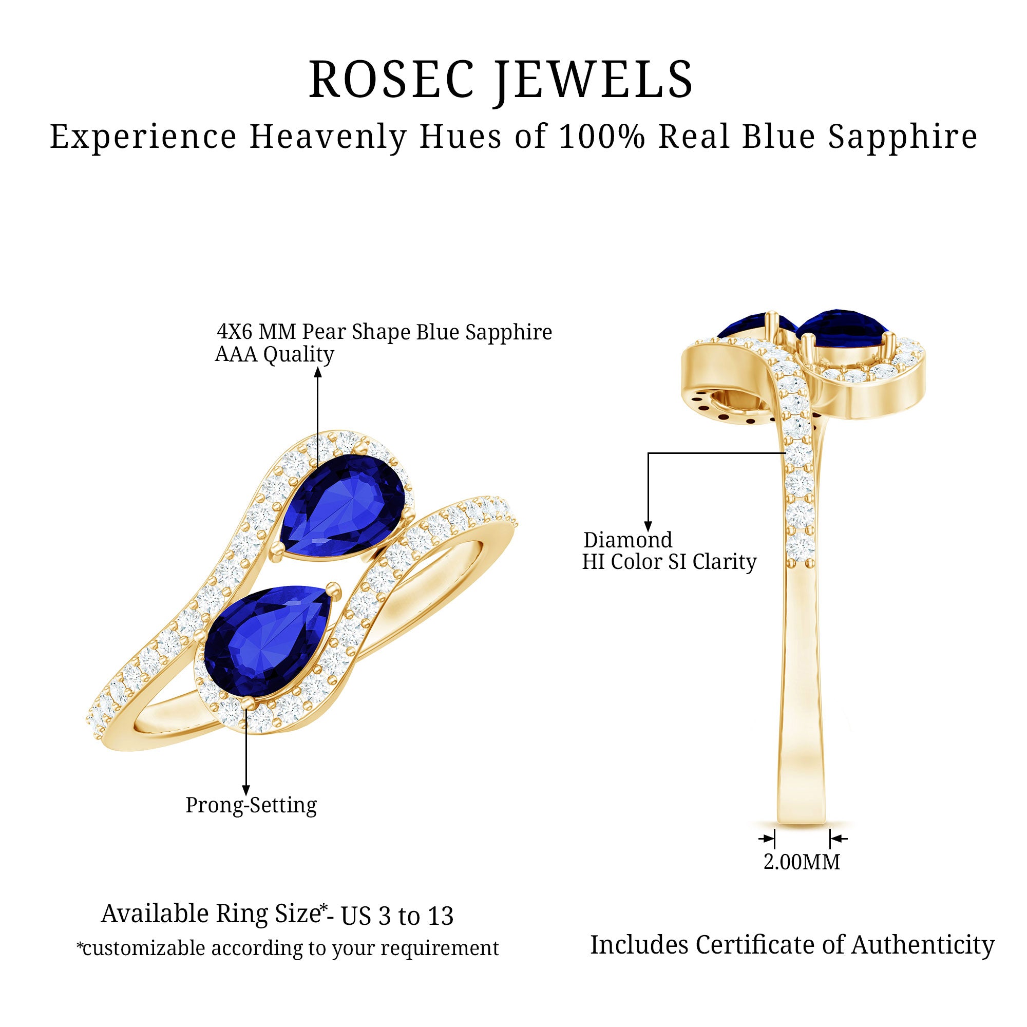 Make a sophisticated statement with this gorgeous Two-Stone Ring, featuring a stunning Pear Cut Blue Sapphire set in a Prong Setting and complemented by Round Shape Diamond stones along the bypass shank. Crafted with Solid Gold, this ring exudes luxury and style.