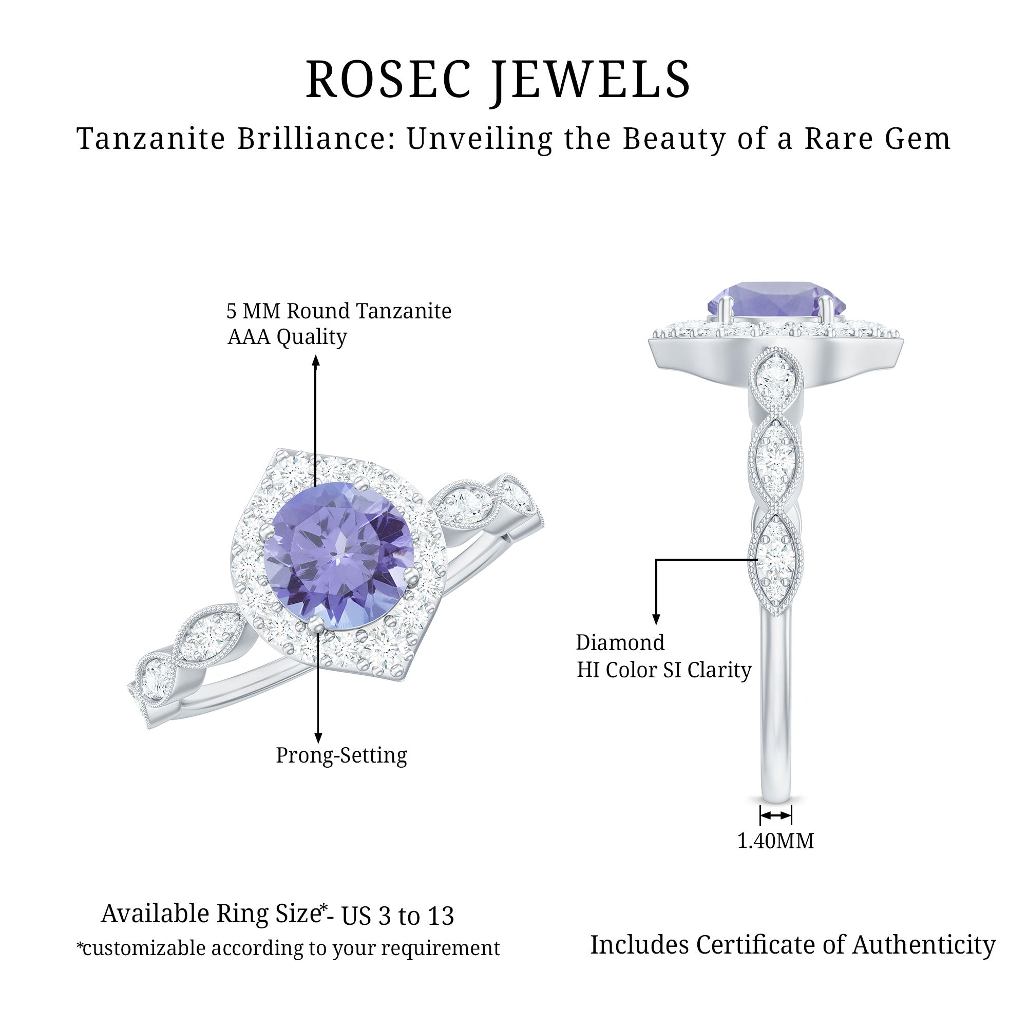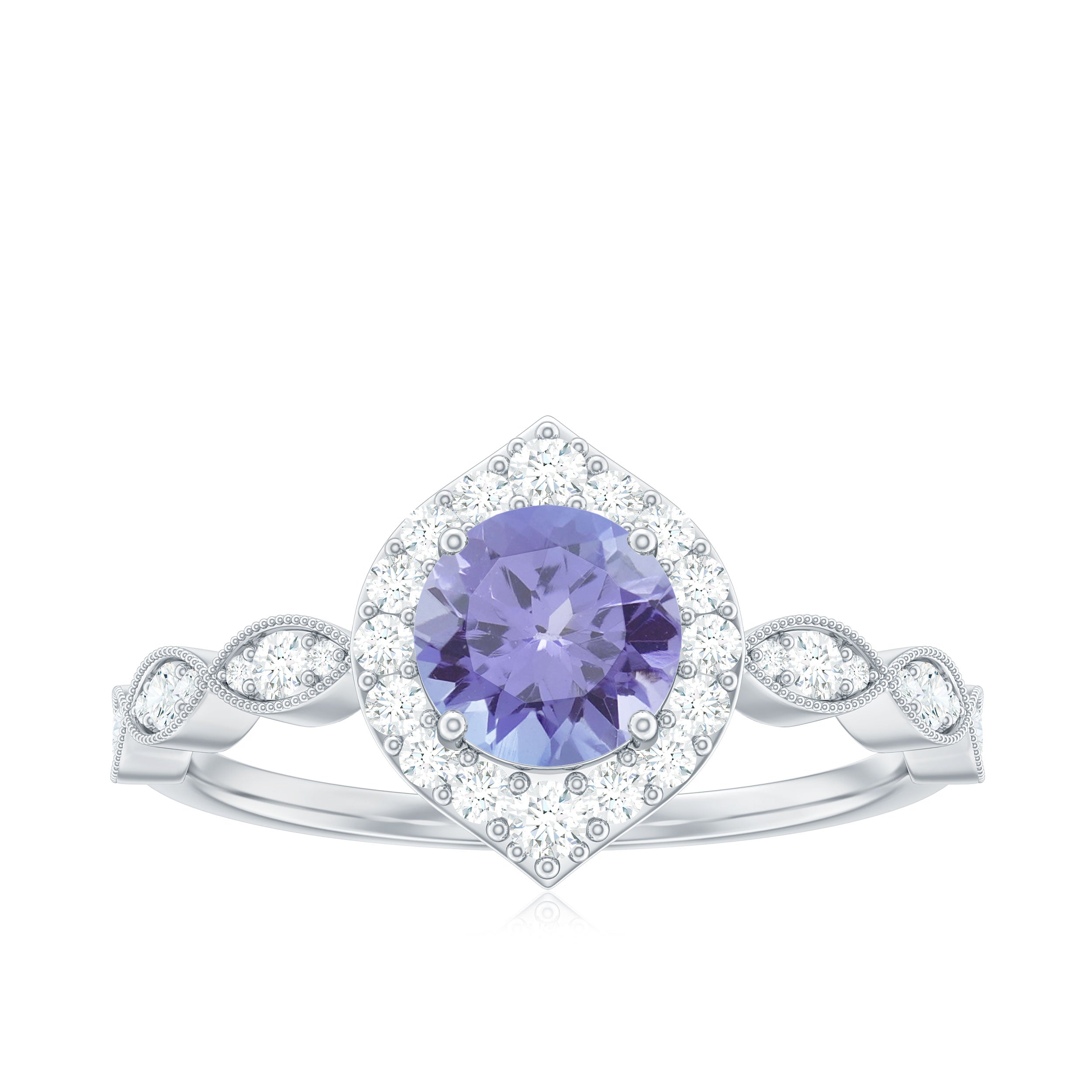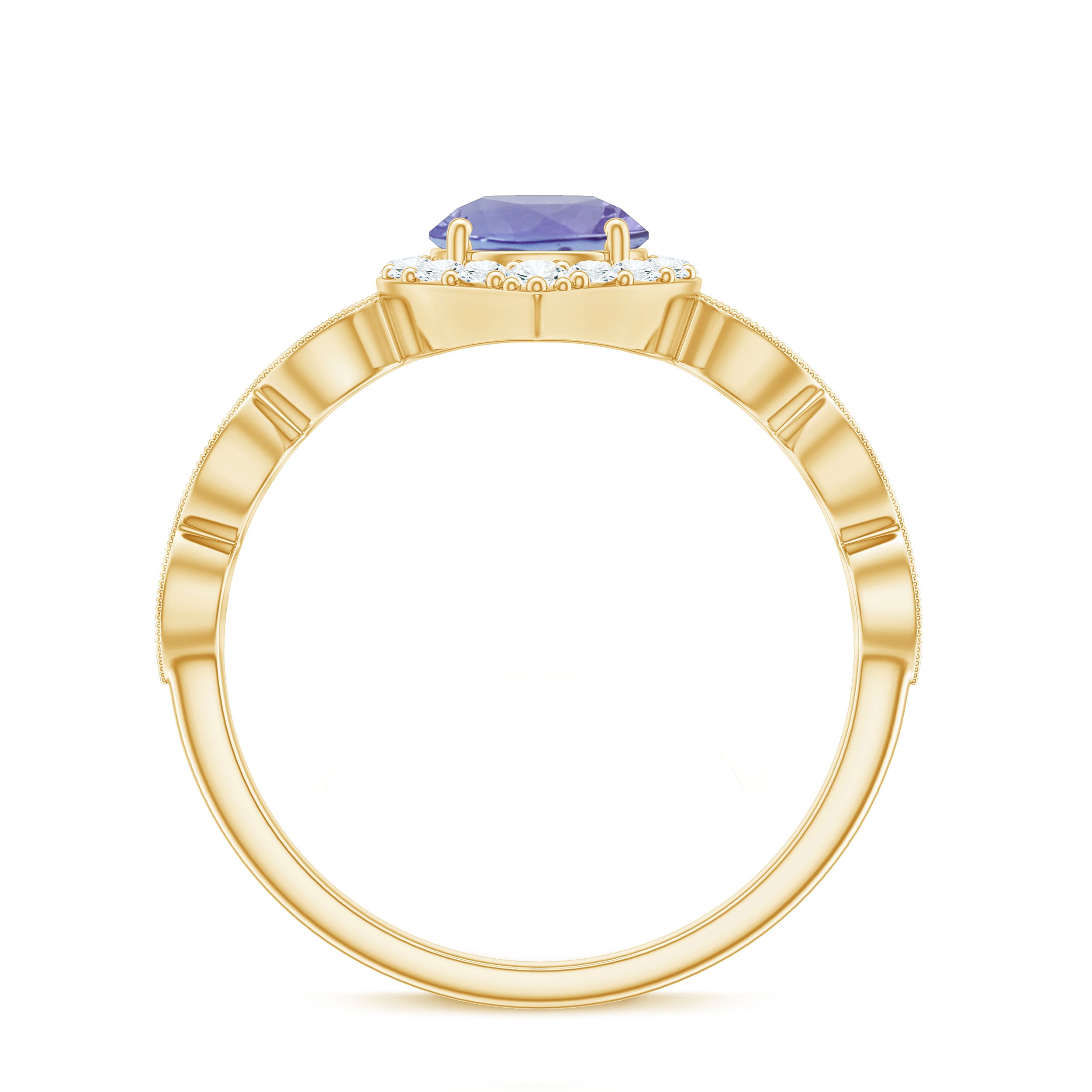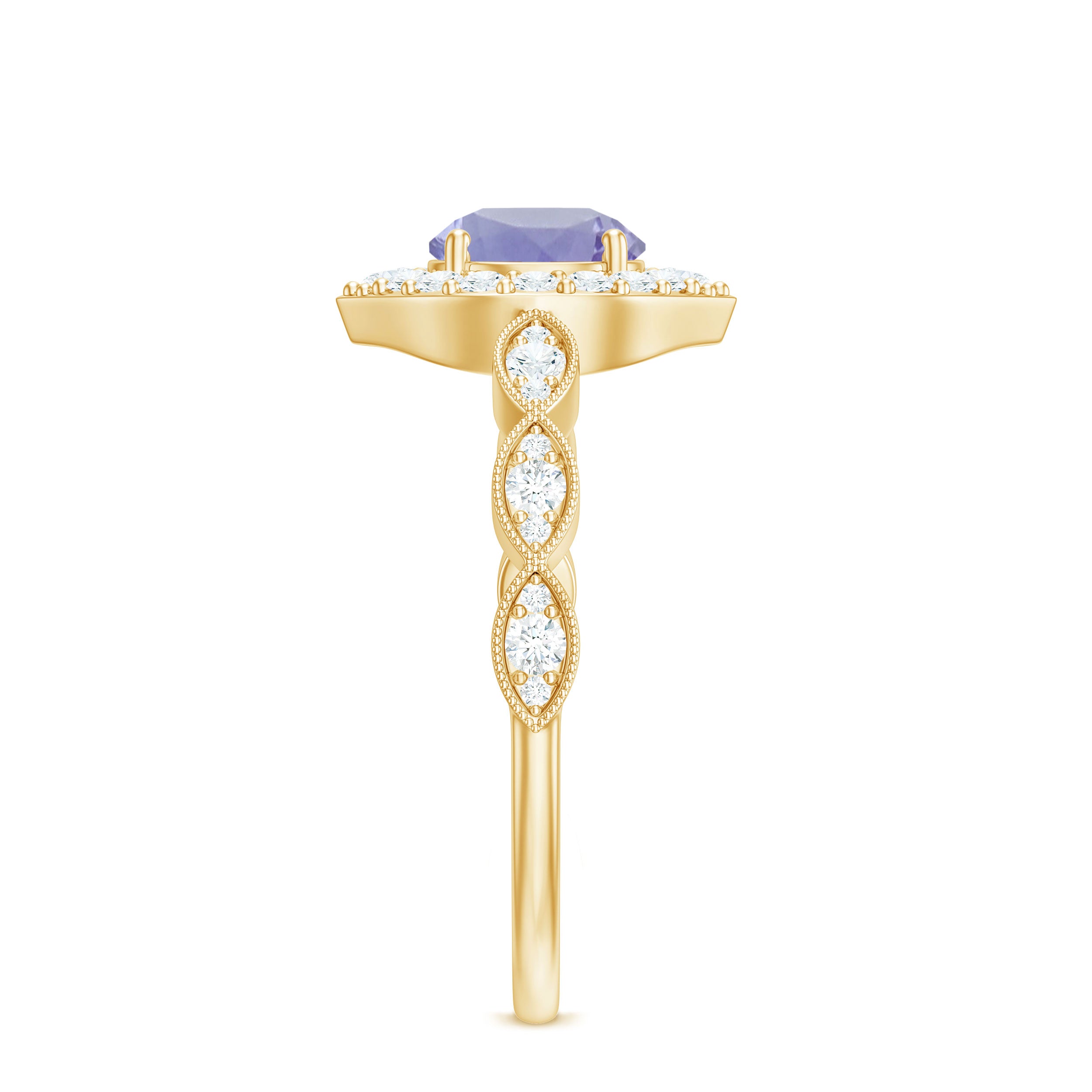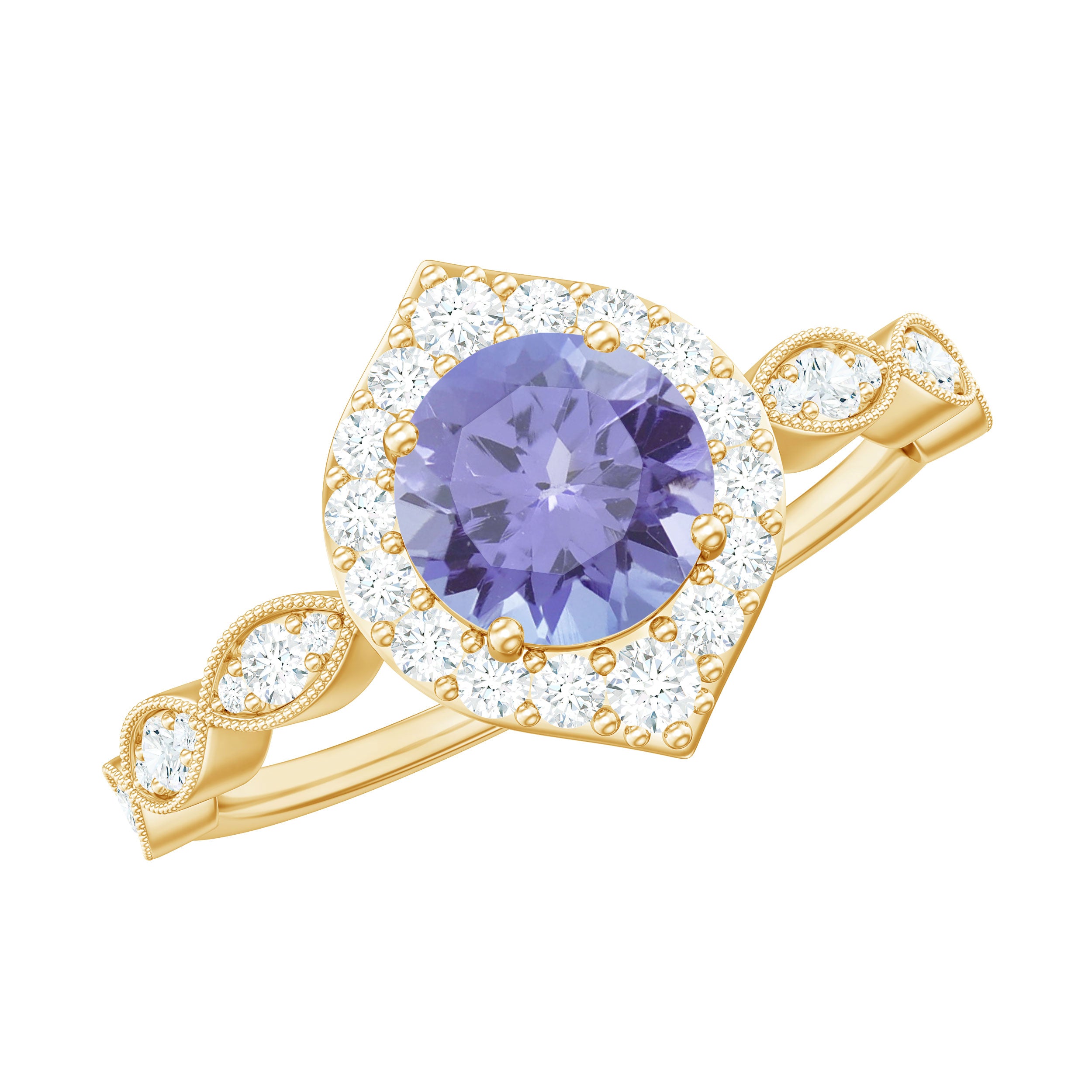 Embrace vintage elegance with this Tanzanite engagement ring. Featuring a radiant round-cut Tanzanite at its center, surrounded by sparkling Diamond accents on a beaded shank, this gold ring is perfect for women who appreciate antique and artistic jewelry. Make a regal statement with this vintage-inspired piece.
