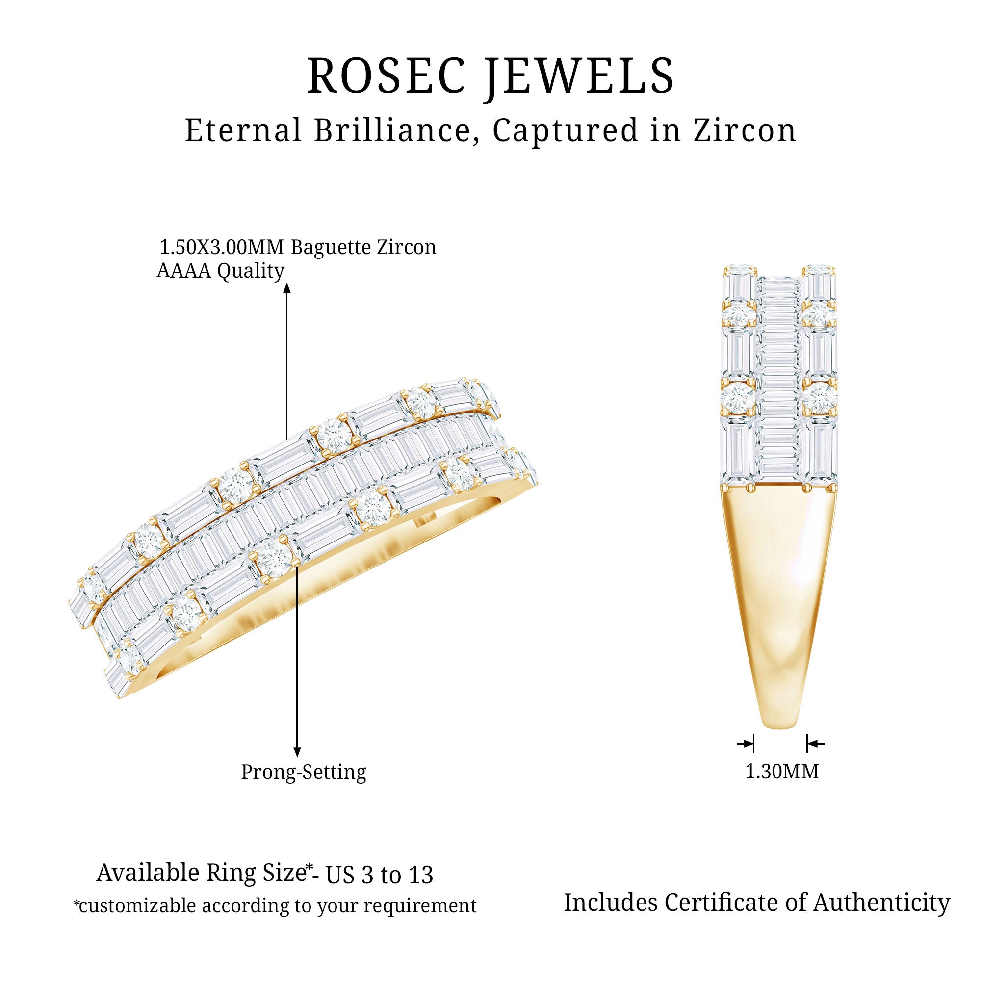 Your wedding day must be very special. Make your wedding day more special and memorable with this alluring Wedding Band which is embellished with Round and Baguette Cut Zircon. Crafted with Solid Gold, this elegant Zircon Wedding Band will help you to create a luxurious appeal on the wedding day.