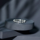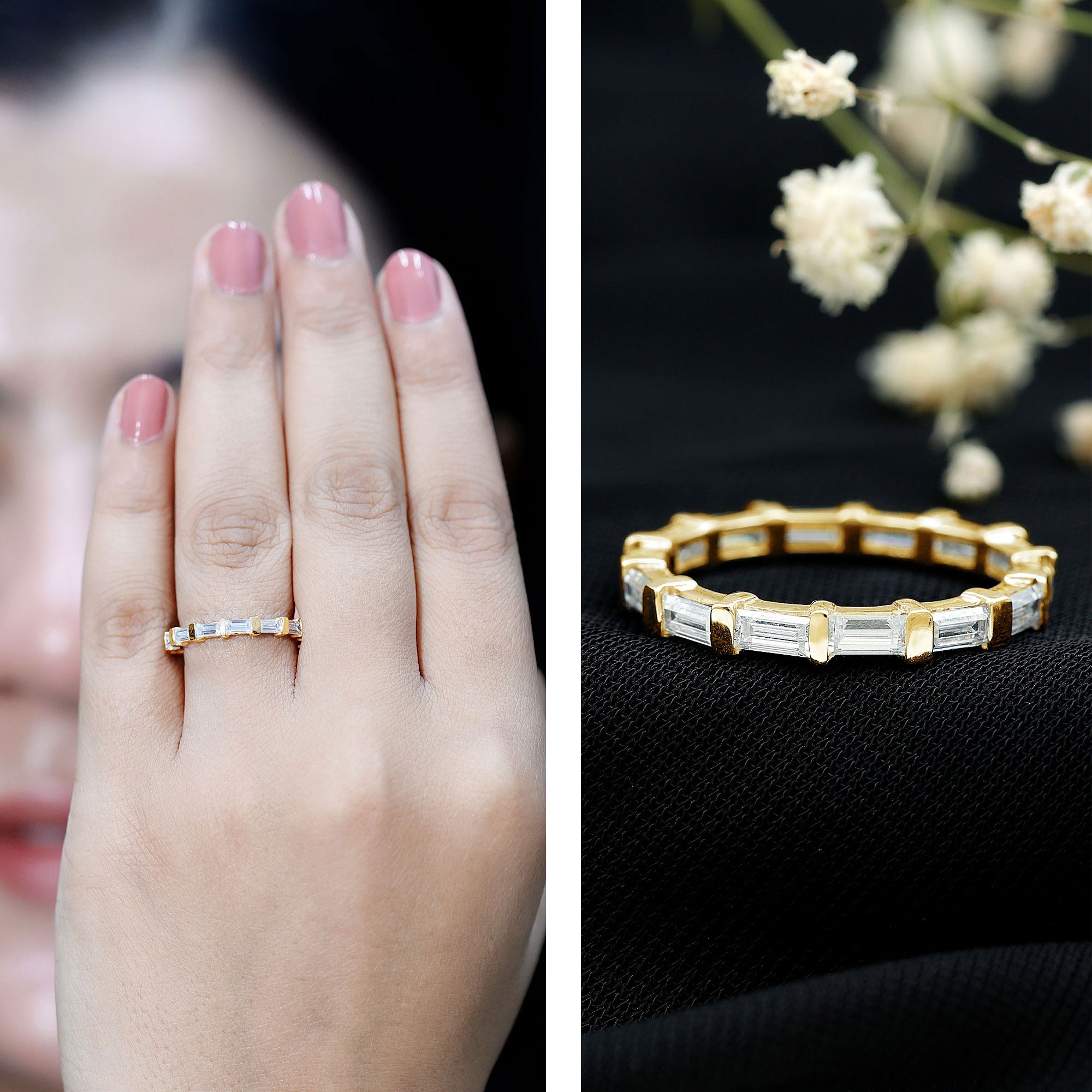 Minimal design and maximum sparkle. This Baguette Eternity Band embodies modern sophistication and timeless meaning. It showcases a beautiful line of 2X4 MM baguette cut moissanite stones arranged in an east west style and secured with bar setting. This Full Eternity Band adds striking brilliance to a minimalist aesthetic. The complete circle design represents everlasting love. With D color and VS1 clarity, the moissanite stones shine with remarkable brilliance, making this Moissanite Stackable Ring a perfect option for anniversaries, special occasions, or simply as a fashionable expression of self-love. Whether worn alone for a modern appearance or stacked with your favorite engagement ring or bands, this Moissanite Wedding Band suits every occasion and mood. Made with precision and accompanied by a gemstone certificate of authenticity, it is elegantly packaged in a signature jewelry box, ideal for gifting or keeping for yourself. Whether you are marking a wedding, anniversary, or significant moment in your life, this Baguette Wedding Band is more than just jewelry, it is a representation of something unforgettable.