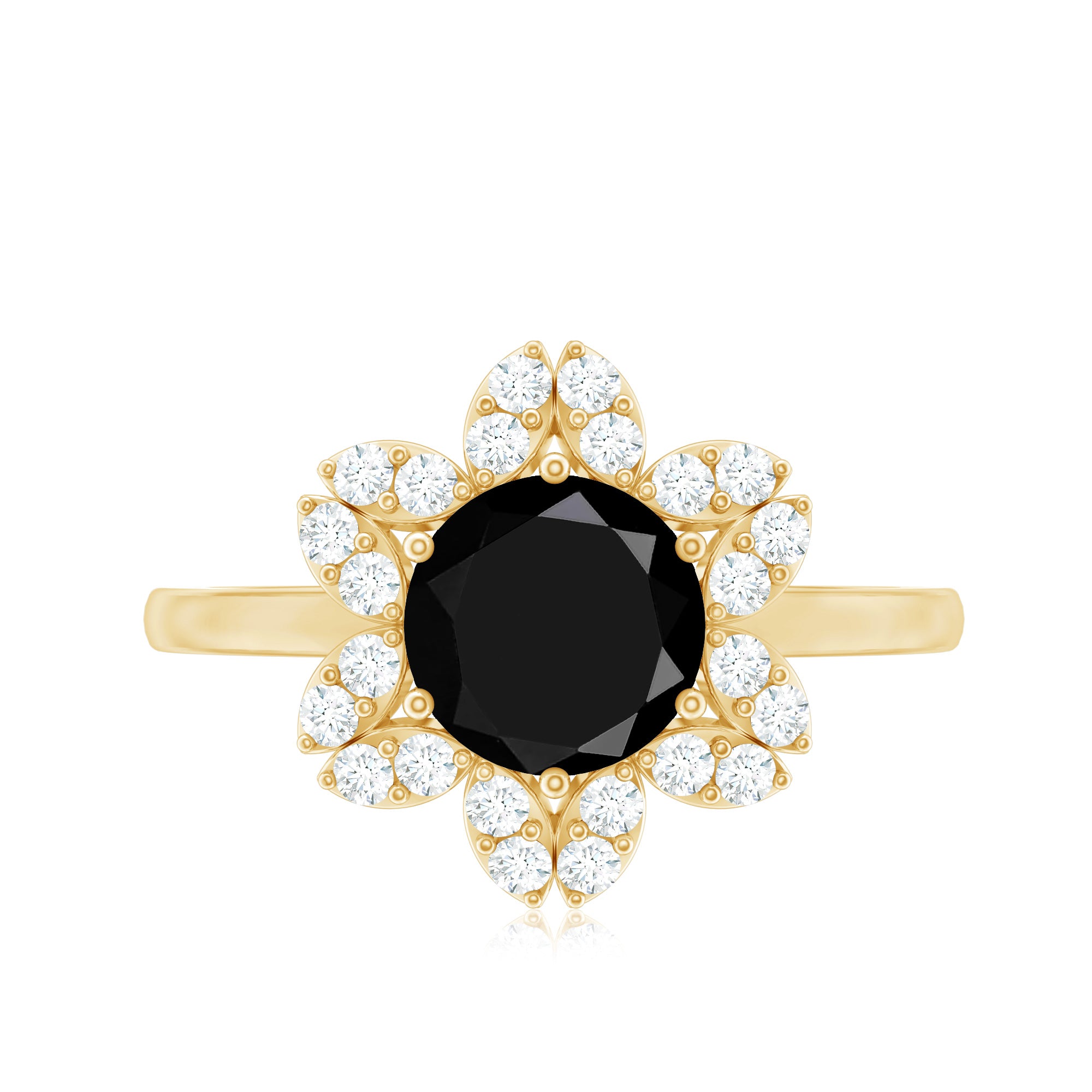 A lady can never say no to jewelry so listen yes while presenting this beautiful Floral Ring. It is embellished with Round Shape Black Spinel as center stone in Prong Setting encircled by round Diamond set in gold marquise shape. This Black Spinel Ring is composed in Gold to offer it a more charming and appealing look.