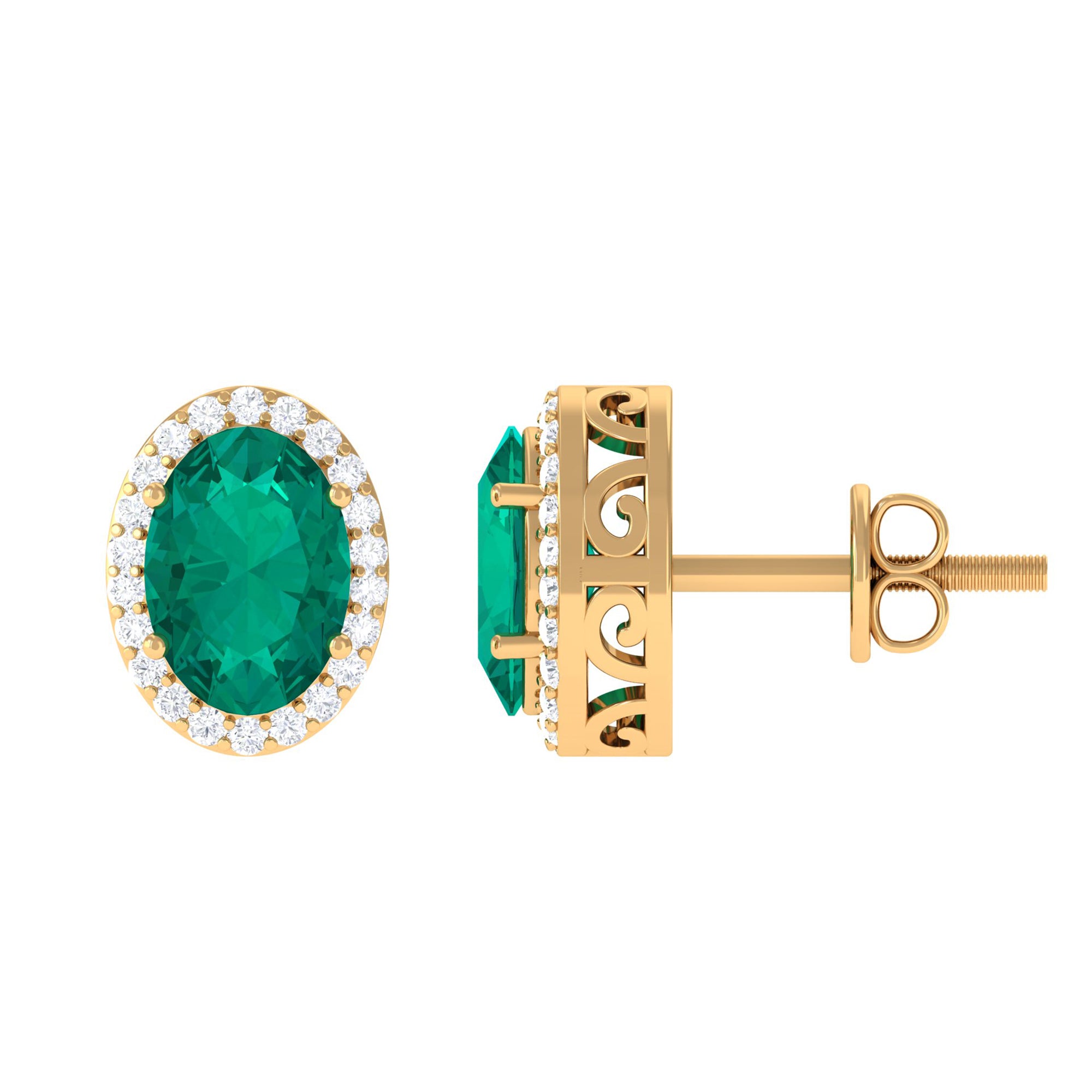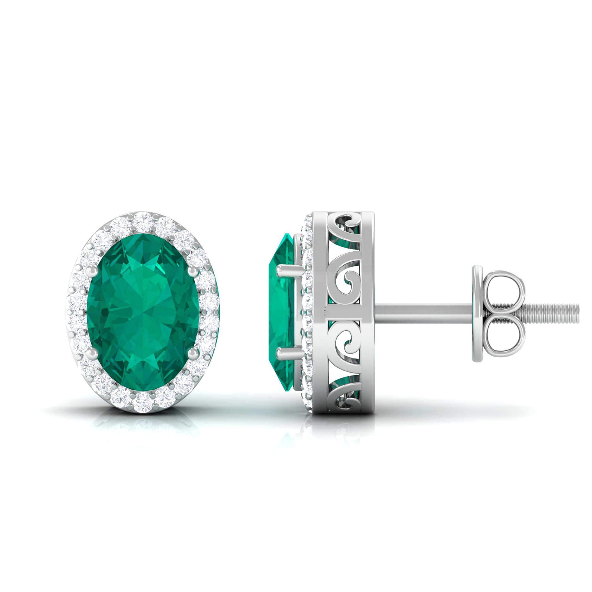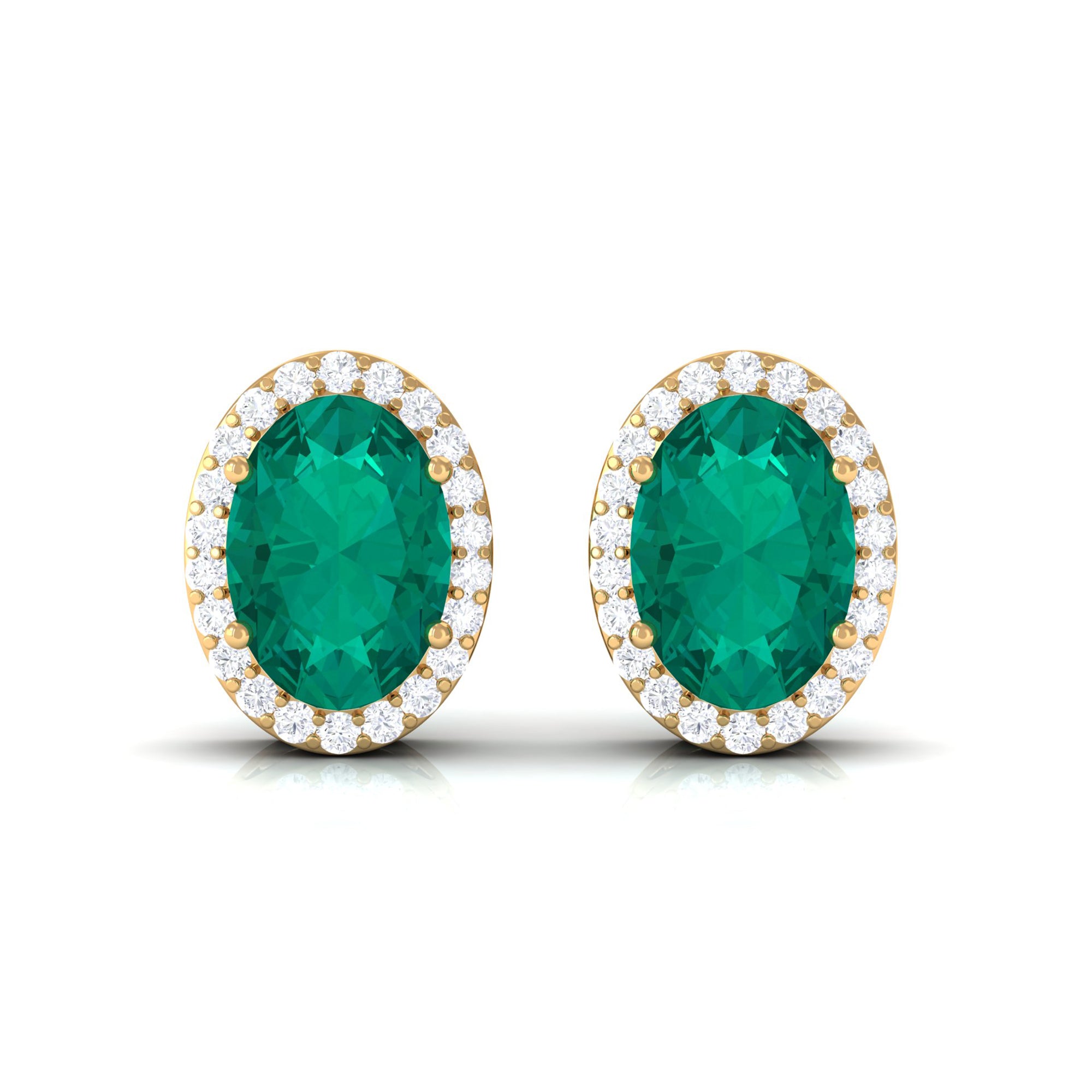 Adorn yourself in these Stud Earrings featuring Oval Cut Emerald Solitaire adorned by a Round Brilliant Diamond Halo adding to the look of these Halo Stud Earrings.