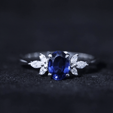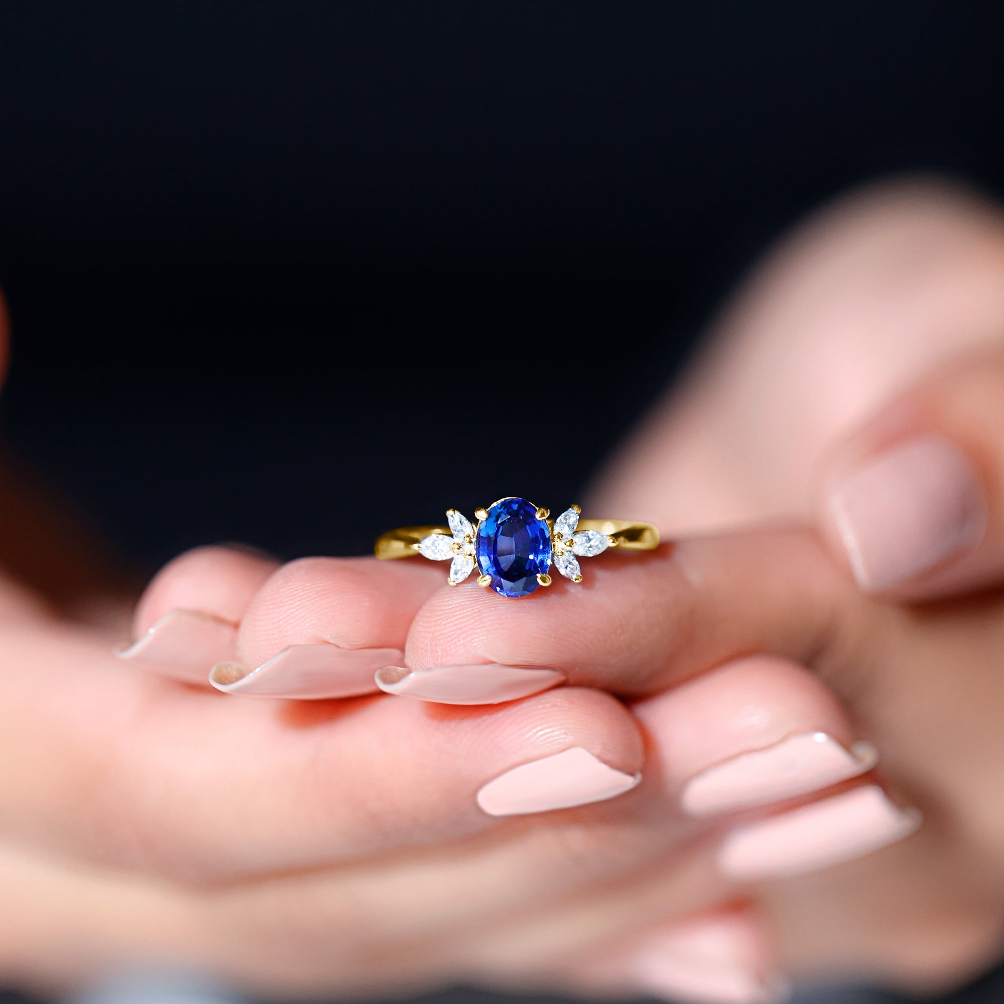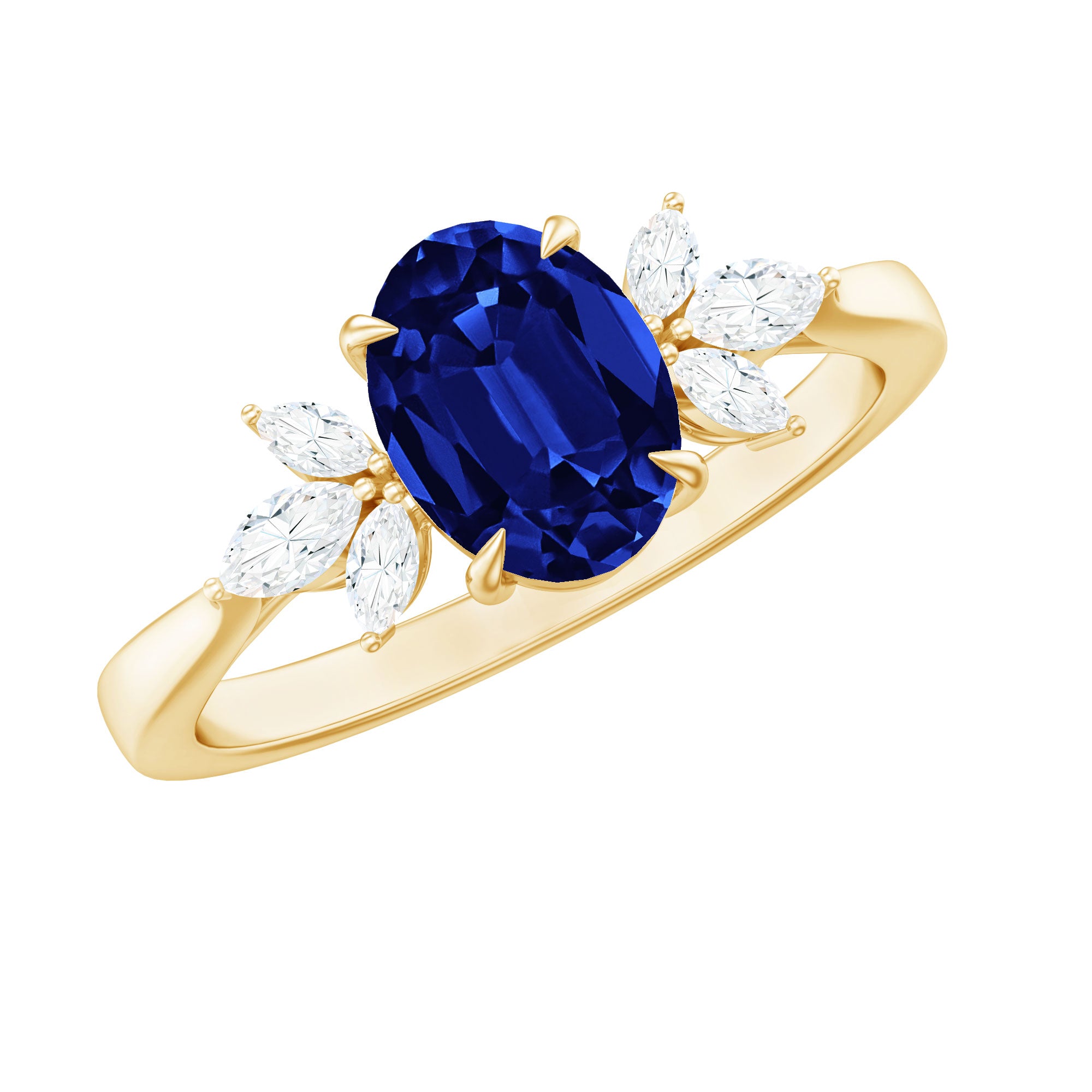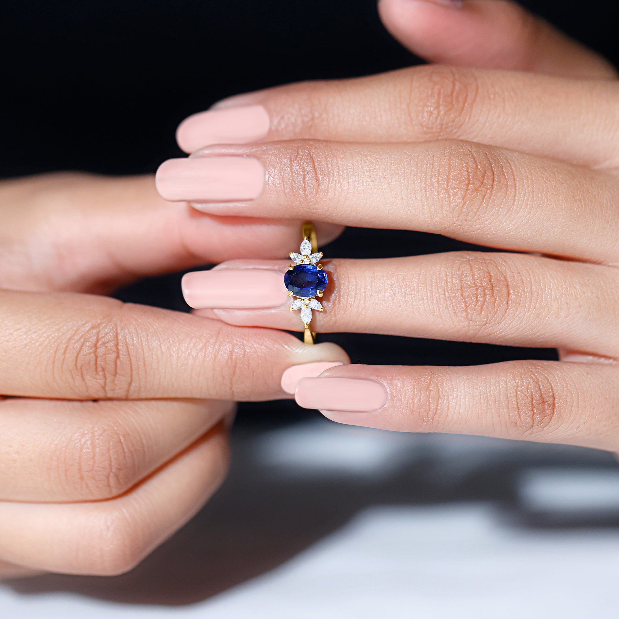 This stunning Solitaire Ring showcases a dazzling Oval Cut Created Blue Sapphire as the centerpiece, with Marquise Shape Diamond in a unique petal design on the sides. Made with Solid Gold, this ring is the perfect choice for proposing to your loved one. A true eye-catching piece that will capture their heart.