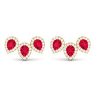 Modern and unique these 3 Stone Earrings embellished with Pear Cut Created Ruby accentuated by Diamond Halo will set you apart from the crowd.
